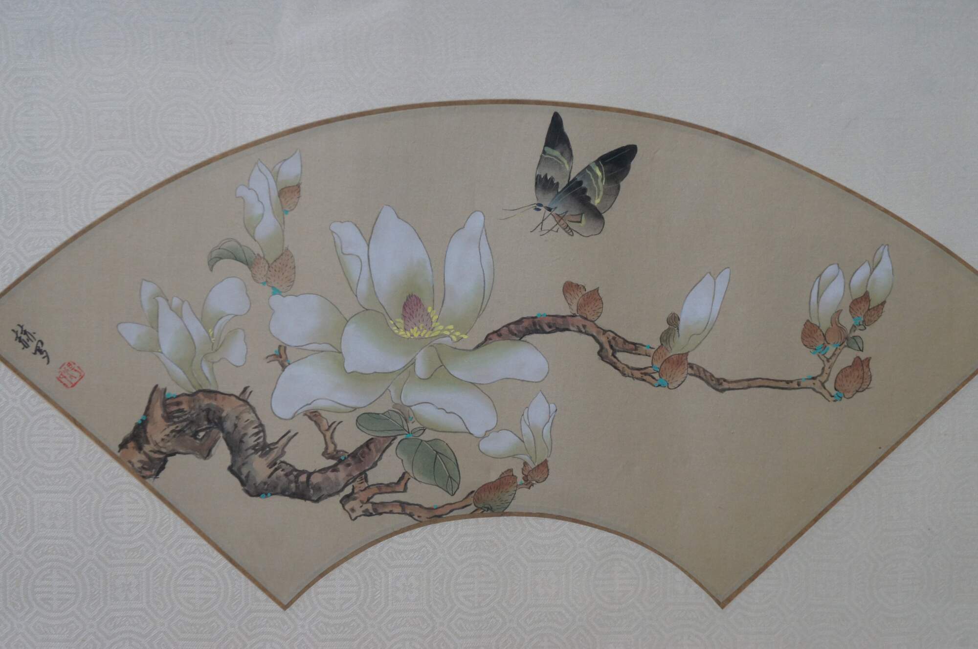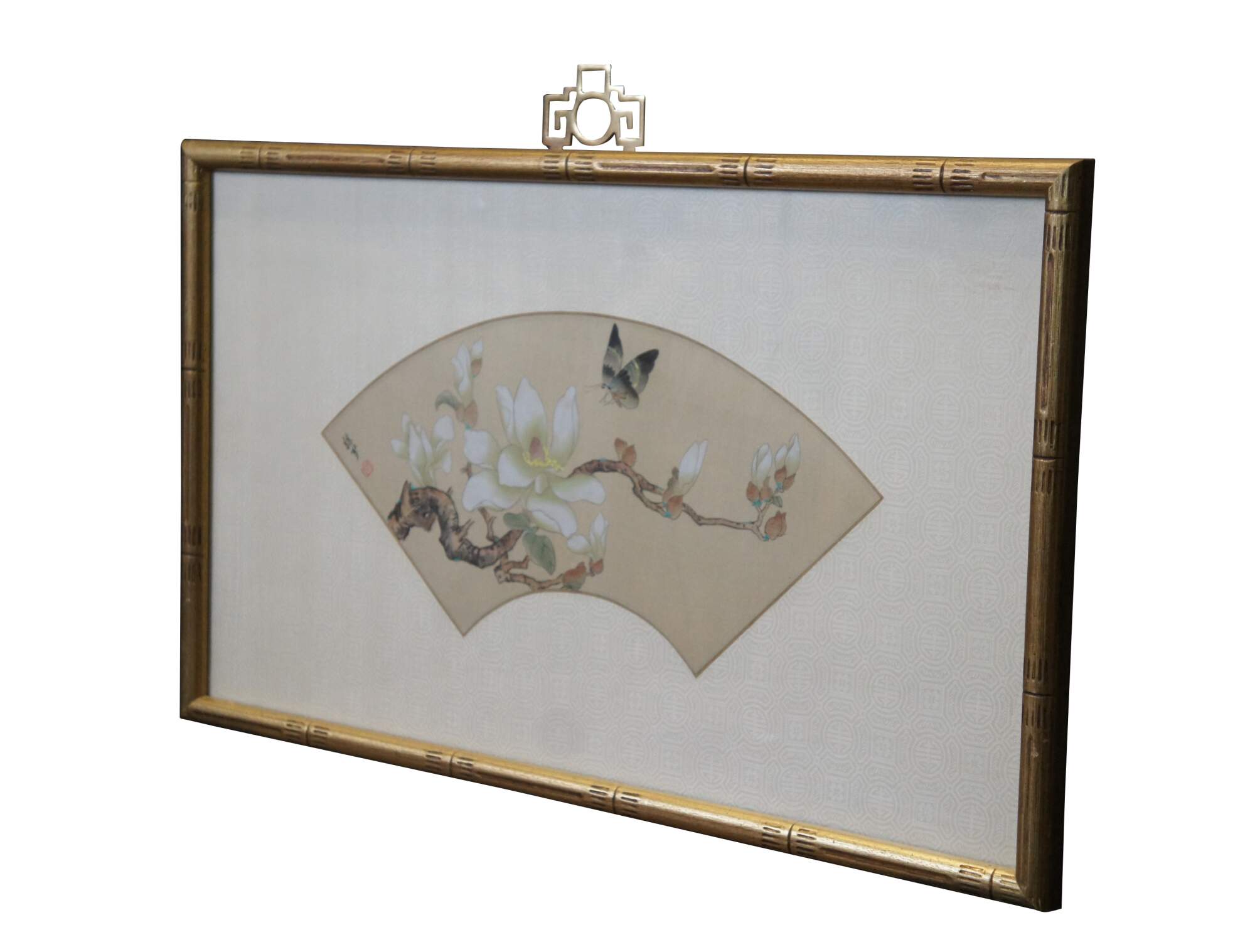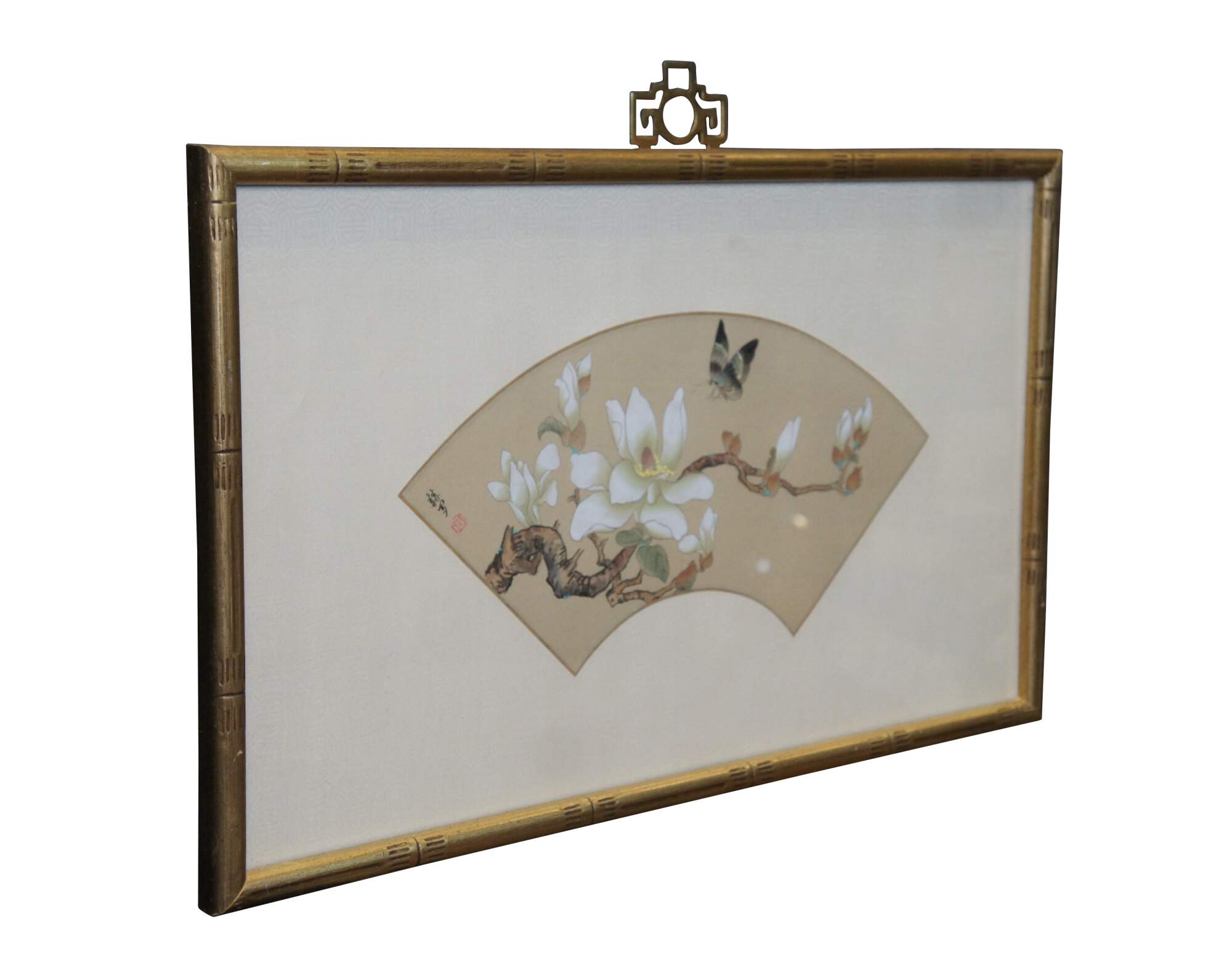 20th century framed Chinese fan silk, with a painted design of a butterfly above a flower blossom on a branch. Signed / seal at upper left corner. Faux bamboo giltwood frame with brass hanger; white patterned silk mat.