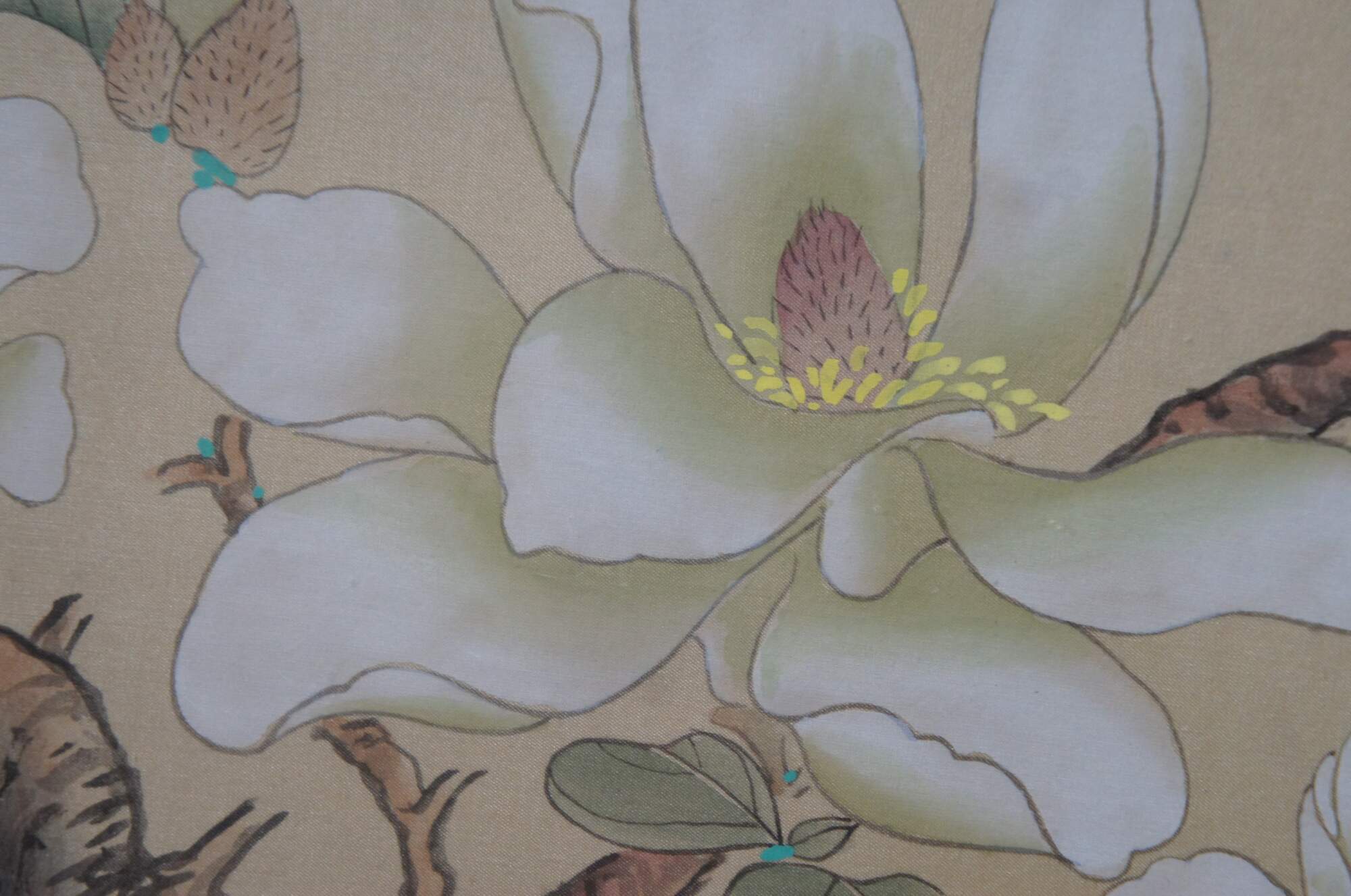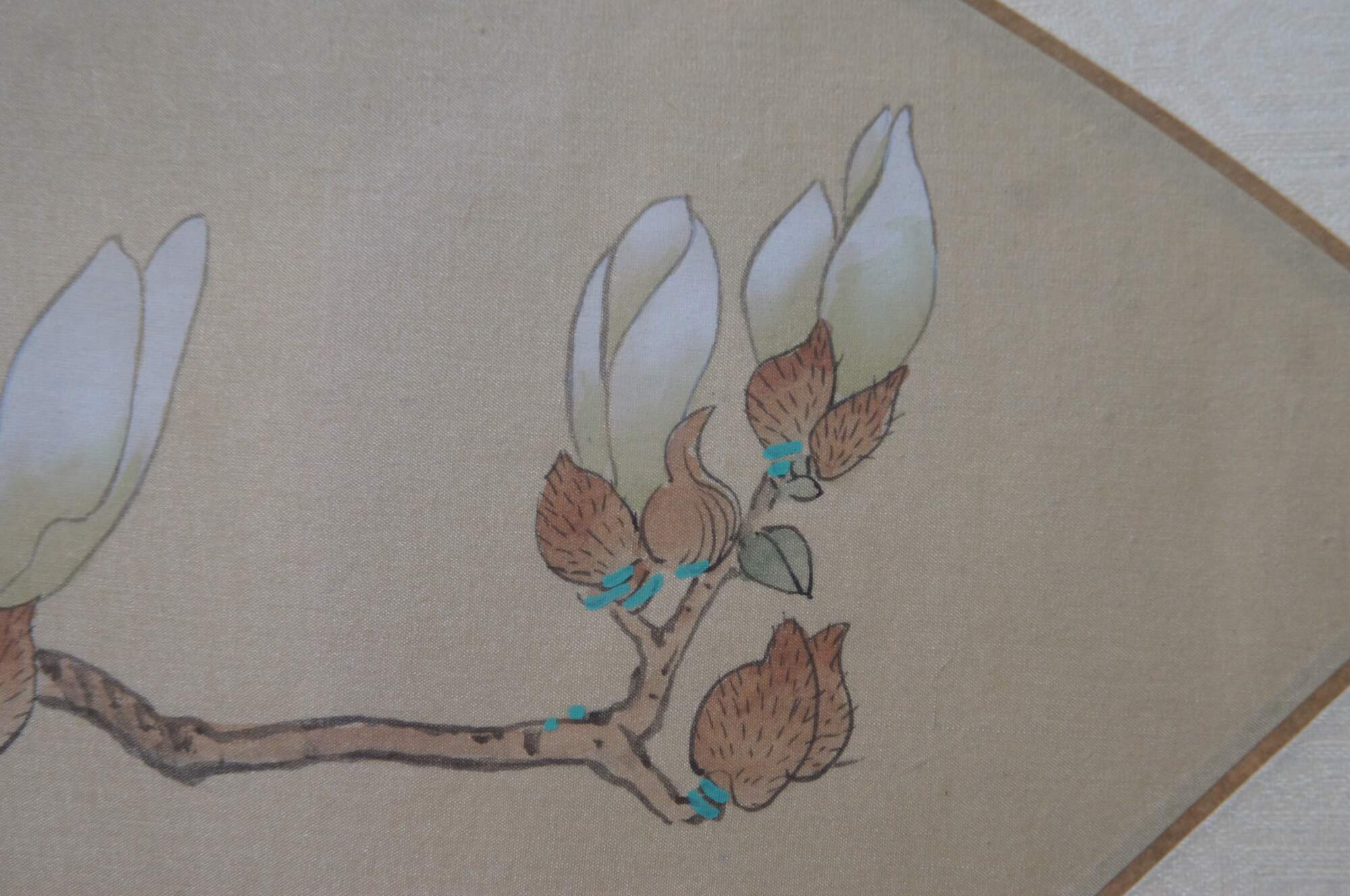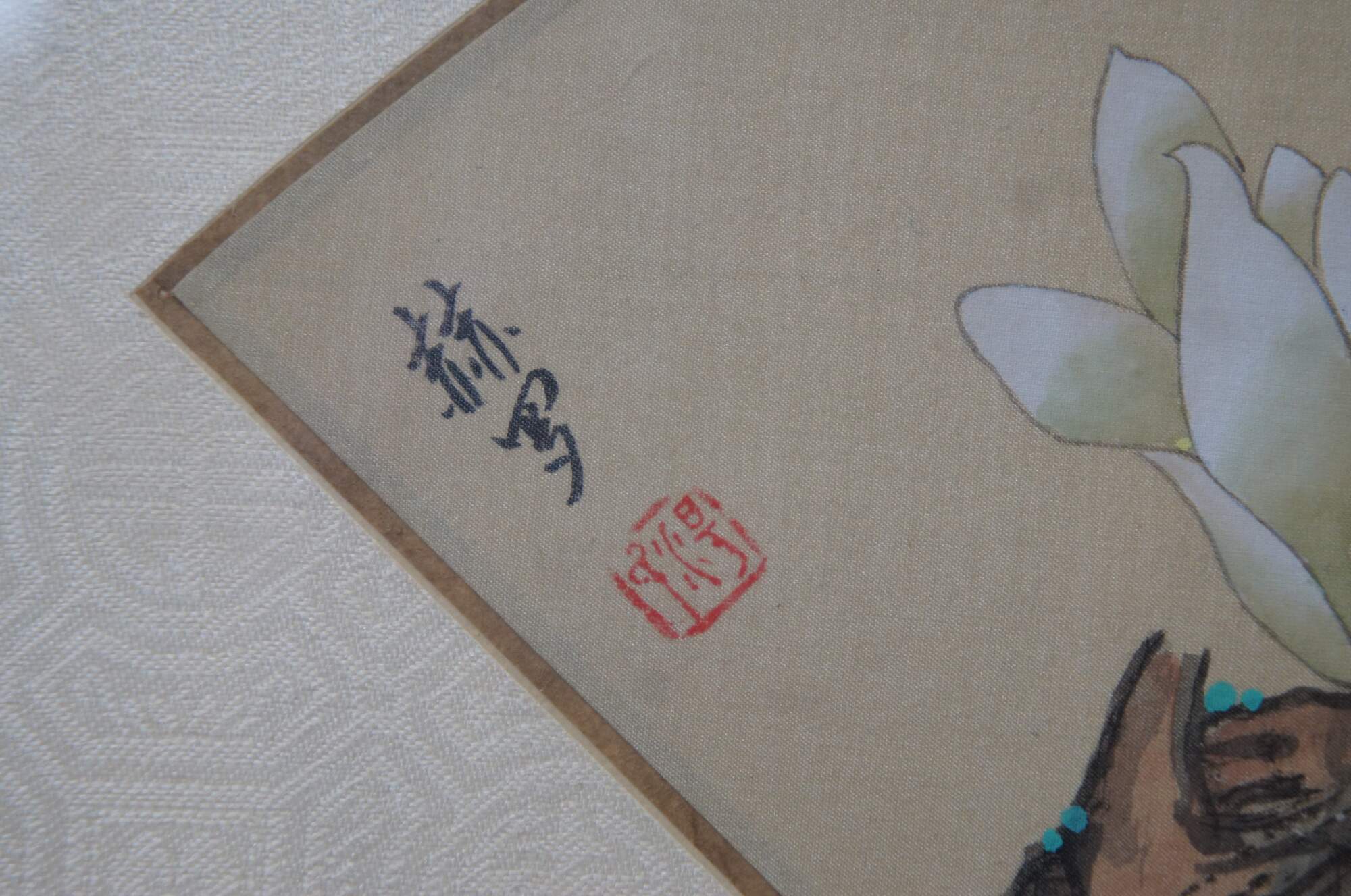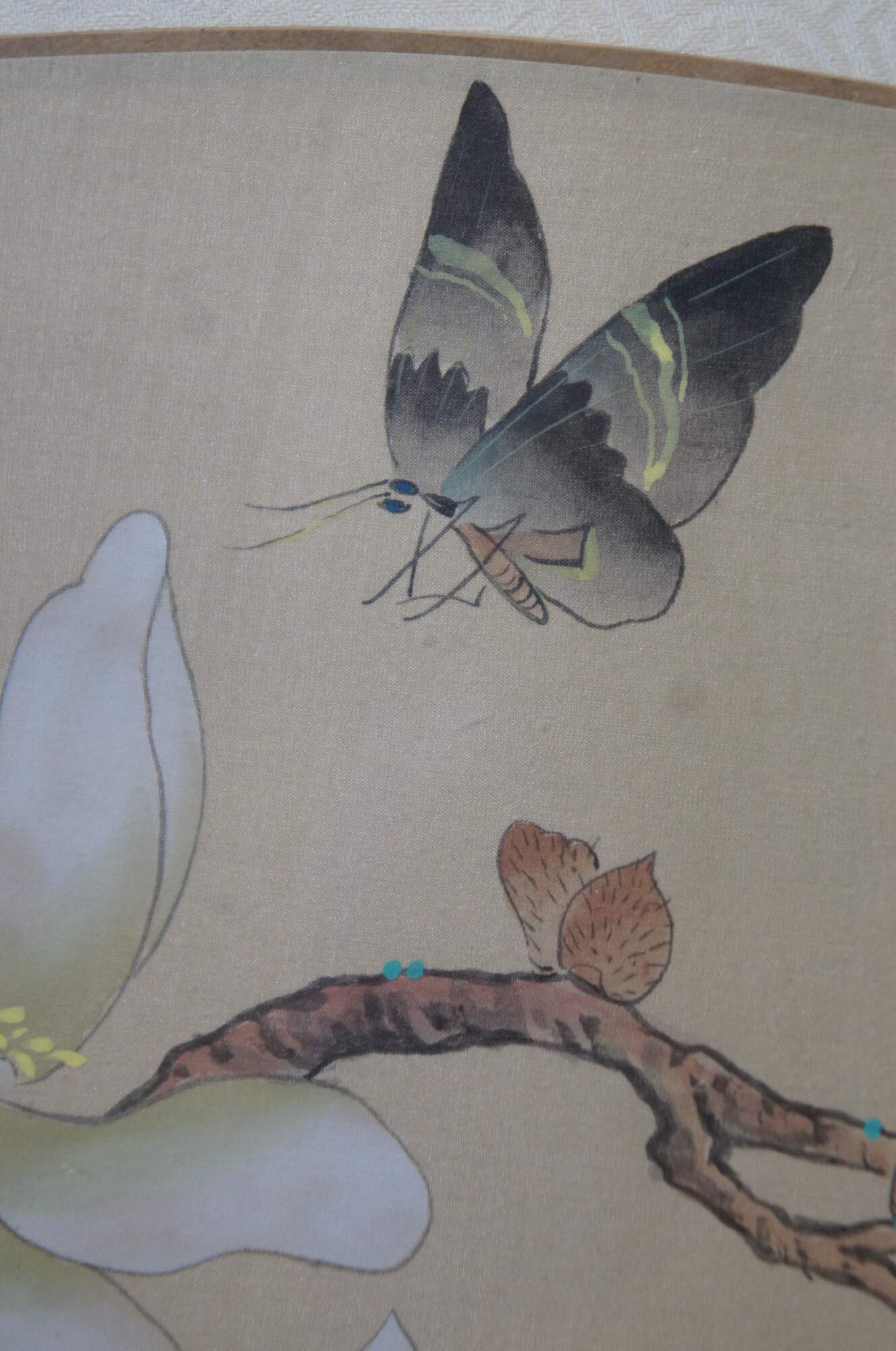 20th century framed Chinese fan silk, with a painted design of a butterfly above a flower blossom on a branch. Signed / seal at upper left corner. Faux bamboo giltwood frame with brass hanger; white patterned silk mat.