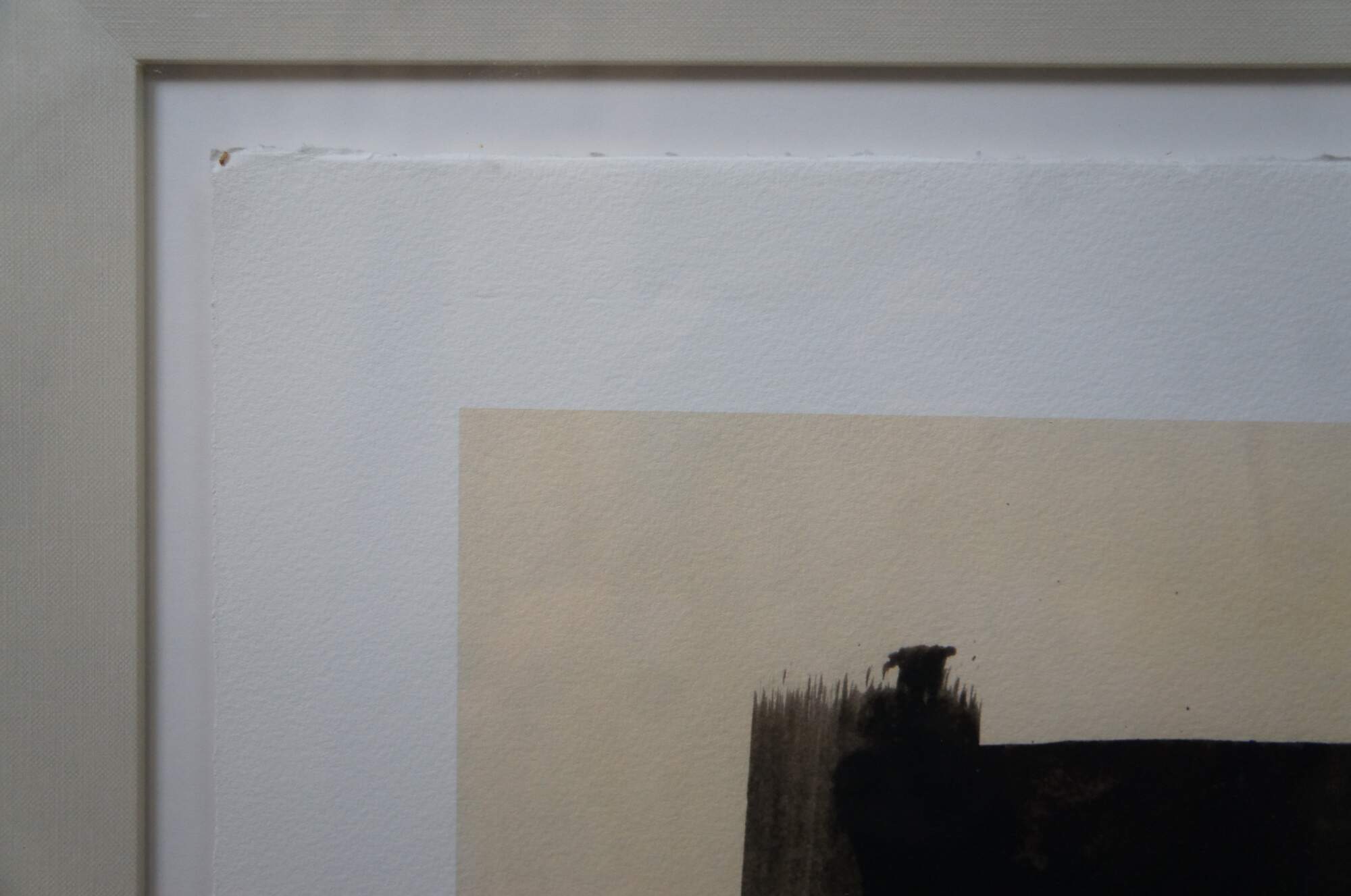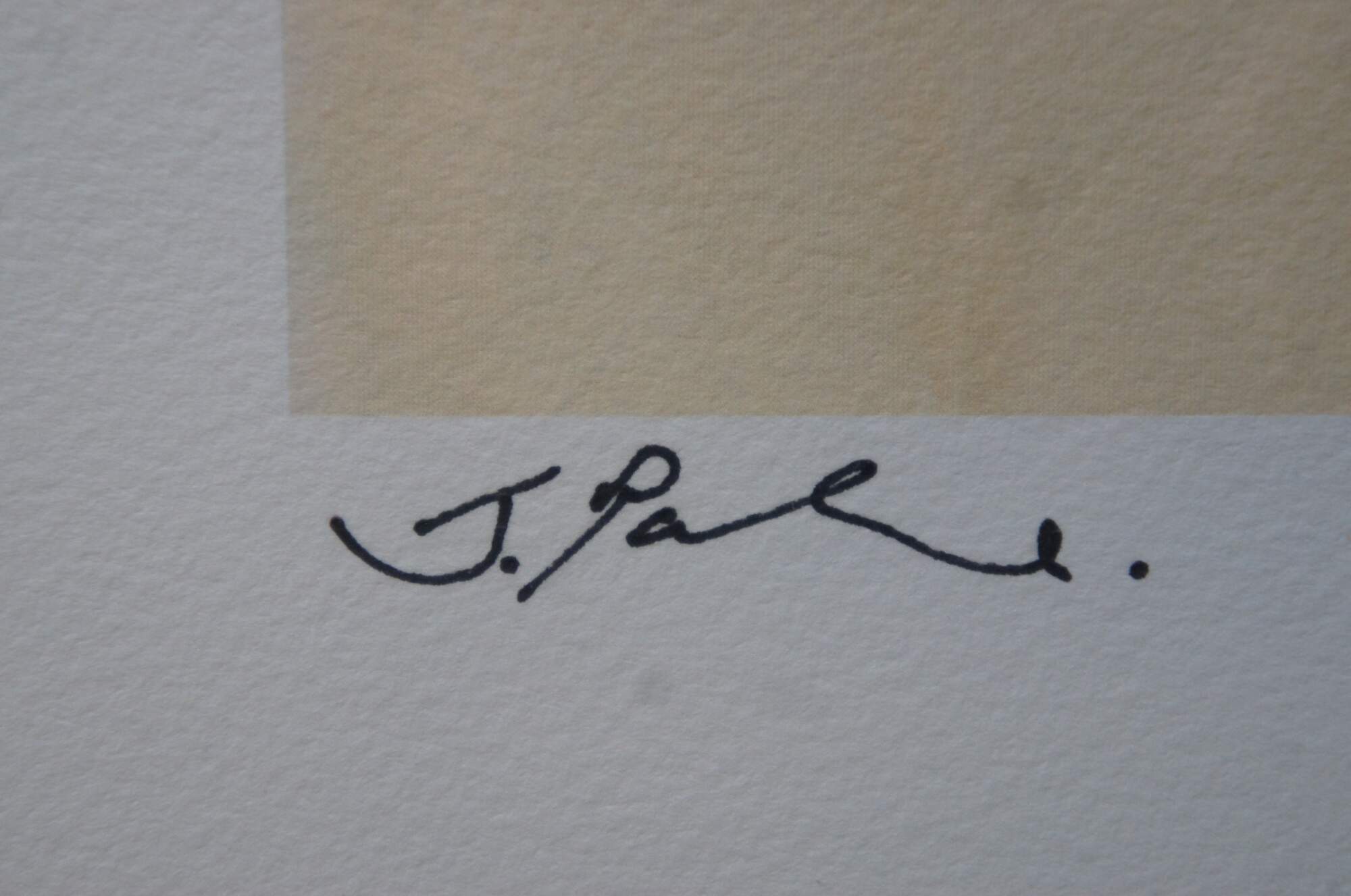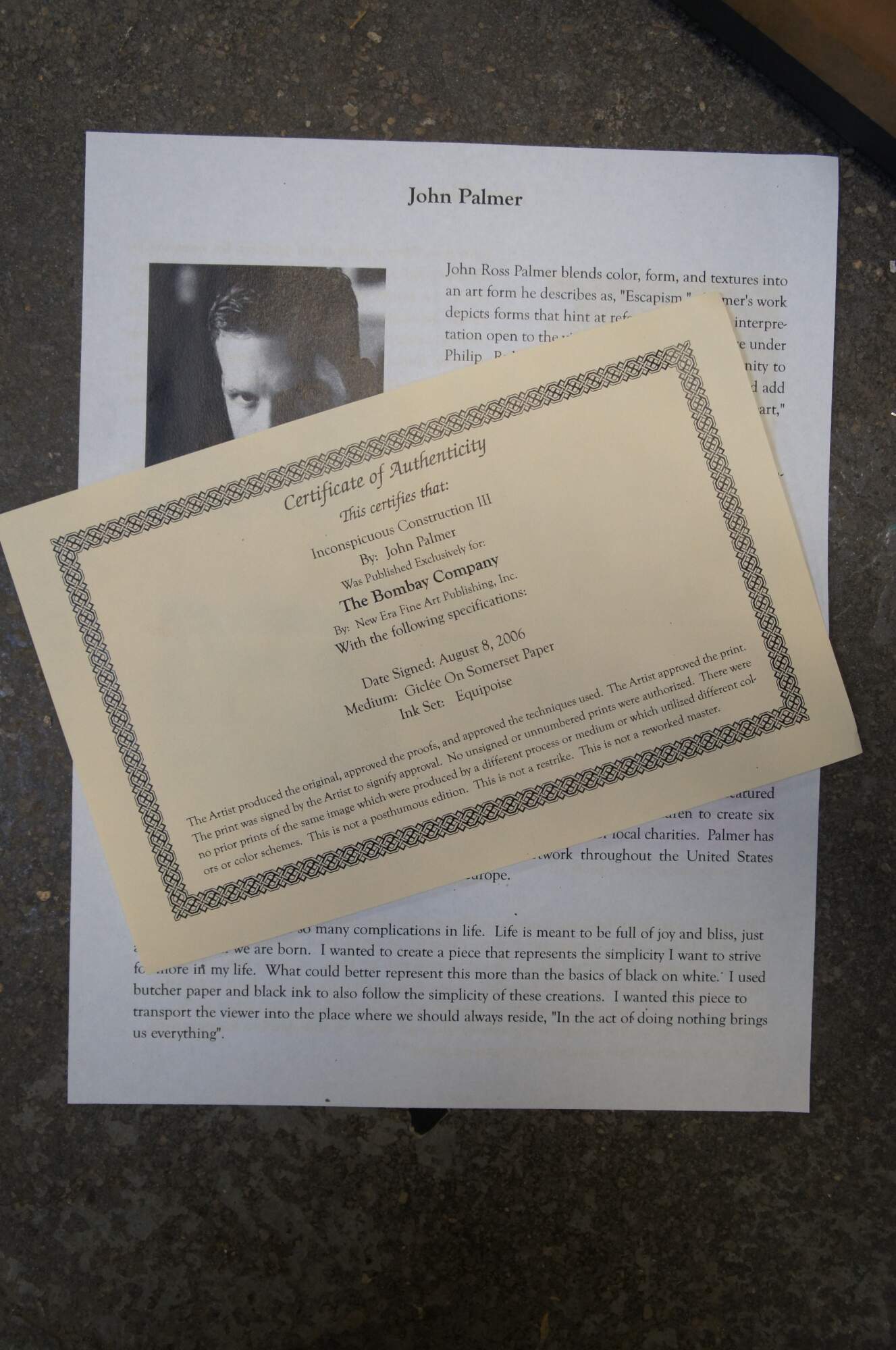 2006 giclee on Somerset paper print titled "Inconspicuous Construction III" by John Palmer, published for the Bombay Company by New Era Fine Art Publishing, Inc. Signed at lower left corner. Black wood frame; off white mat. Includes Certificate of Authenticity and Artist Statement.