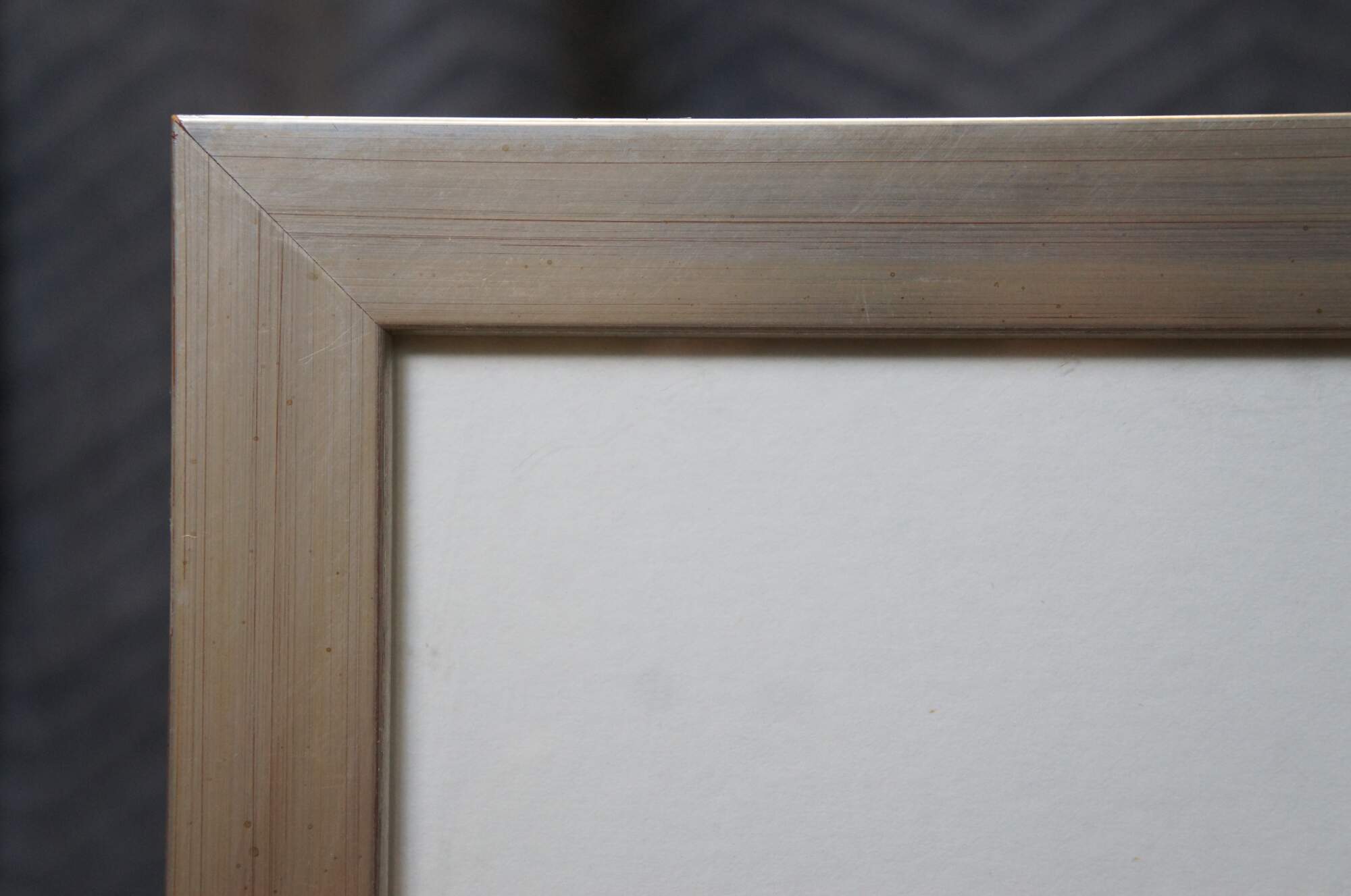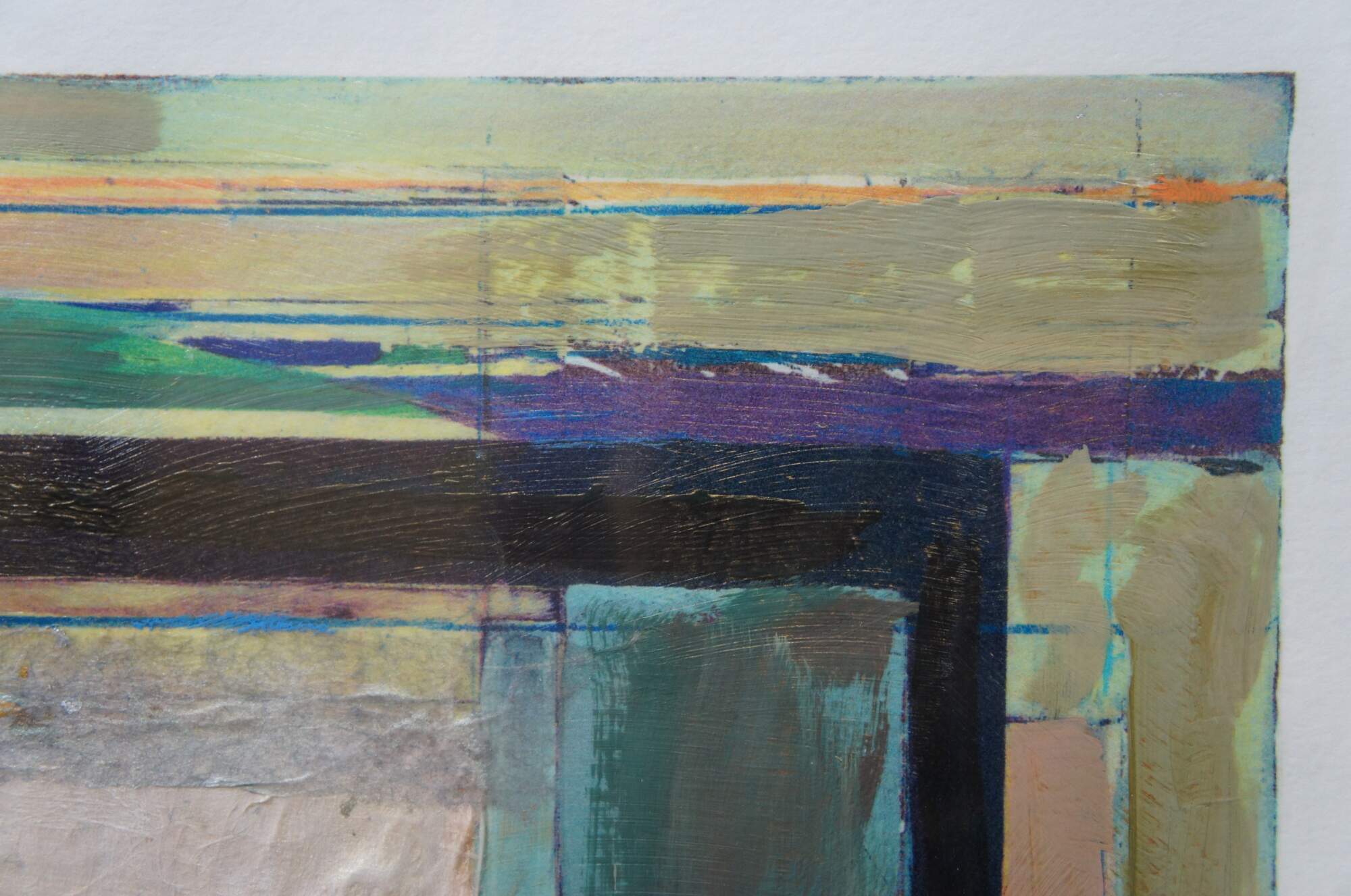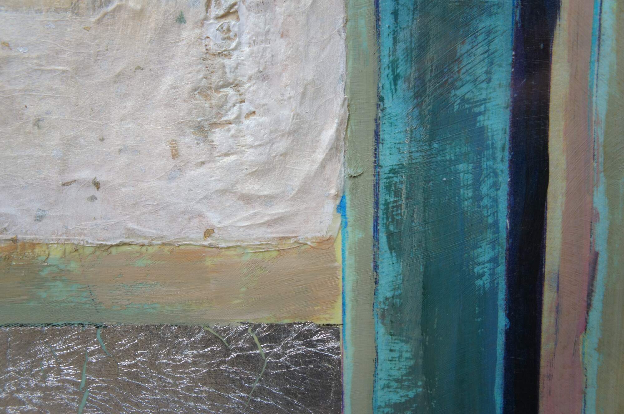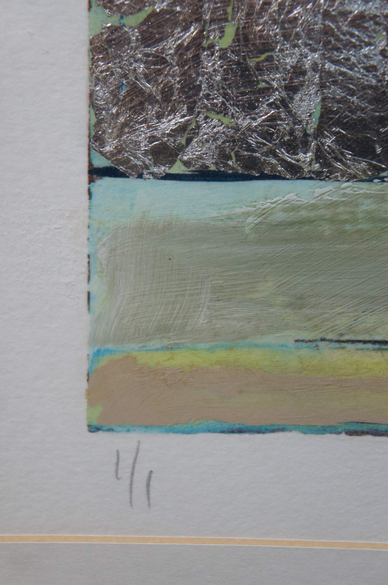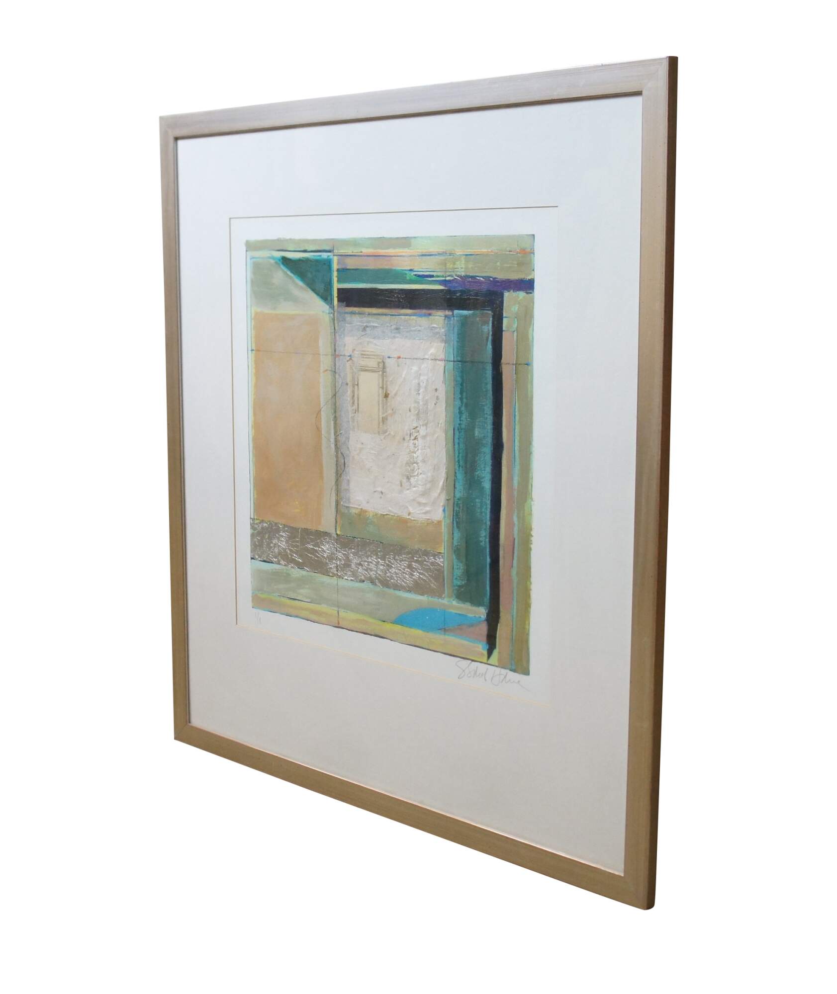 Late 20th century original modern mixed media wall art by Starlie Sokol Hohne. An abstract combination of printmaking, paint, and paper overlapping in swaths of blues, greens, and beige, with textured metallic paper and white tissue centered on an architectural doorway. Pencil signed and numbered 1/1 along lower edge. Champagne gilt wood frame; white and beige layered mat.