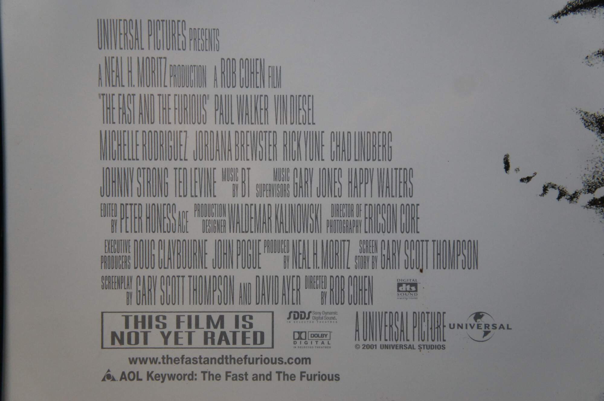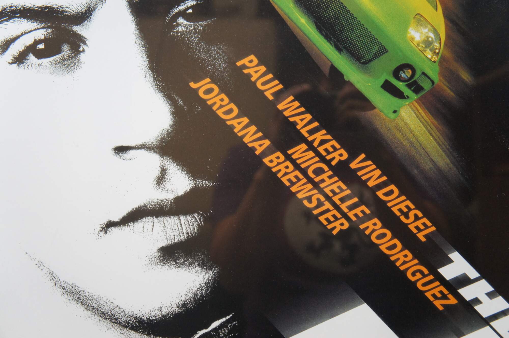 27" x 40" movie poster for the original 2001 "The Fast and the Furios" starring Paul Walker, Vin Diesel, Michelle Rodriguez, and Jordana Brewster. Rounded black metal frame.