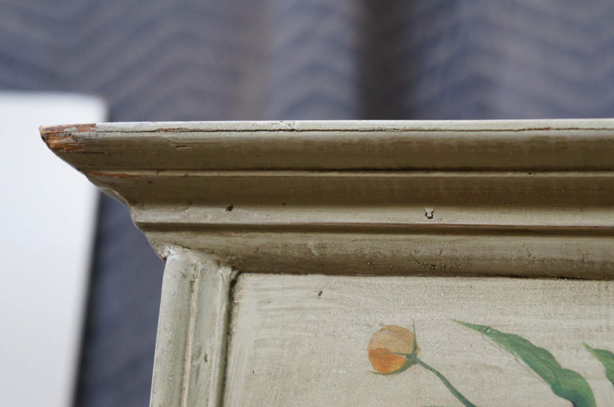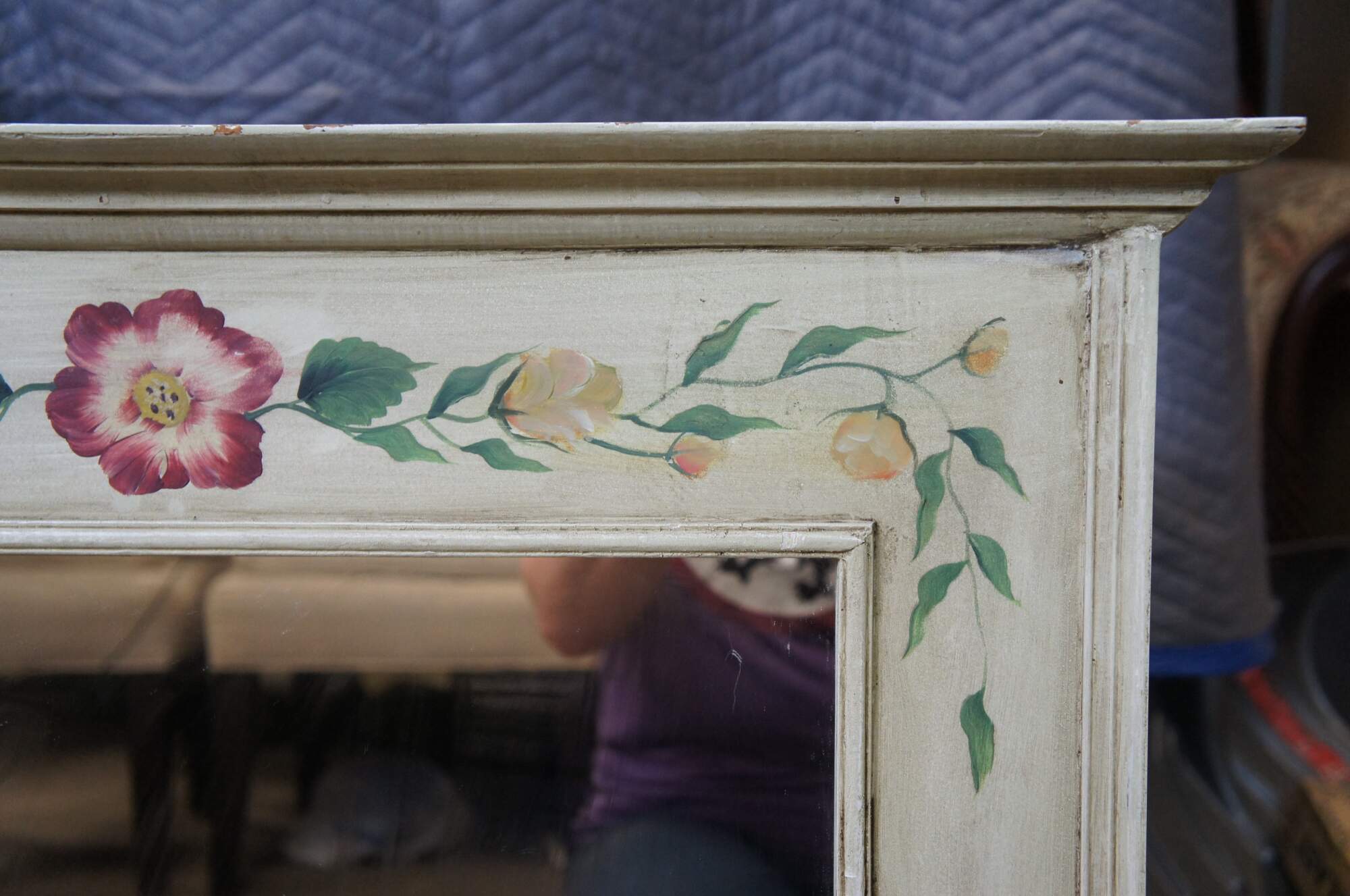 Late 20th century folk art style wall mirror featuring a French country inspired distressed white finish and hand p[ainted flowering vines. Rectangular form with beveled edges and pediment.