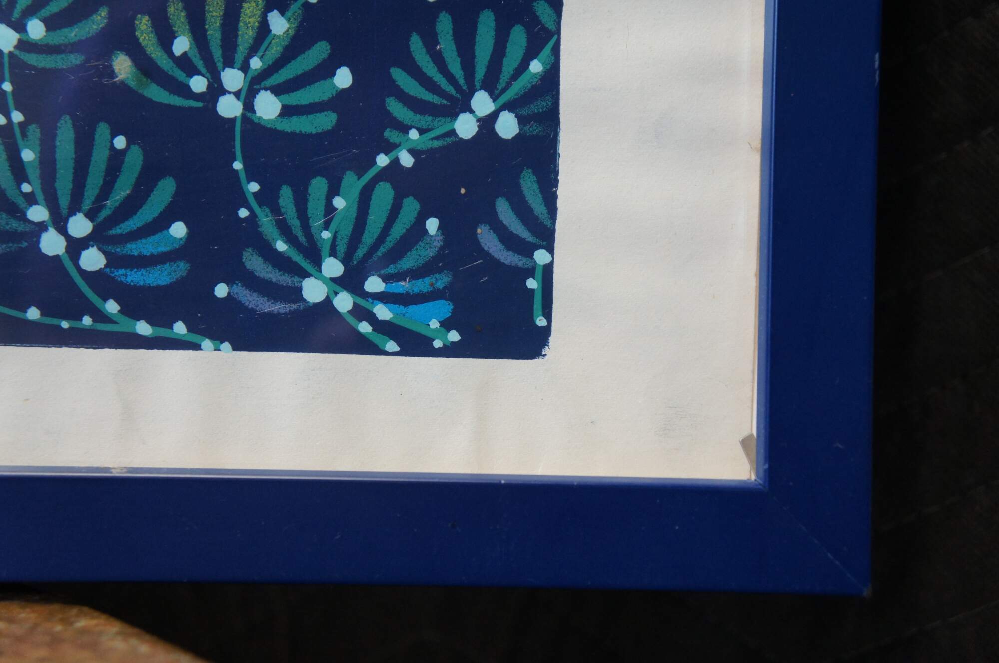 A beautiful late 20th century Chinese Chinoiserie print depicting a spiraling school of koi fish chasing a worm through a weed filled pond. Signed/seal at left side. Blue painted wood frame.