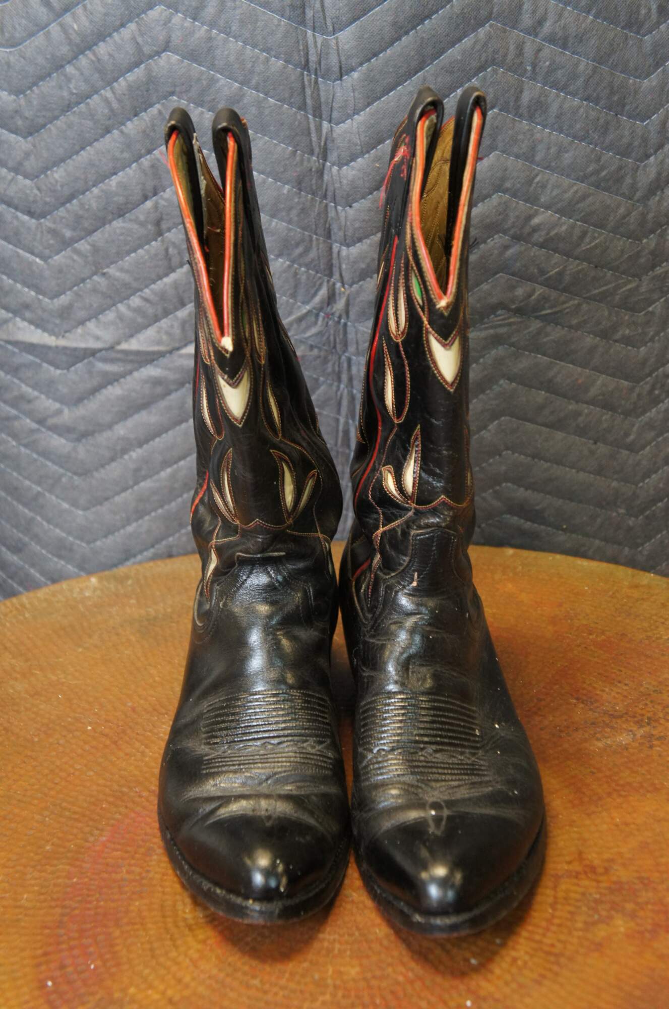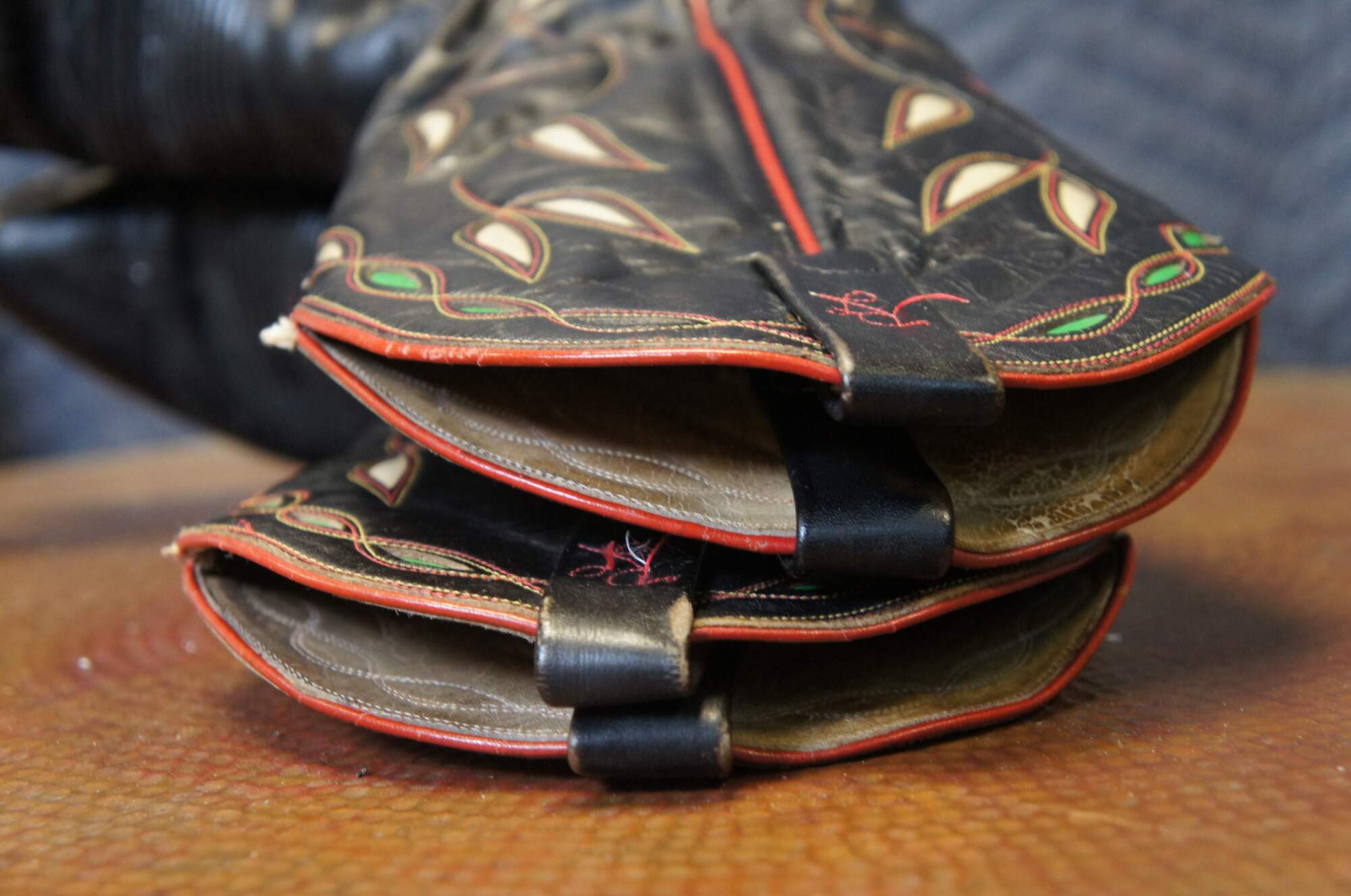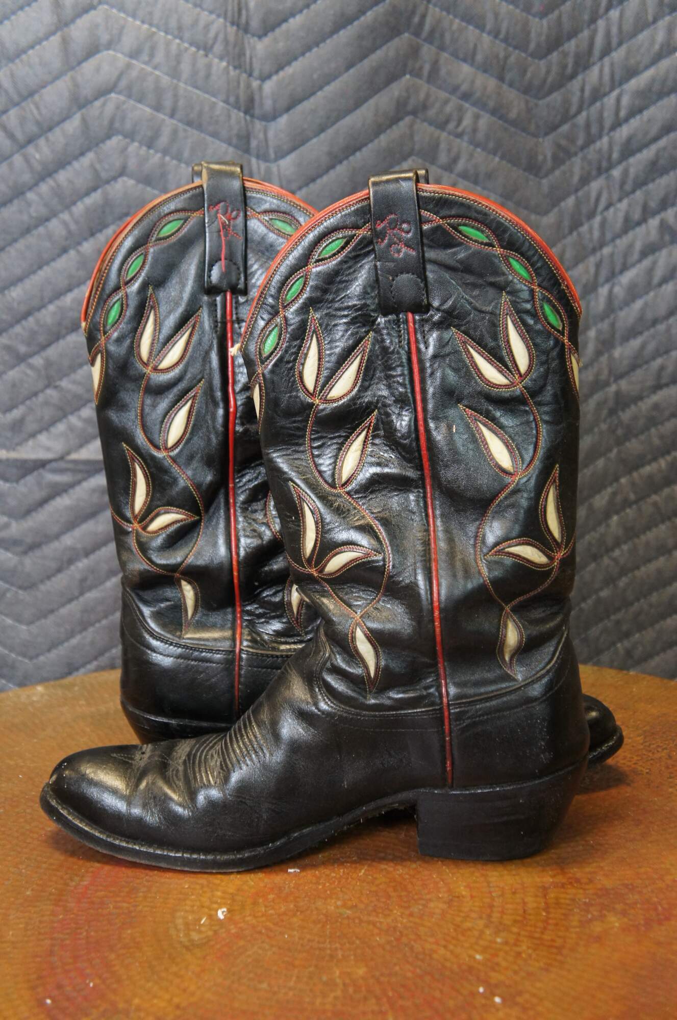Late 20th century vintage Ralph Lauren Polo cowboy boots. Black leather with red accent, decorated with green and off-white vine / leaf patterns. Cat's Paw Neoprene heel cap. Printing on tag is worn away - length of sole from toe to heel approximately 12 inches.