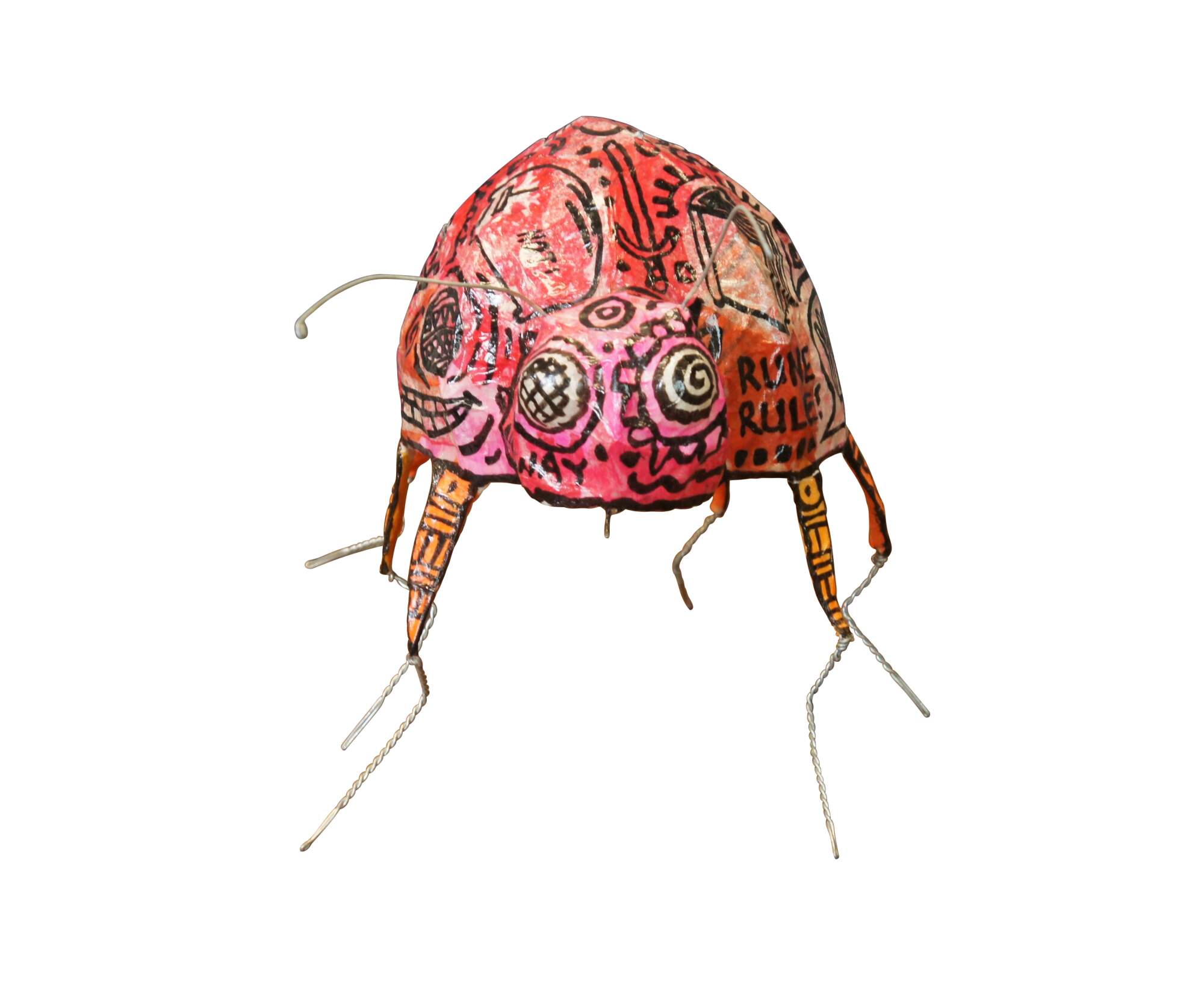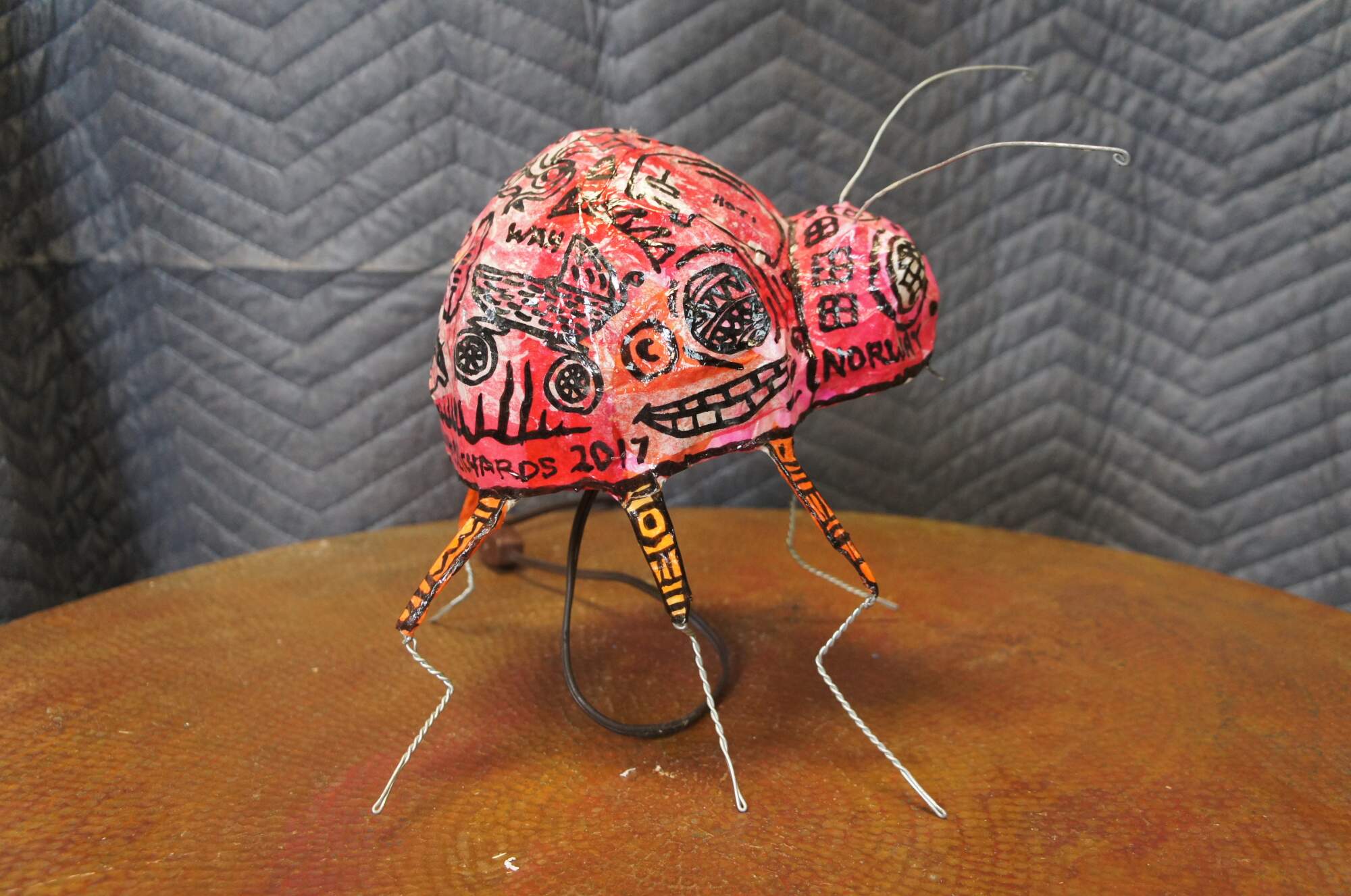 Rare vintage mixed media art nightlight in the shape of a pink and orange round backed bug covered in graffiti, crafted by John Richards of the Yummy Mud Puddle Gallery, Burnsville, North Carolina. Vinylized paper on wire frame. Signed and dated John Richards 2017 along one side of shell.