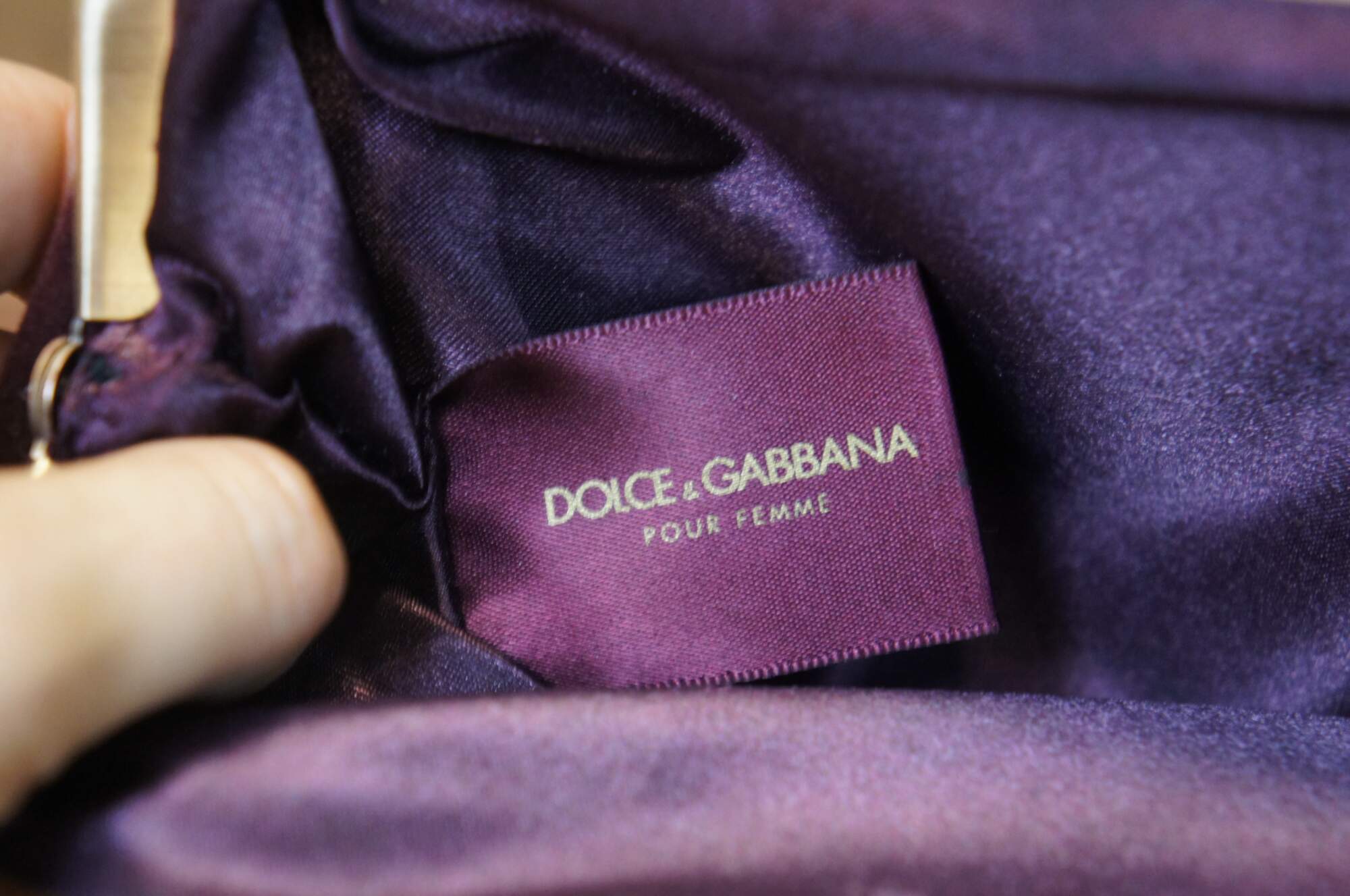 Late 20th century Dolce & Gabbana Pour Femme burgundy velvet clutch purse with eggplant purple satin interior and brass kiss lock clasp.