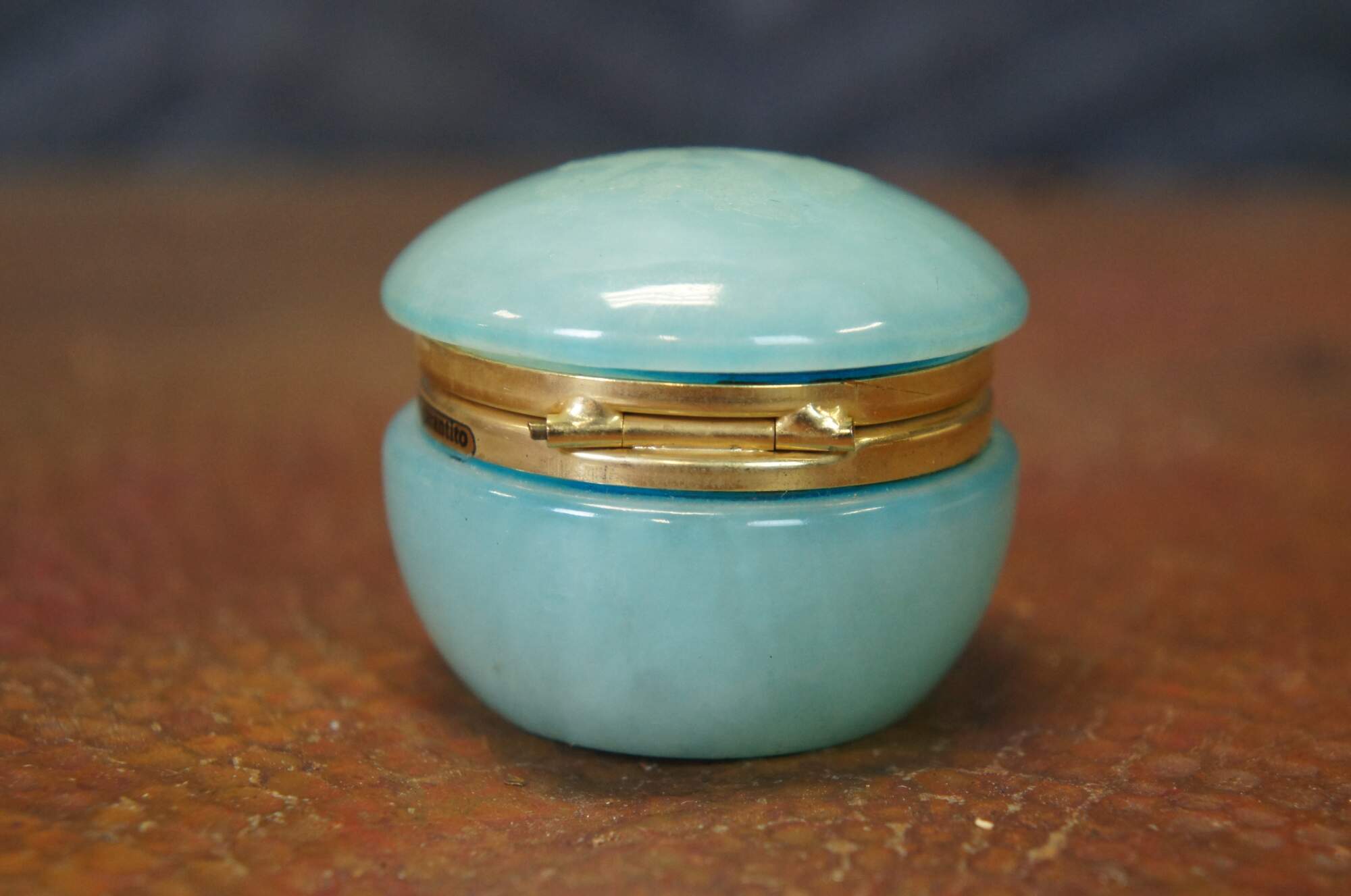 Mid to late 20th century small round trinket / keepsake / pill box carved of pale green / blue alabaster with brass rim. Marked ABF - Genuine Alabaster - Made in Italy and G.S.E. ottone garantito (Guaranteed Brass).