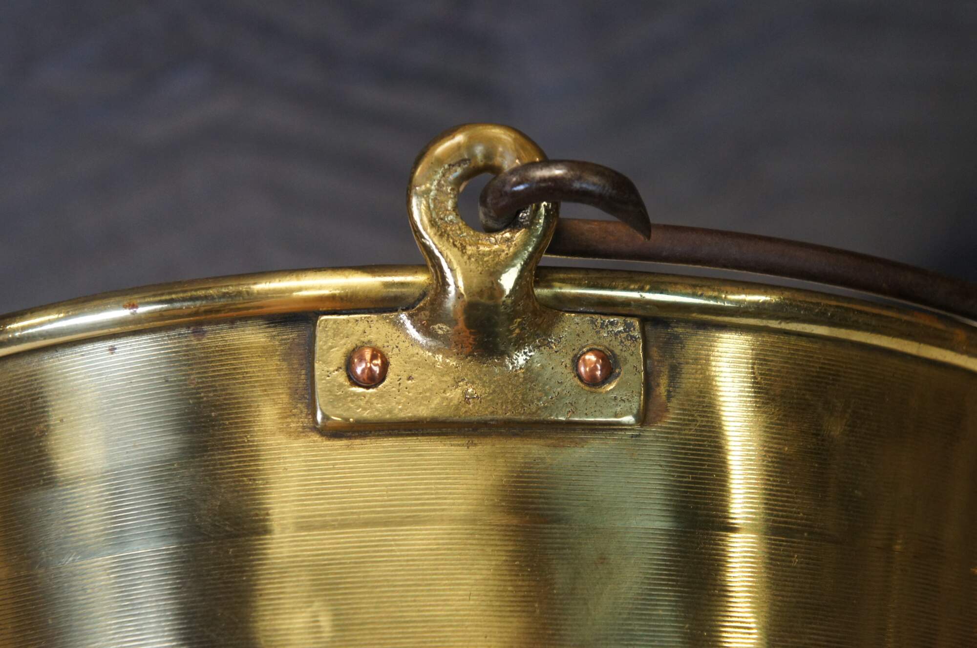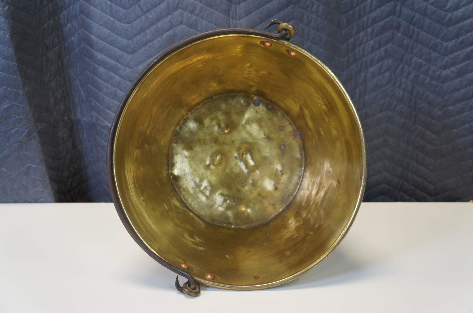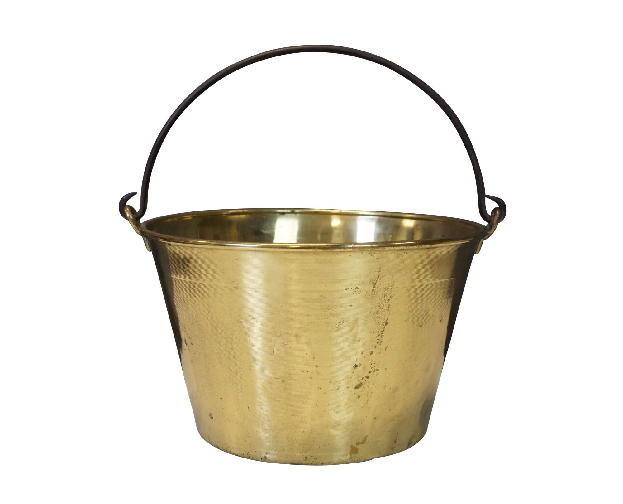 Early to mid 20th century #4 spun brass bucket / bopiler by the American Brass Kettle Manufacturers. Round form with slightly tapered base and iron rat tail bail handle. Marked on base.