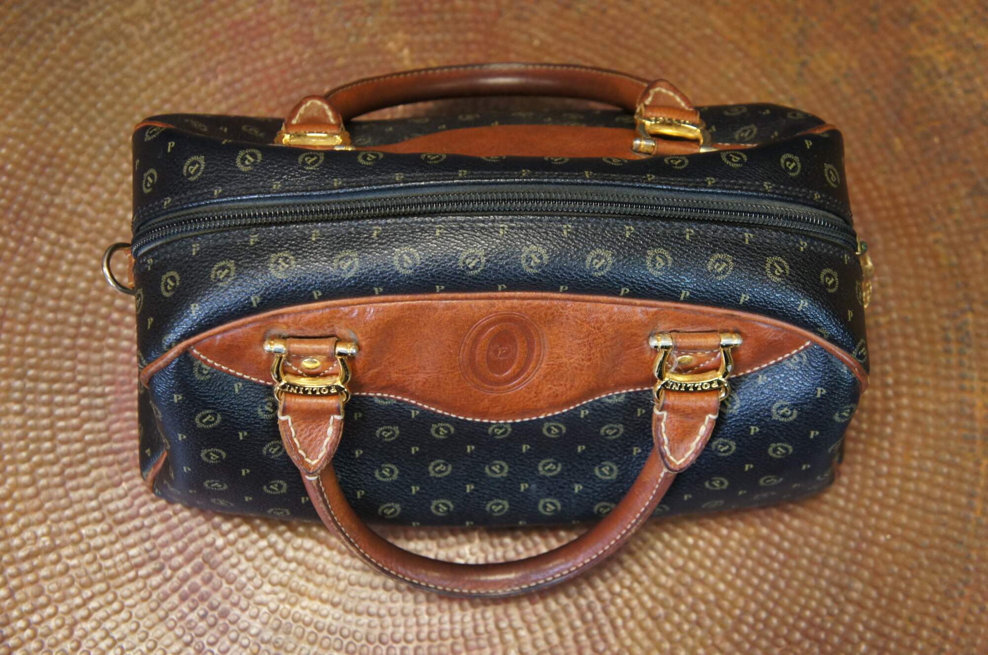 Pollini doctor's bag style handbag / purse. Black monogram leather with brown leather trim / accents. Double handles; gold tone hardware. Double pull zipper closure. Black lining. One interior zipper pocket. Number 47024957. Made in Italy.