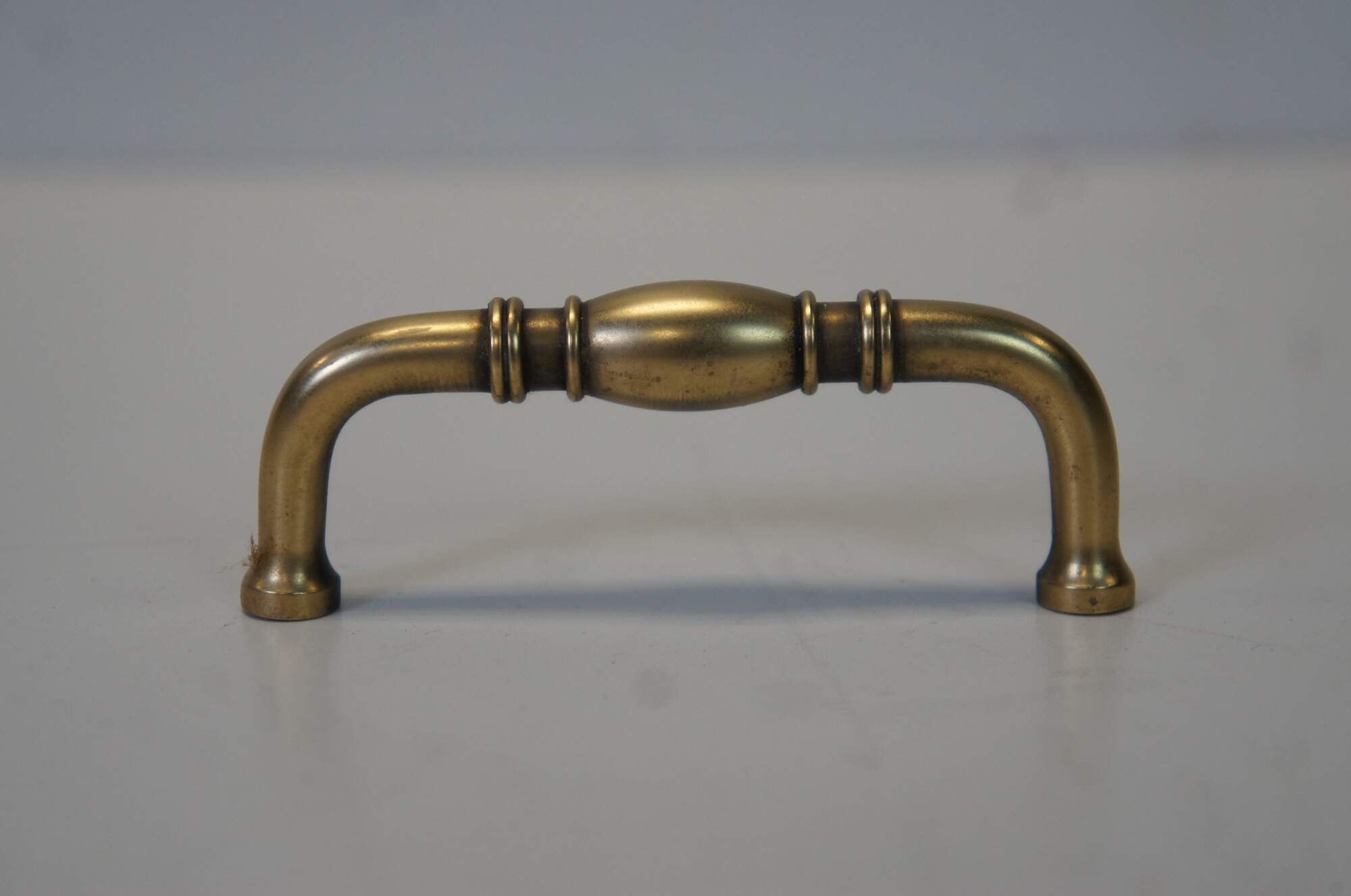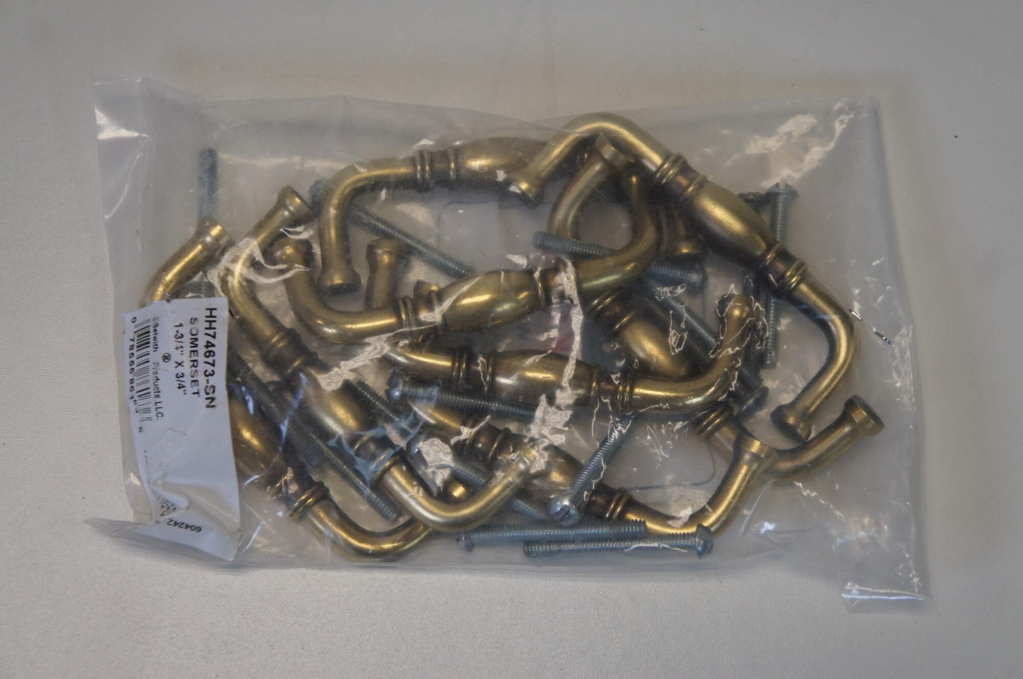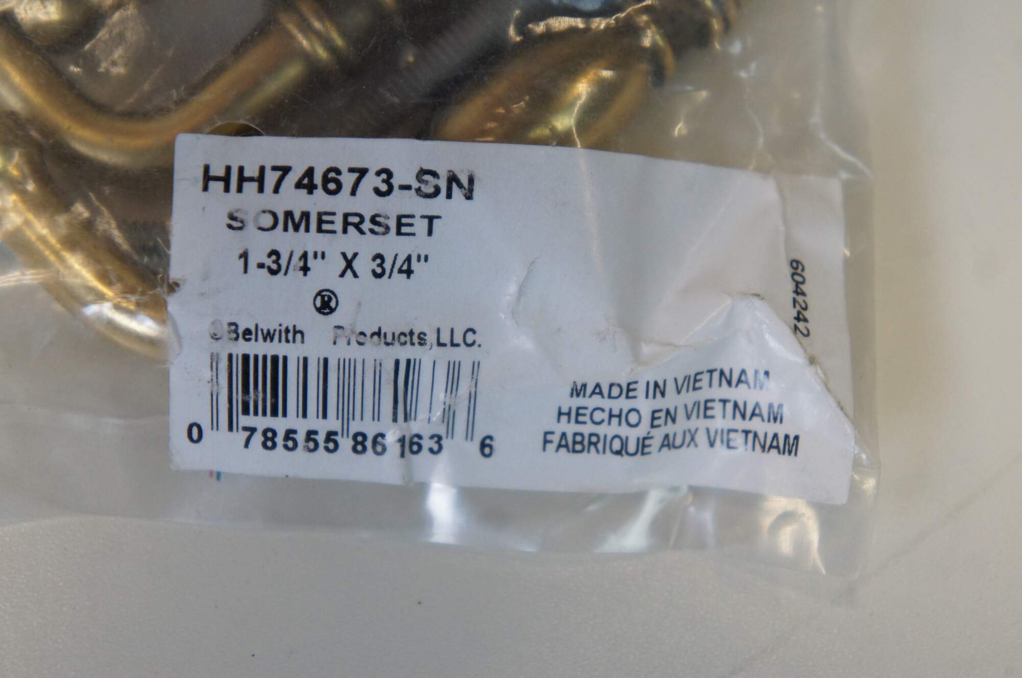 Late 20th century package of eight Hickory Hardware Somerset brass drawer / cabinet pulls. Item number HH74673-SN - 1-3/4" x 3/4". Produced by Belwith Products LLC. Made in Vietnam.