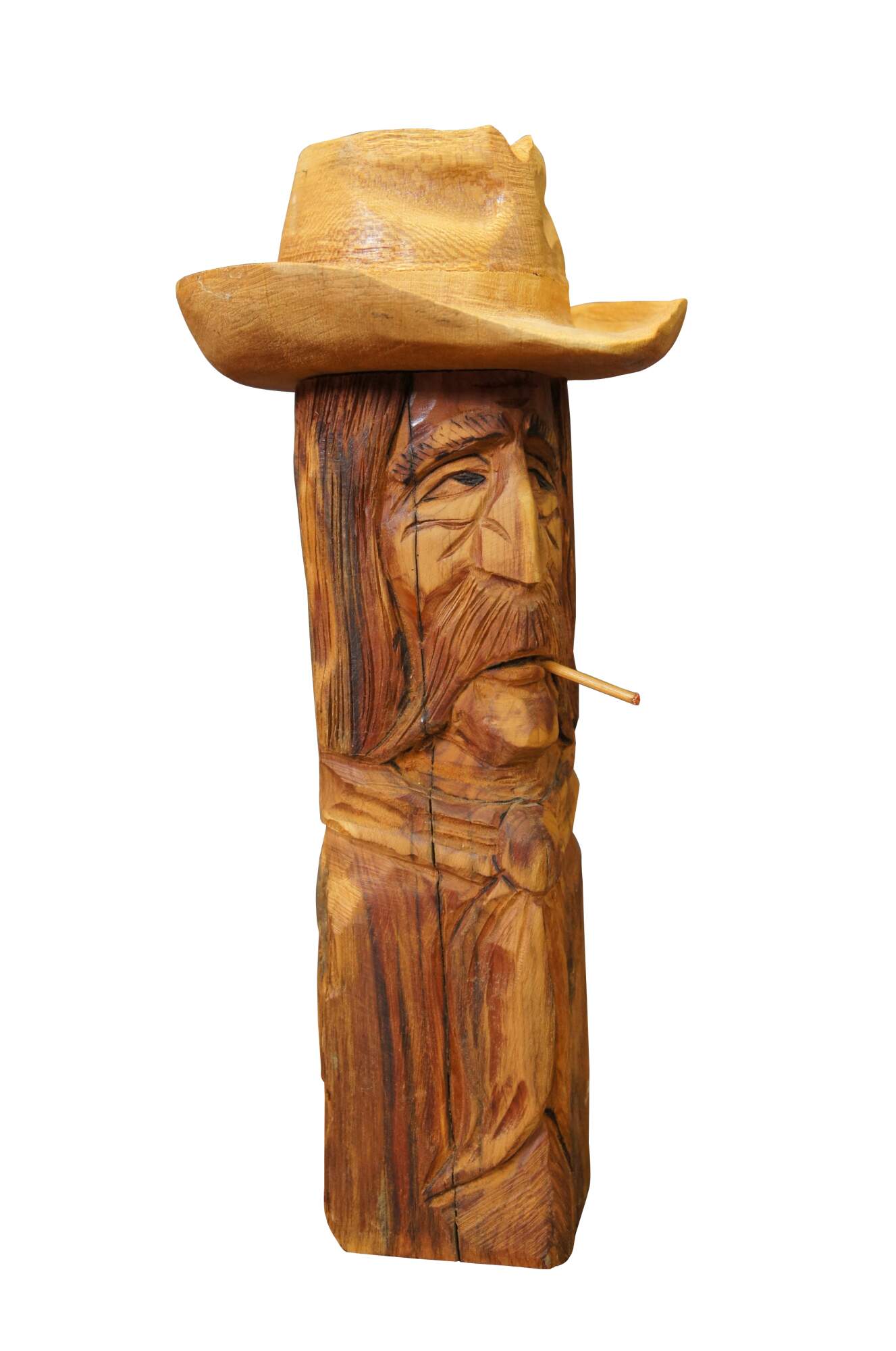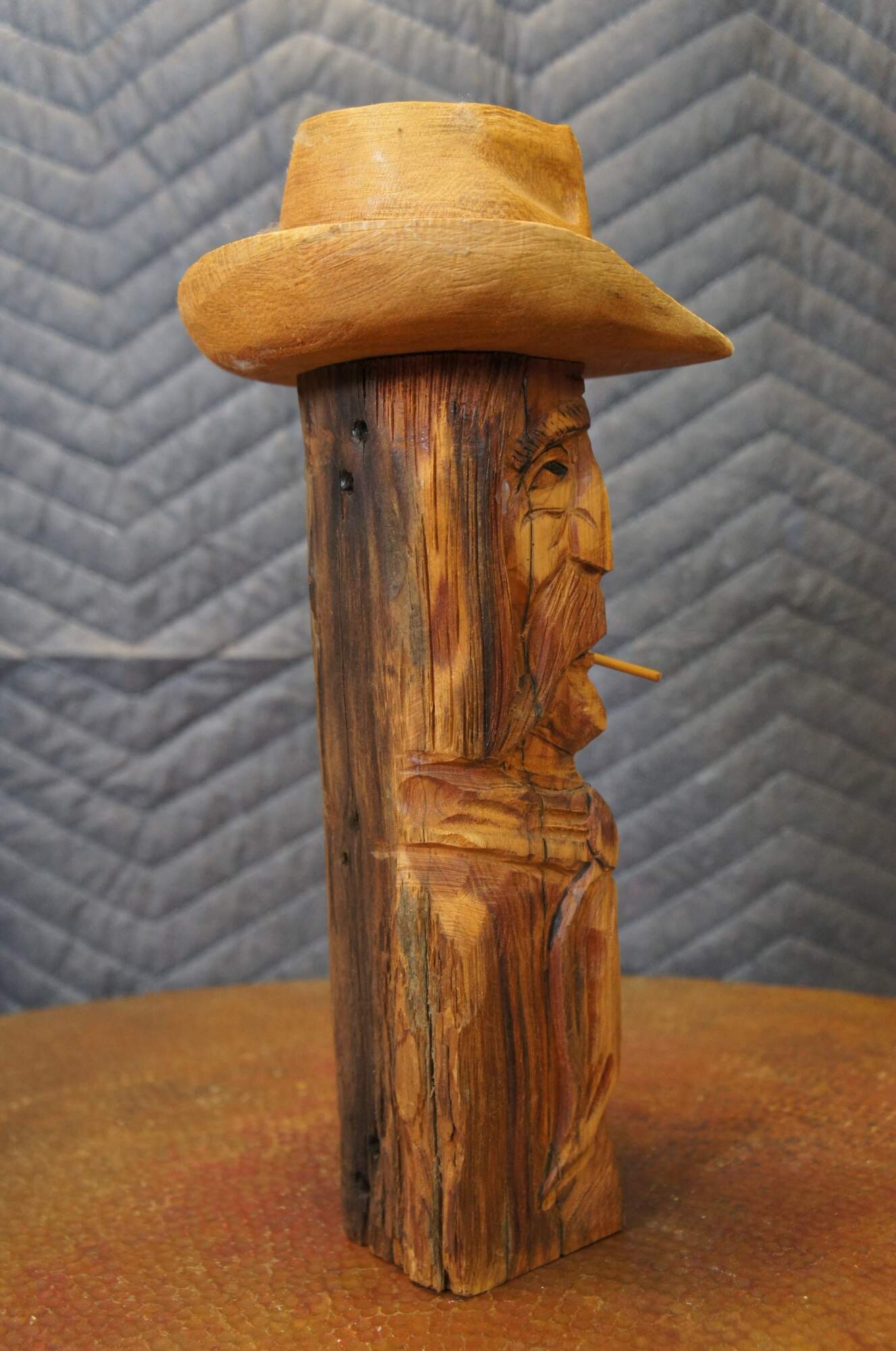20th century hand carved folk art style wooden scupture / figurine in the shape of the bust of a cowboy. Features a craggy face with long hair and mustache, holding the stem of what was once a pipe in his mouth. He wears a neckerchief and traditional Stetson hat.