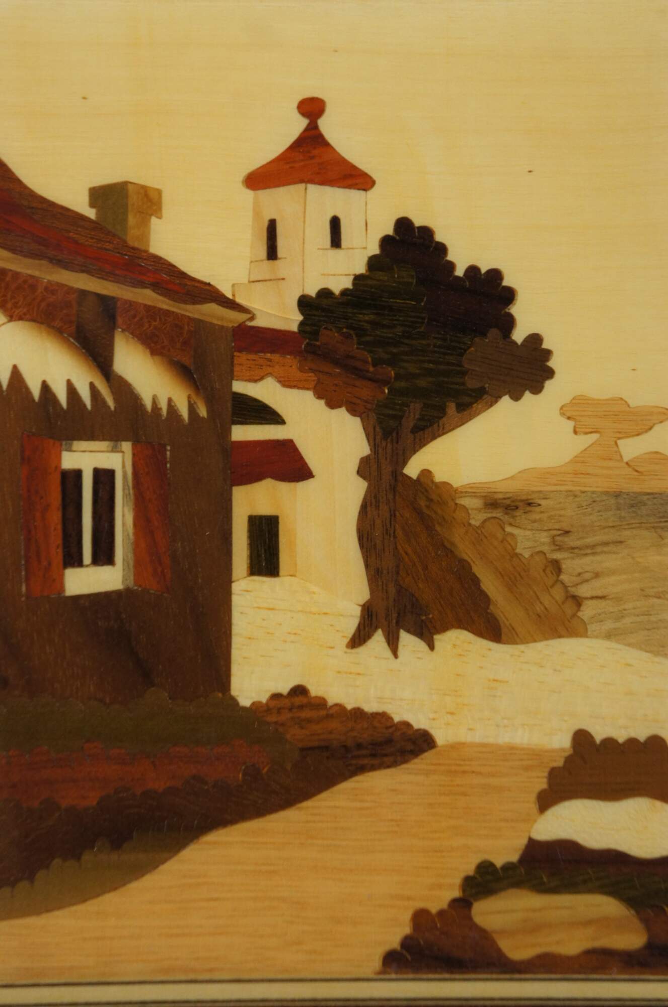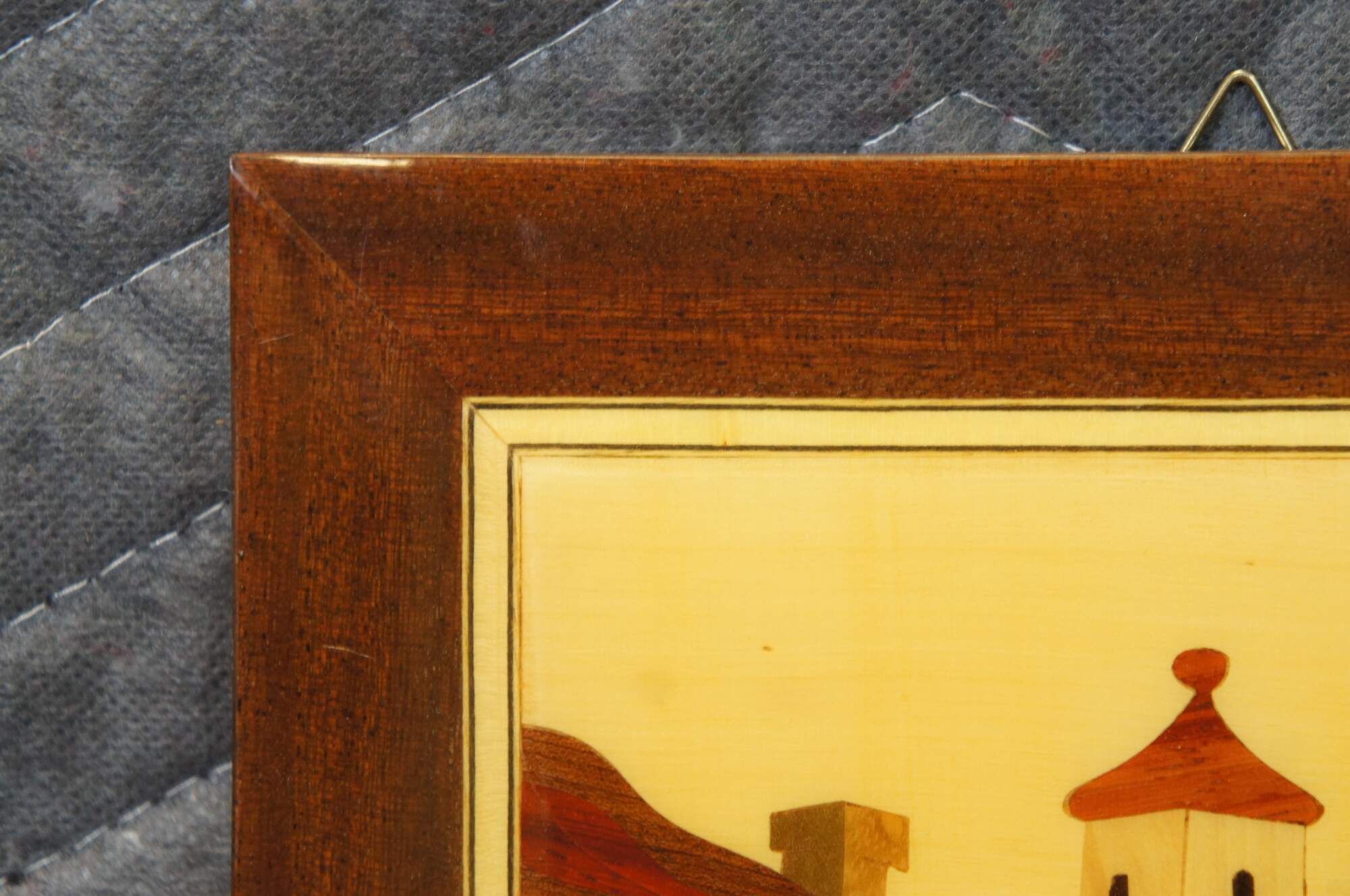 Mid to late 20th century Notturno Intarsio Inlaid Wood Work Factory wall plaque depicting a charming village landscape with a hightly polished finish. Made in Sorrento, Italy.