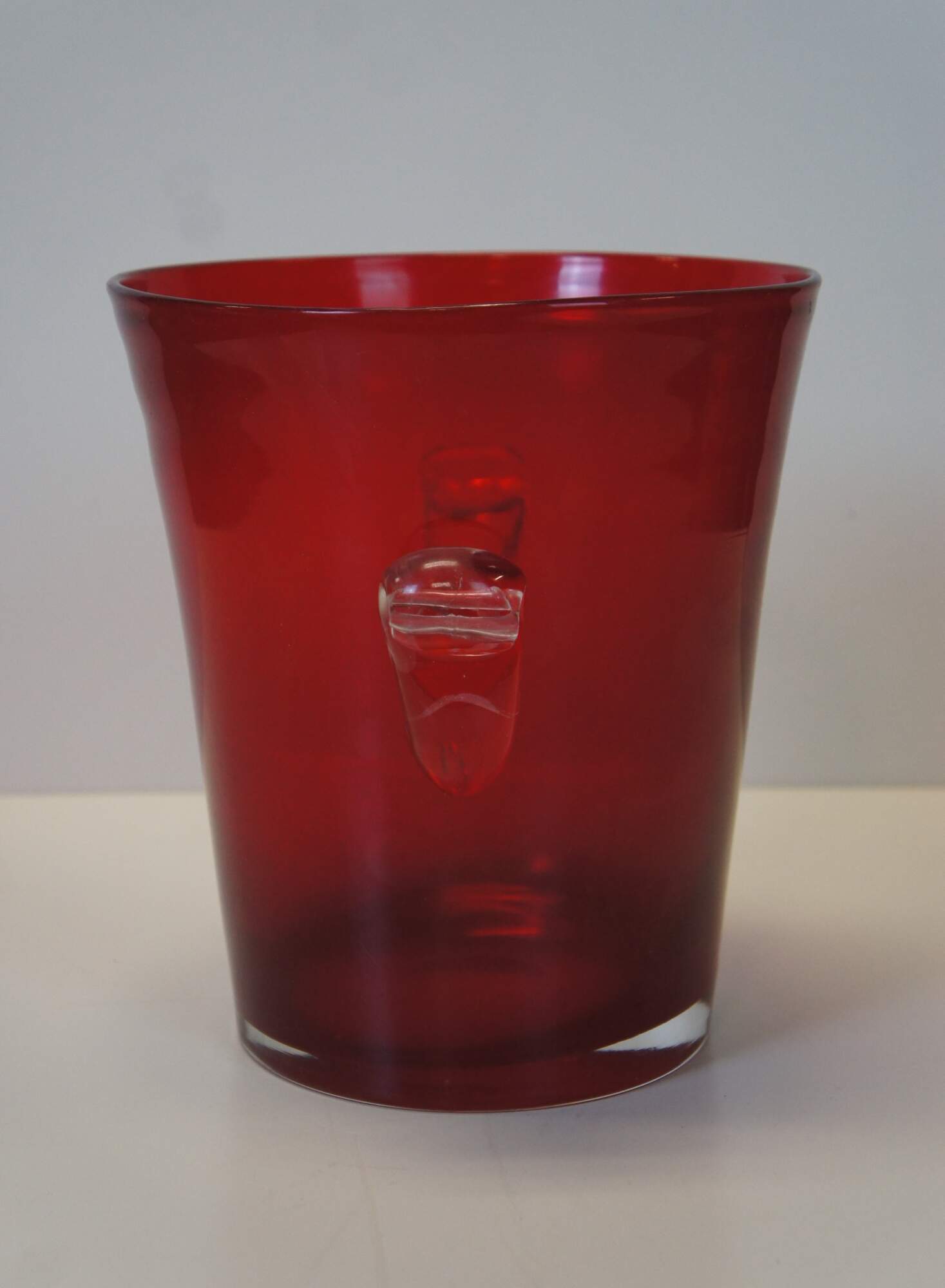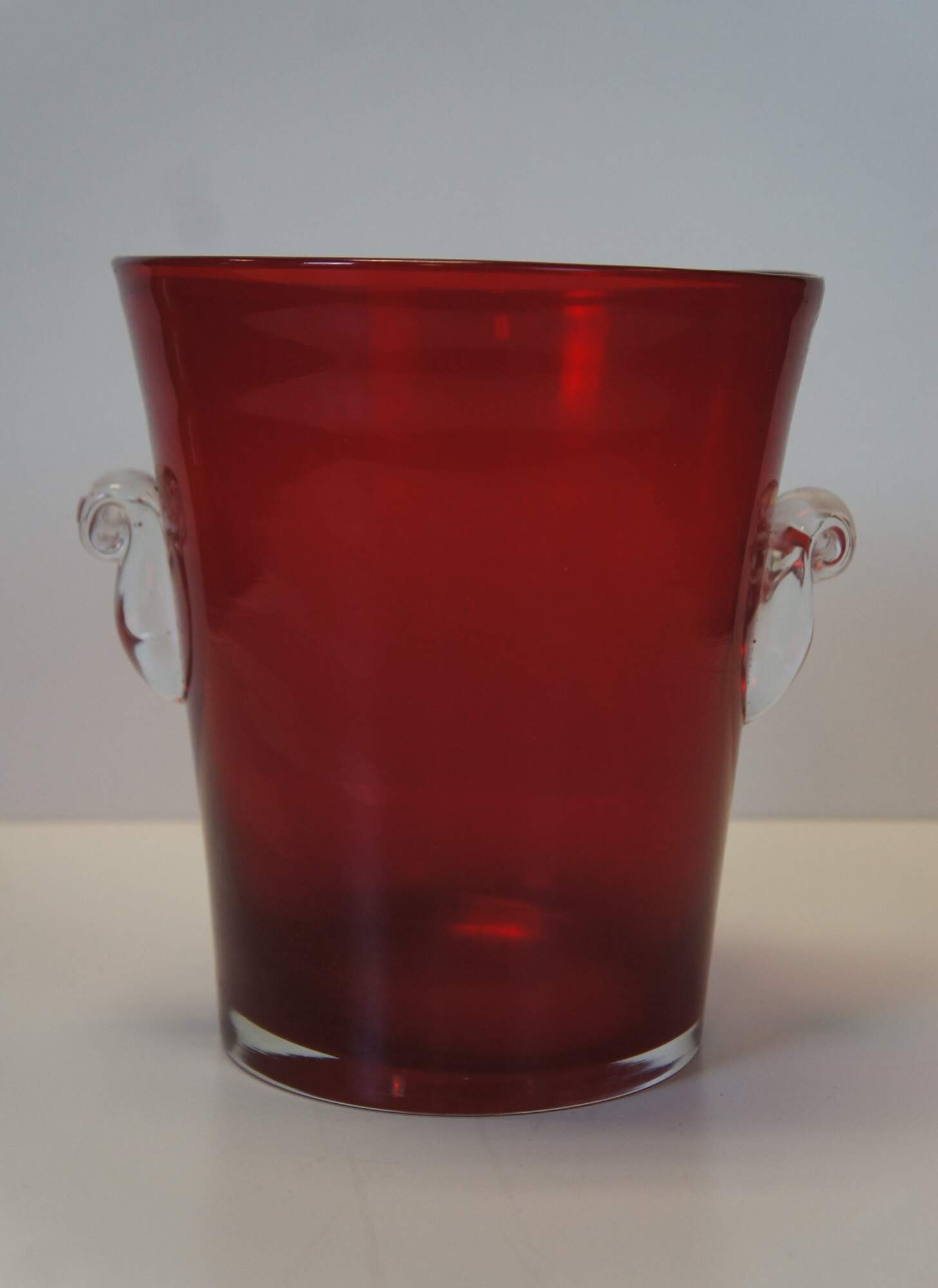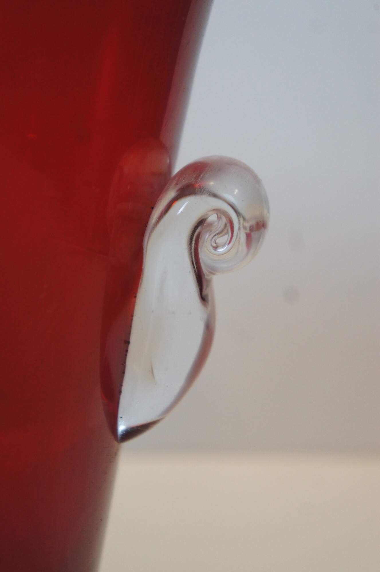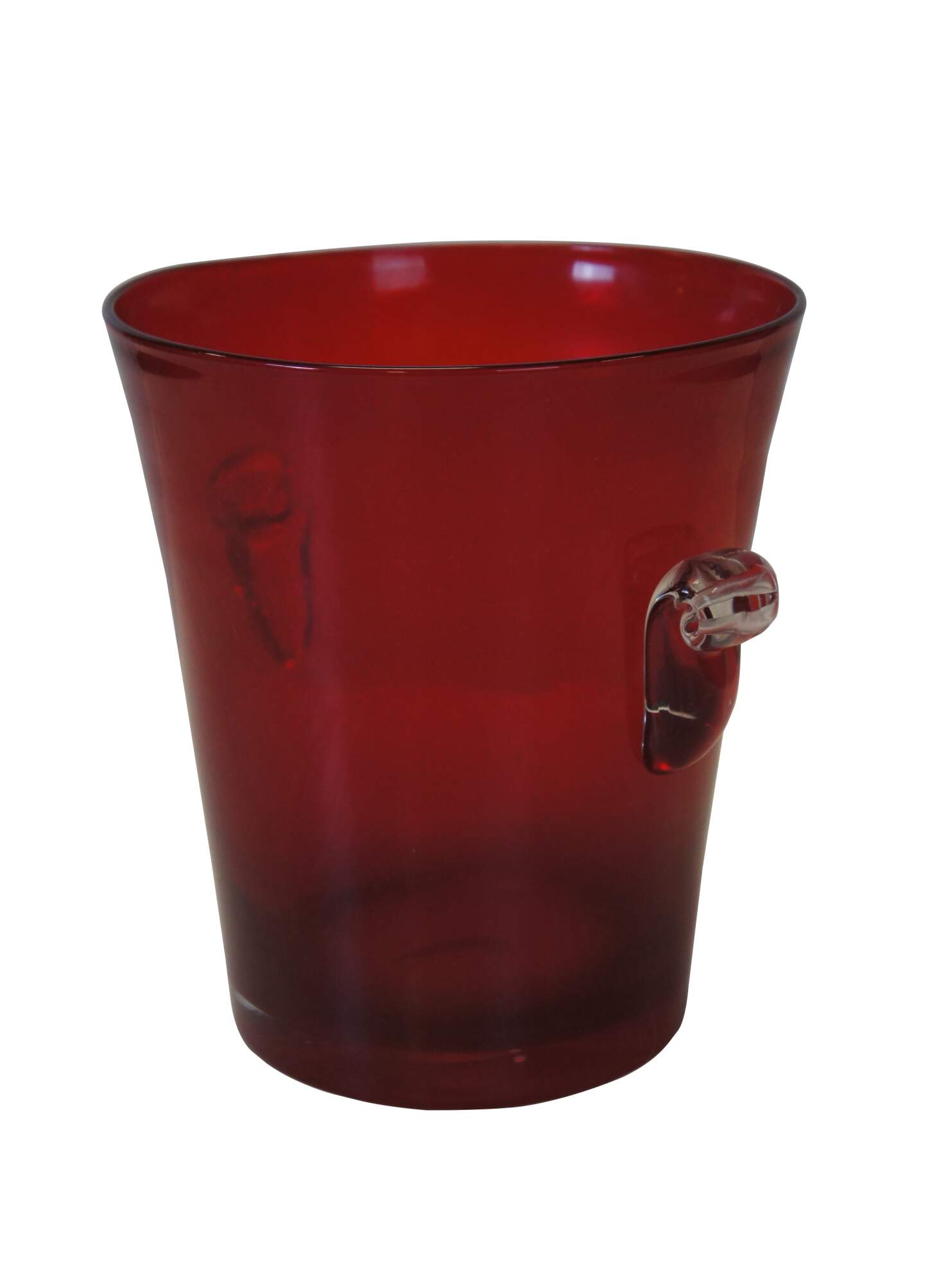 Vintage Murano Italy hand blown ruby red glass ice bucket / champagne chiller. Typical cylincrical form with tapered base and clear spiral / snail shaped handles. Polished pontil.
