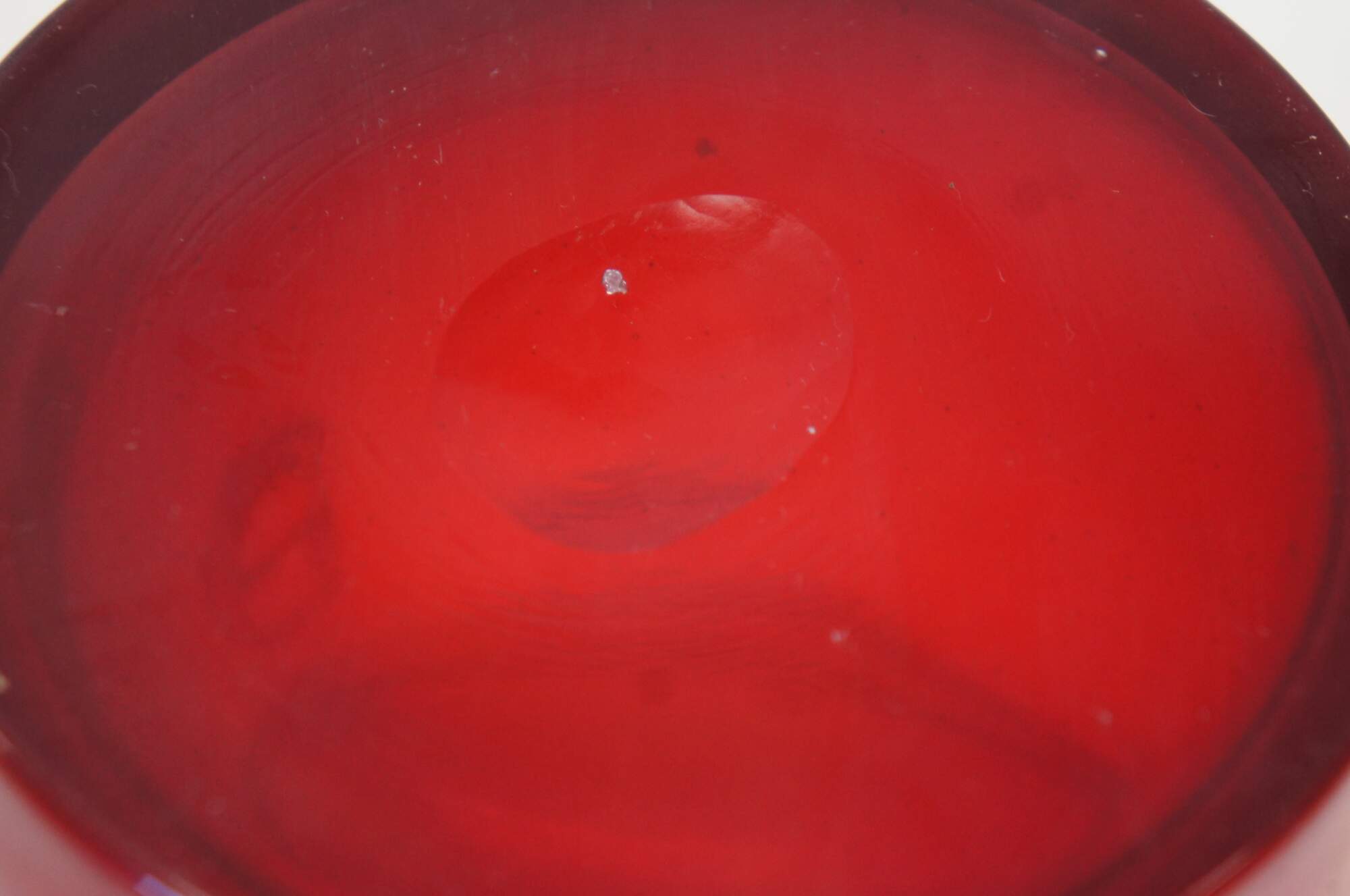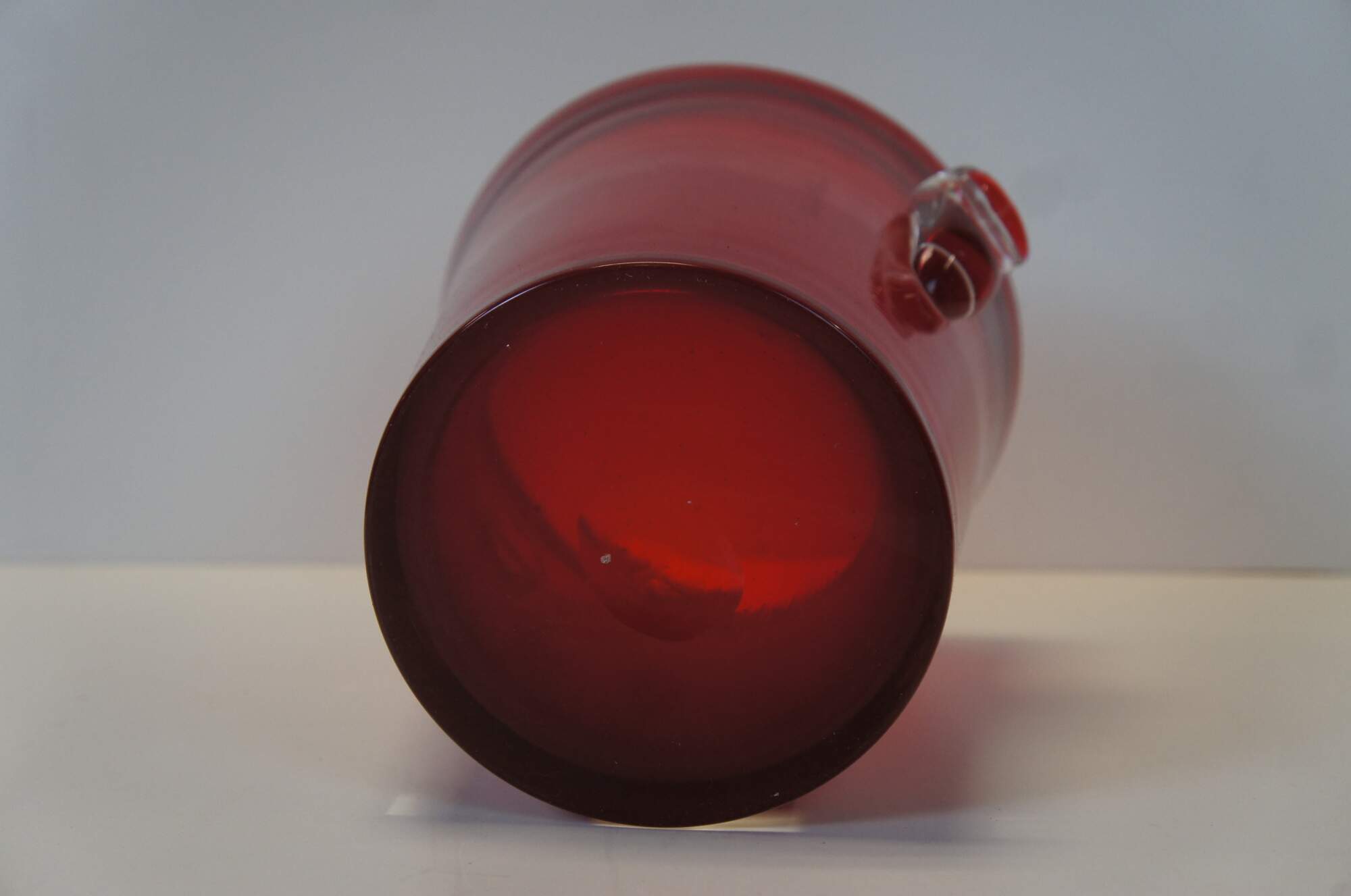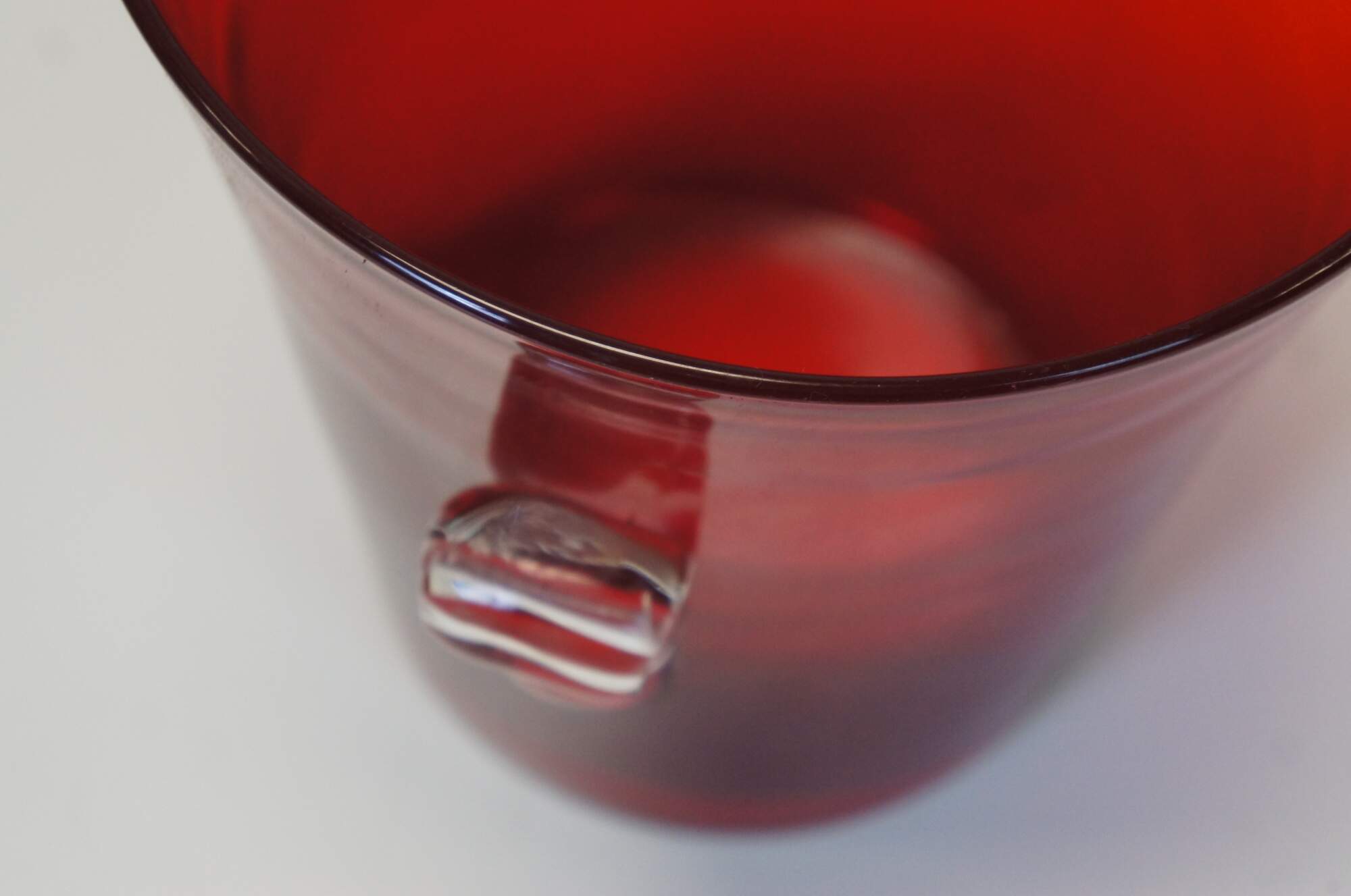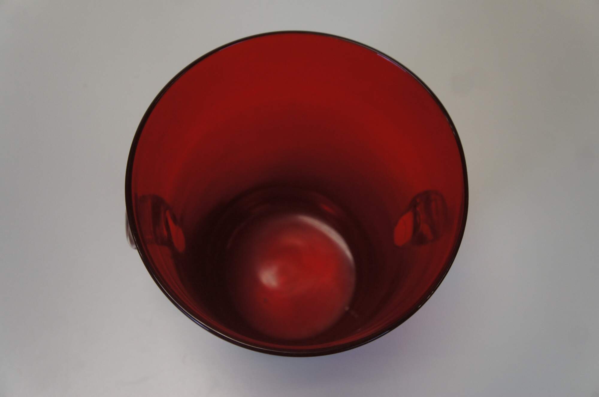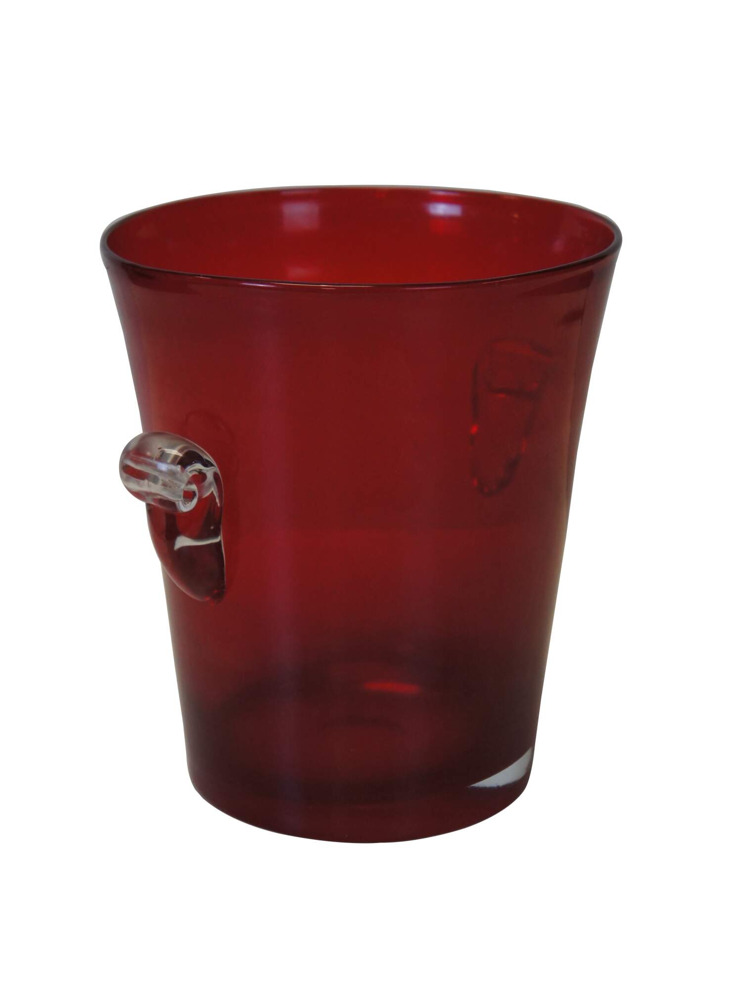 Vintage Murano Italy hand blown ruby red glass ice bucket / champagne chiller. Typical cylincrical form with tapered base and clear spiral / snail shaped handles. Polished pontil.