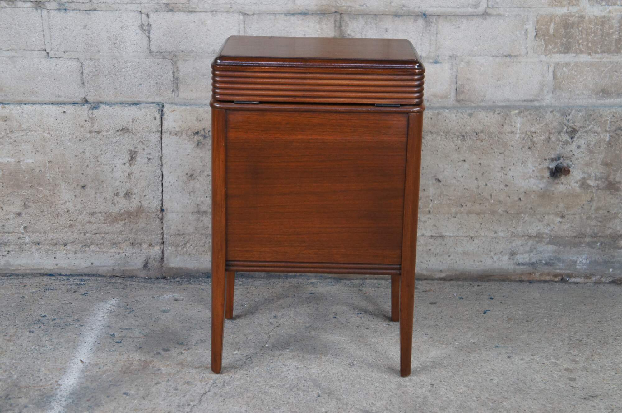 Circa 1940s spool cabinet by White Sewing of Toronto, Canada. Features a walnut frame with ribbed lid top opening to spool organizer. Lower case has two drawers over tapered legs. A fun piece that would also work well as a nightstand or side table in any mid century modern / Minimalist space.