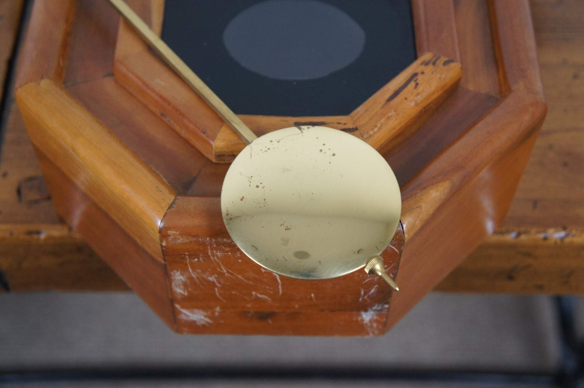 Early to mid 20th century German Mason & Sullivan 8 day, key wound, chiming, school house regulator wall clock. Octagonal wood case with pentagonal drop for the pendulum. Brass pendulum peeks through black, reverse painted window. White painted metal face with black Roman numerals and scrolled/ornate black hands; brass frame. Movement marked number 69 - Mason & Sullivan Co - No (0) Jewels - Made in West Germany - Unadjusted - 141-070. Paper label behind pendulum reads "Reproduction Clocks - Steeples, Regulators, Pillar & Scroll, Banjo - Allen Thompson - Yellowstone Road Xenia, Ohio 45365.