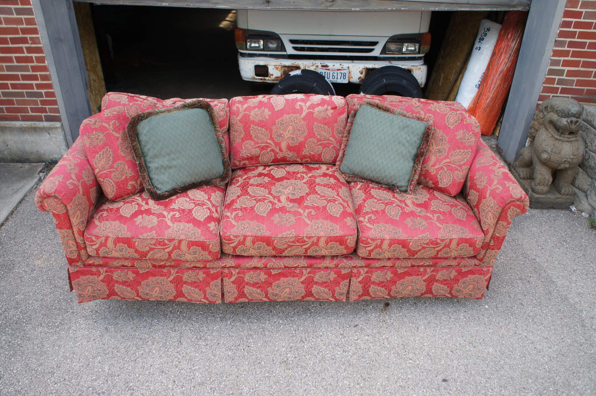 Vintage Baker Furniture three seat sofa or couch featuring red paisley upholstered fabric with rolled arms and skirted base. Includes two green lumbar throw pillows.