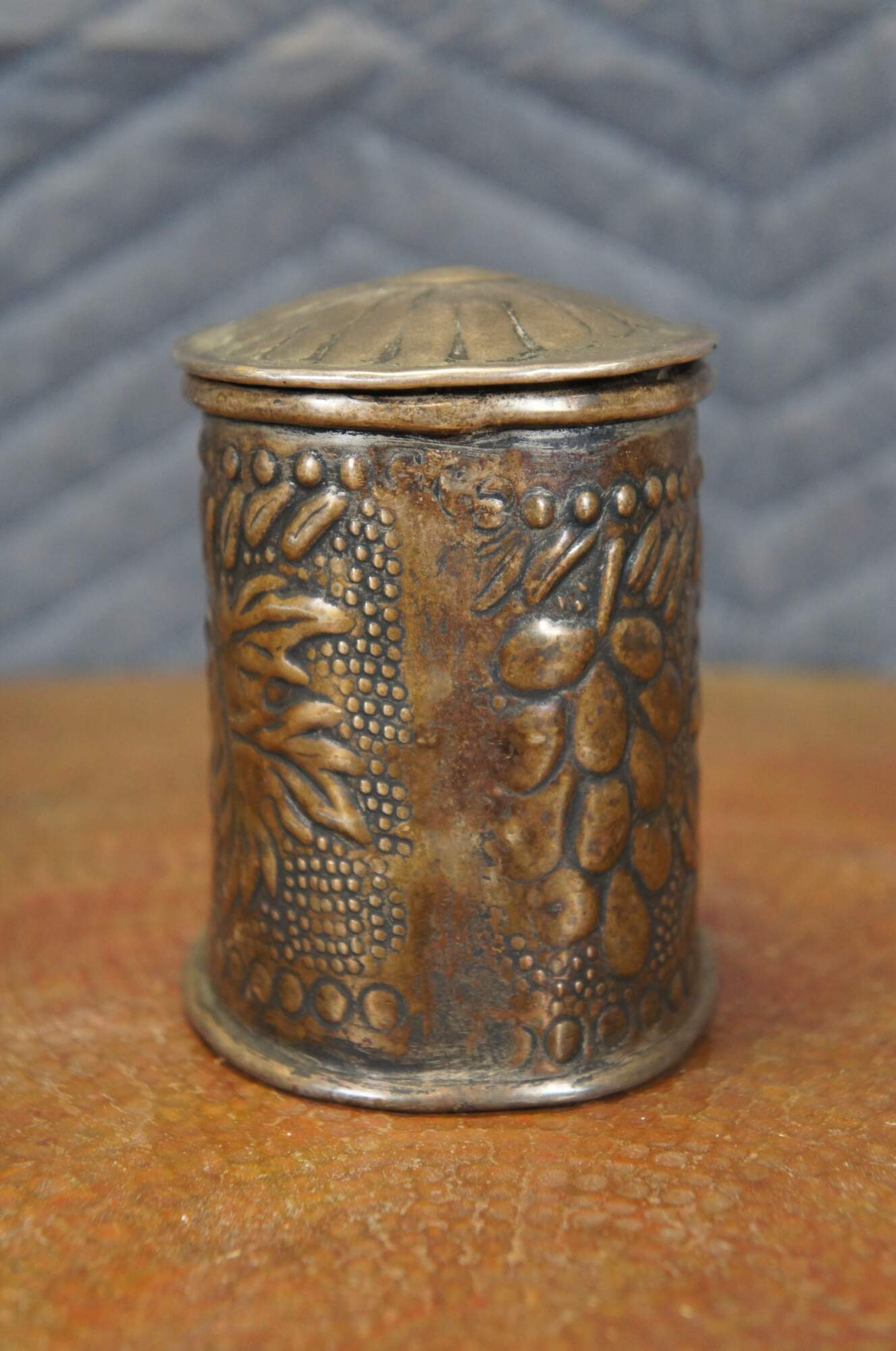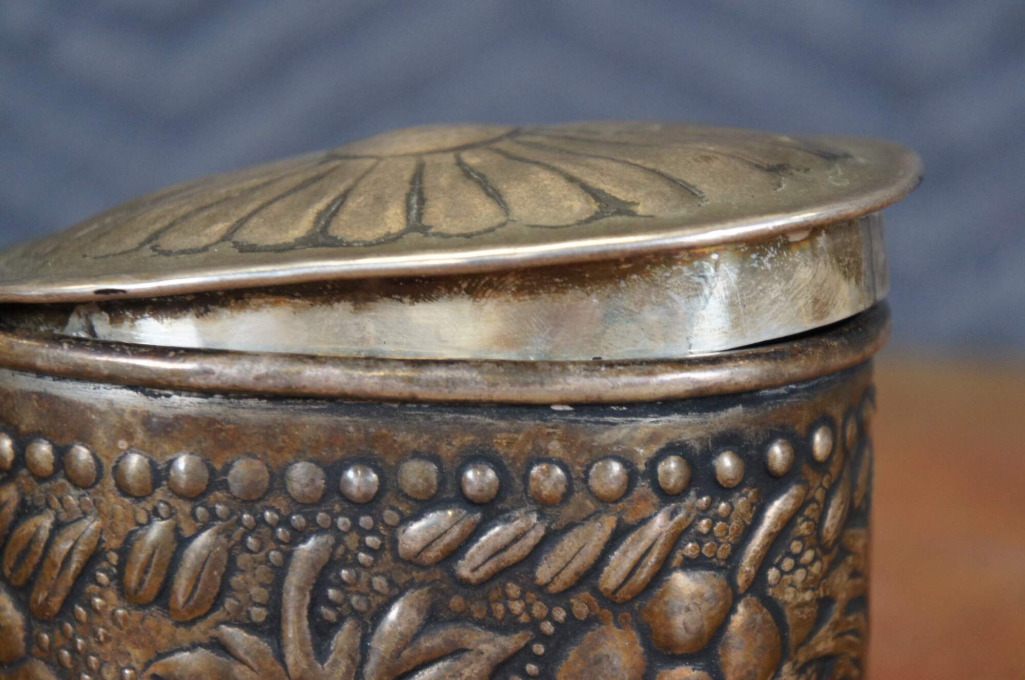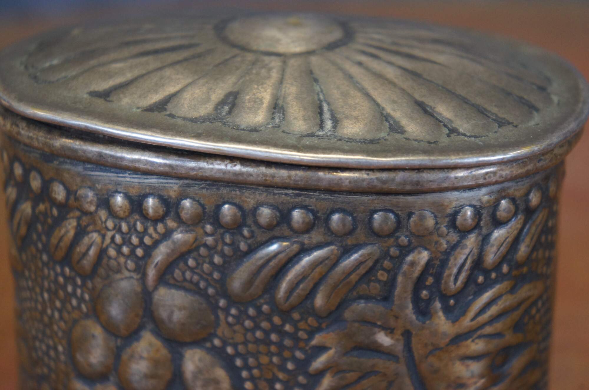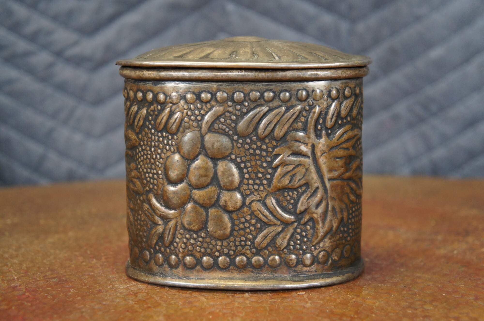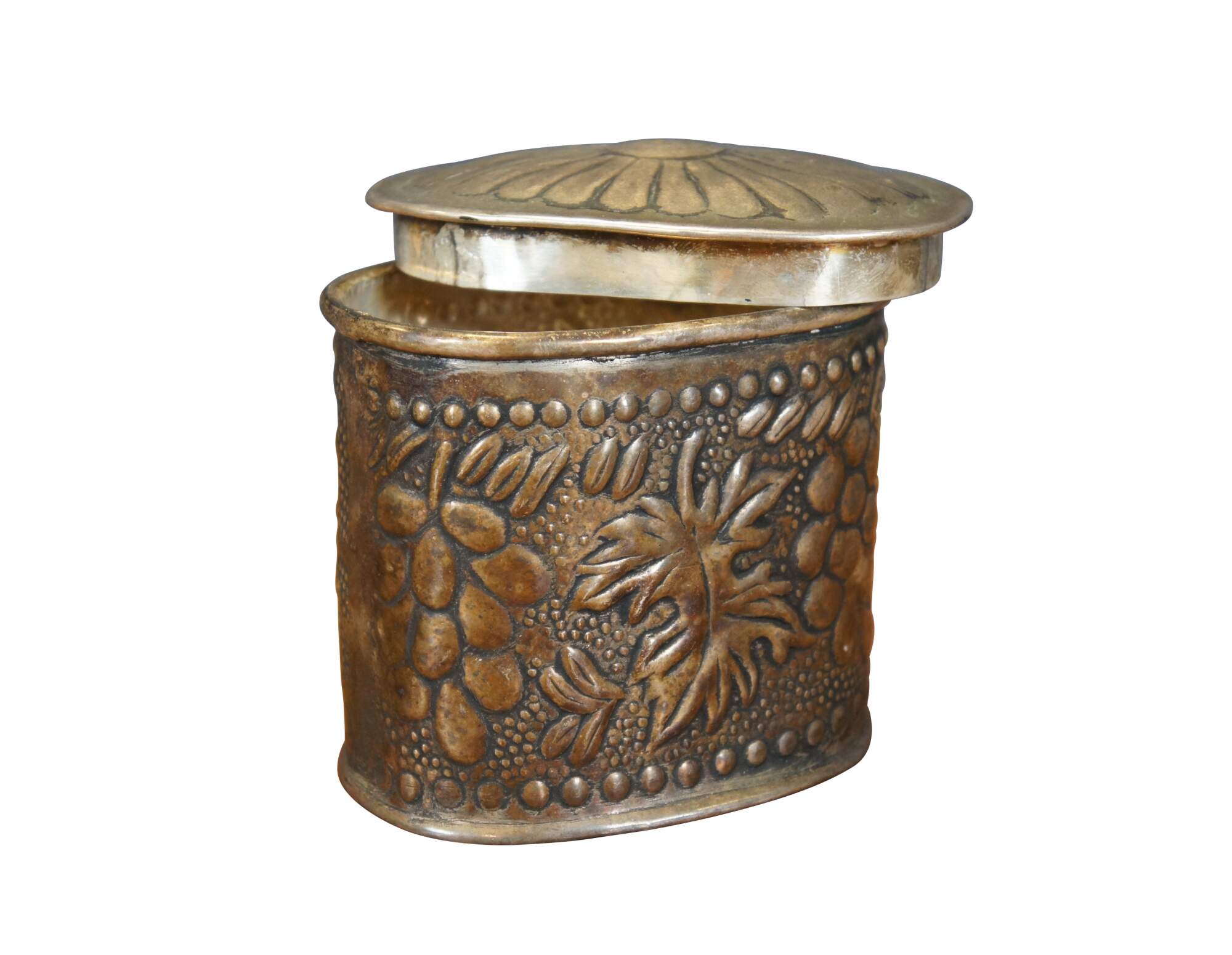 Vintage repousse silver plate or tin small tea caddy / canister / trinket box. Oval form embossed with bunches of grapes, leaves and beaded trim, with a flower / daisy on the lid. No makers mark.