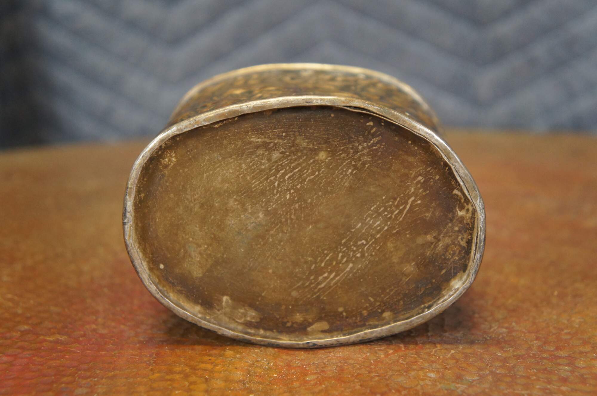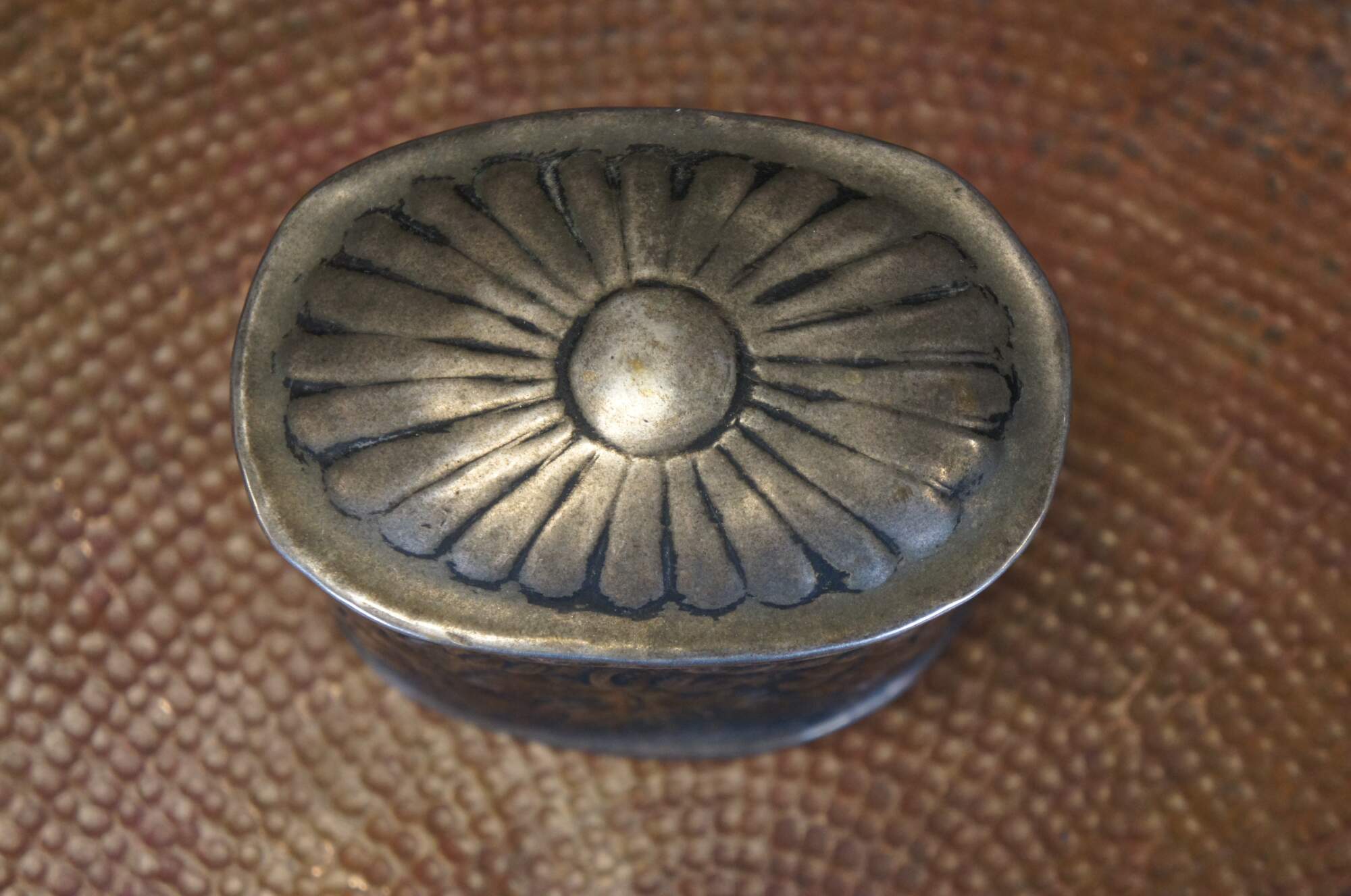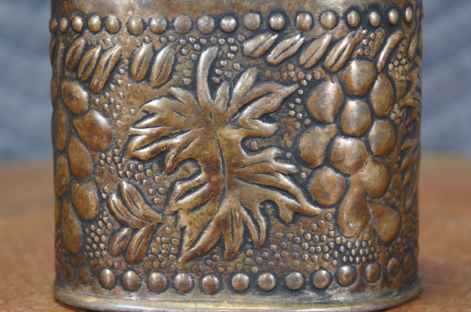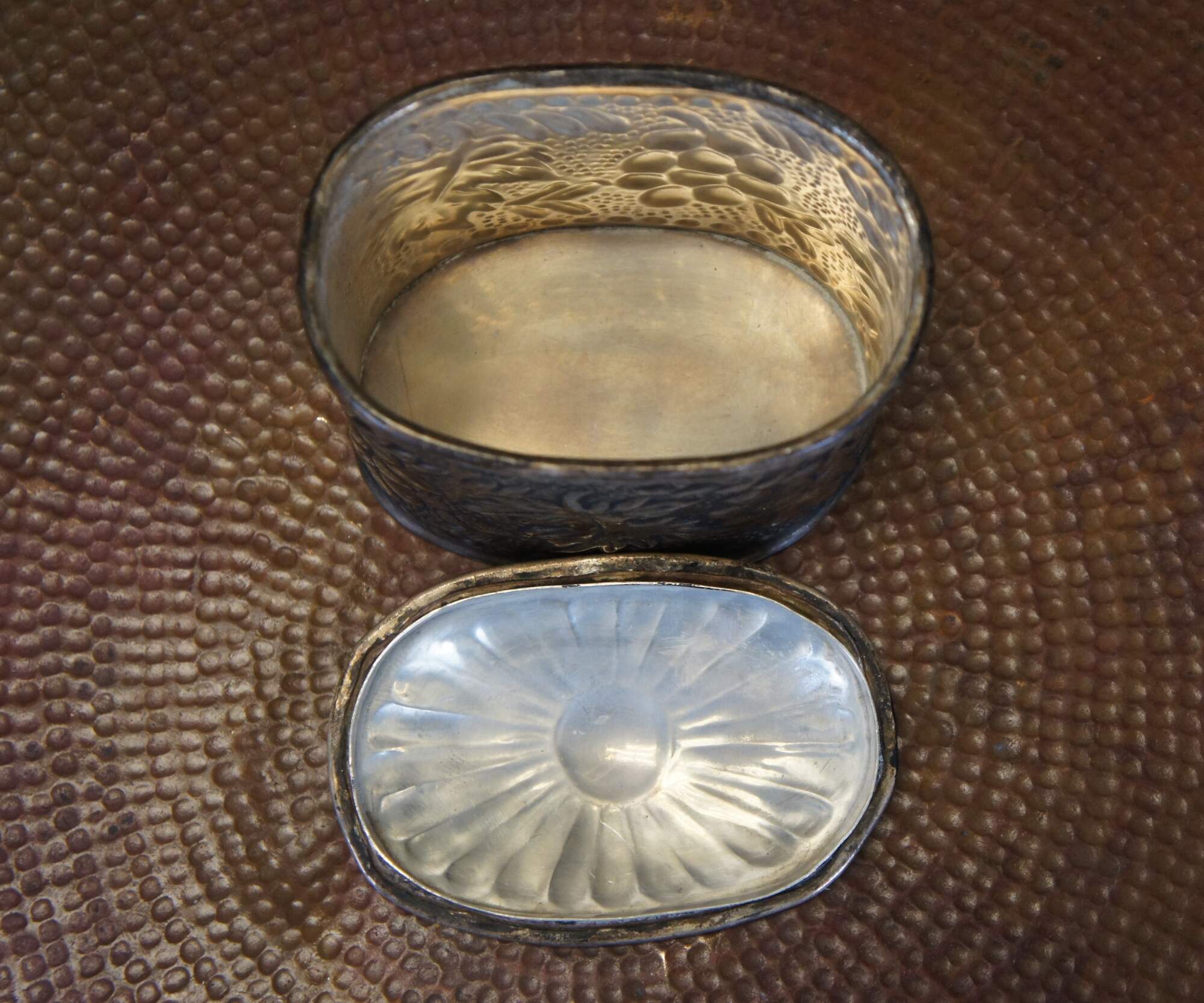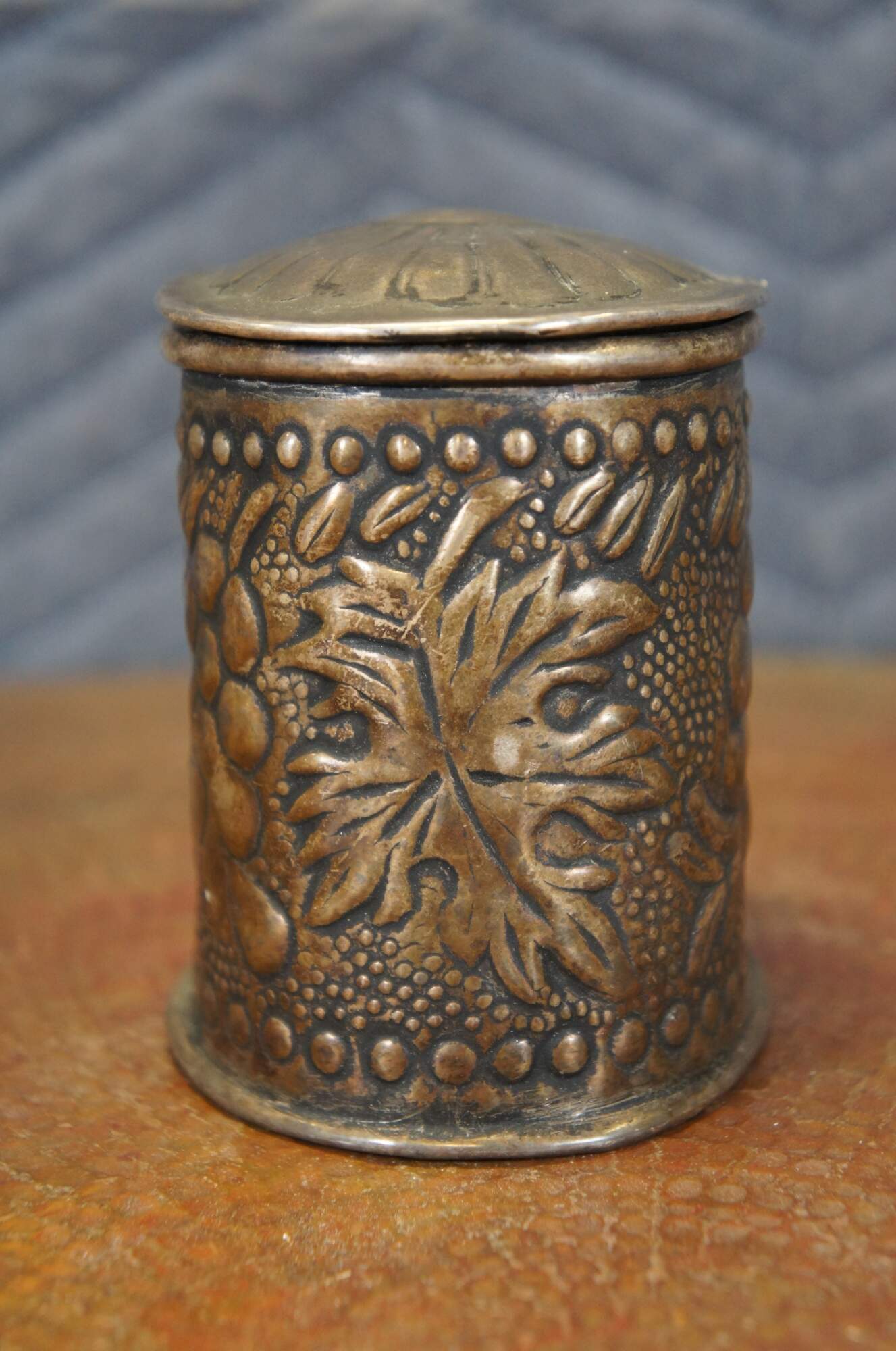 Vintage repousse silver plate or tin small tea caddy / canister / trinket box. Oval form embossed with bunches of grapes, leaves and beaded trim, with a flower / daisy on the lid. No makers mark.