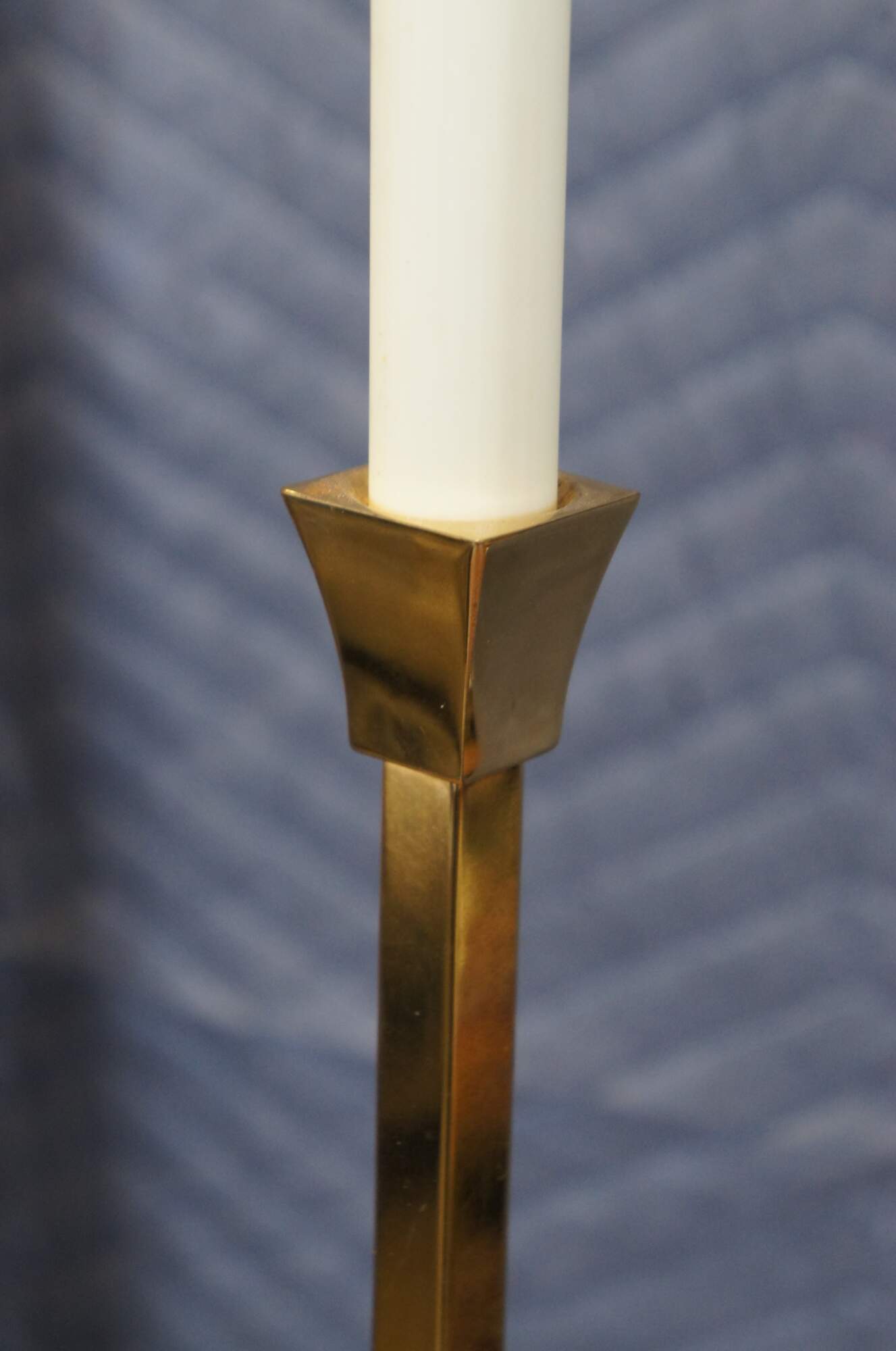 Rare vintage Yule Paige bright lacqured brass buffet altar lamp featuring a square candlestick shaped body on a three dimensional North star base, topped with a faux candle socket. Top Brass / Base # 671 / Maker Yule Paige / Inspector Lisa Myers / Serial # 14582.