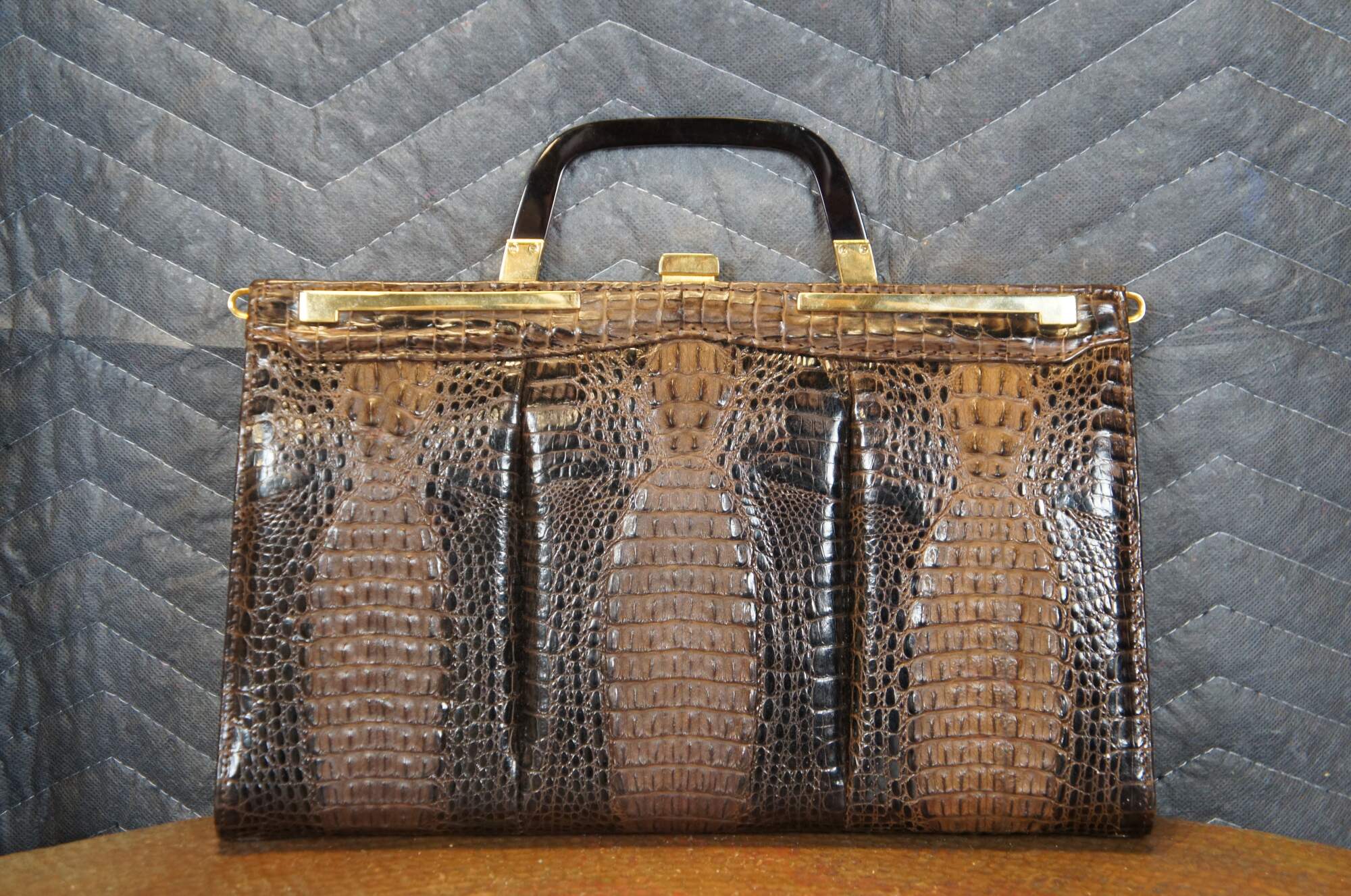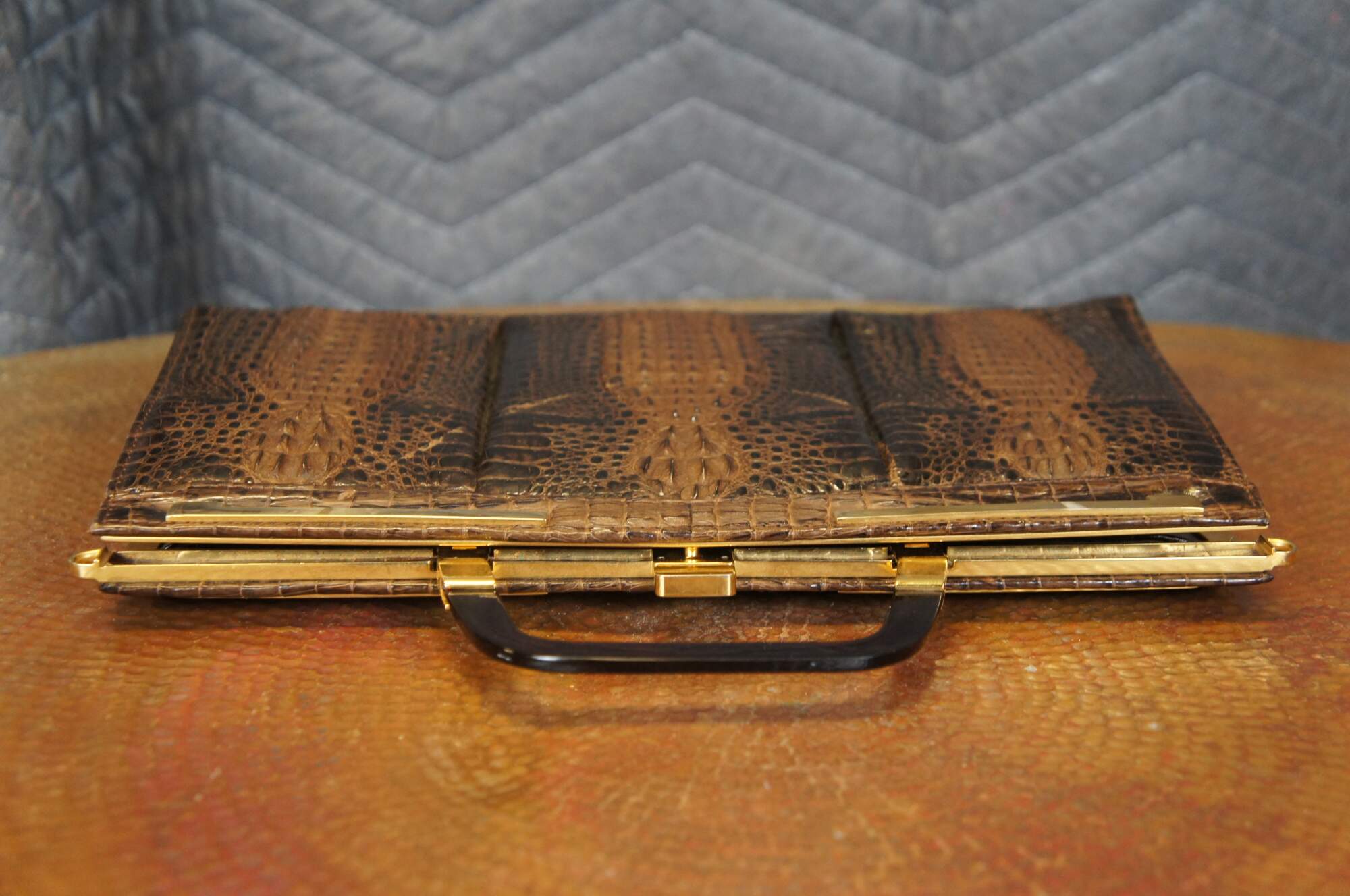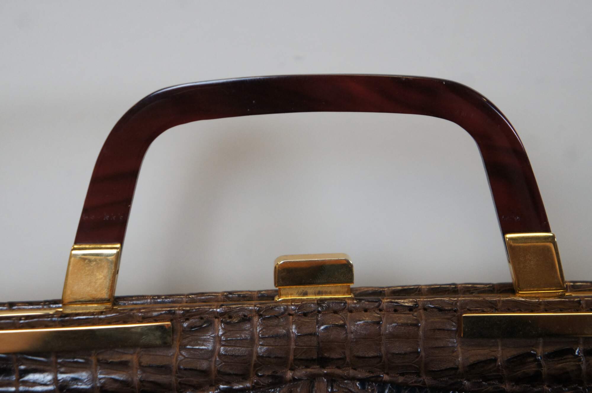 Mid century triple hornback brown alligator / crocodile skin / leather purse / hand bag. Rectangular form; gold tone hardware; single tortoiseshell bakelite / acrylic handle. Snap closure. Two interior compartments divided by zippered pocket; one interior slip pocket. Brown pleather interior. Matching brown pleather coin purse.