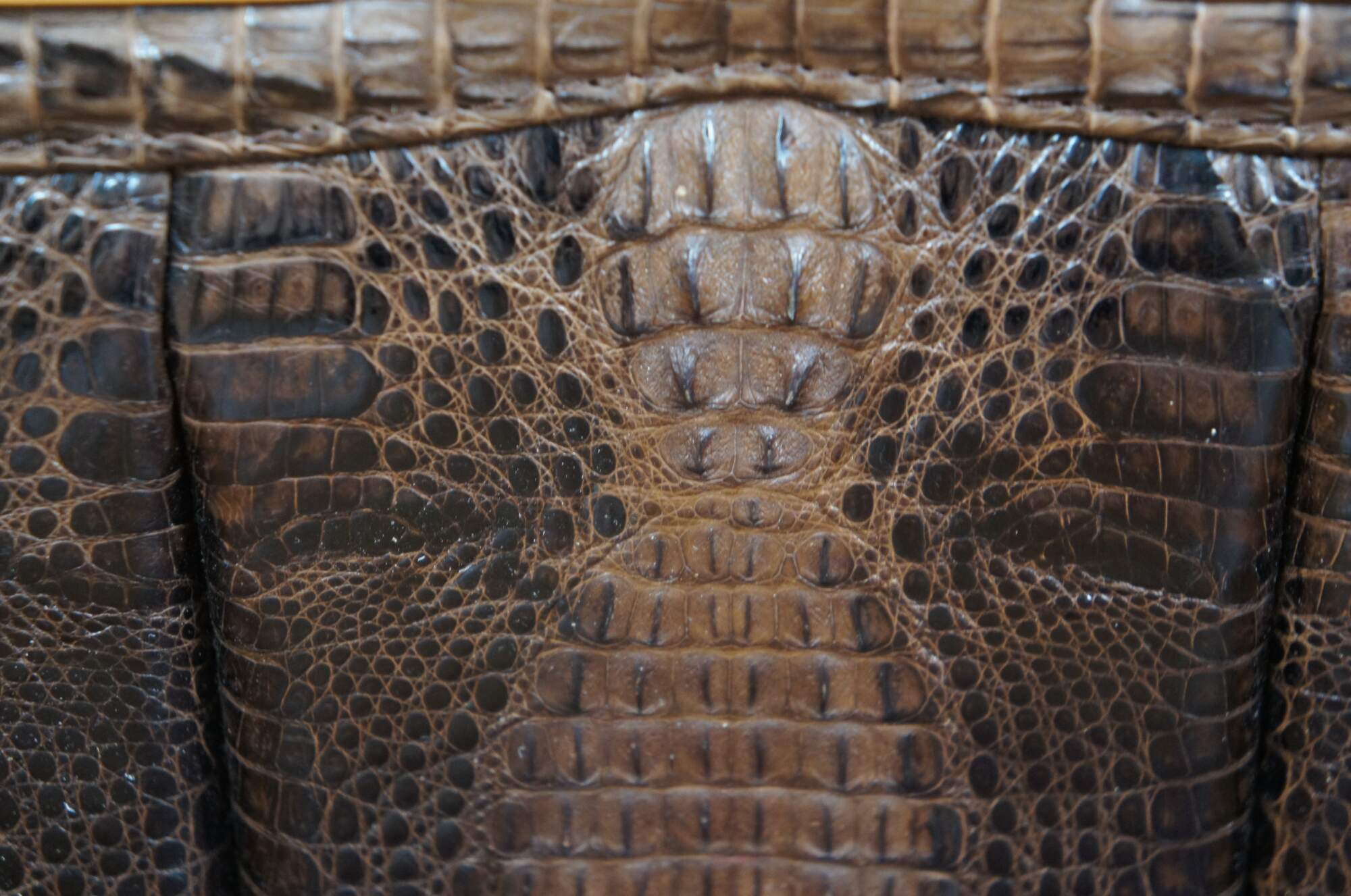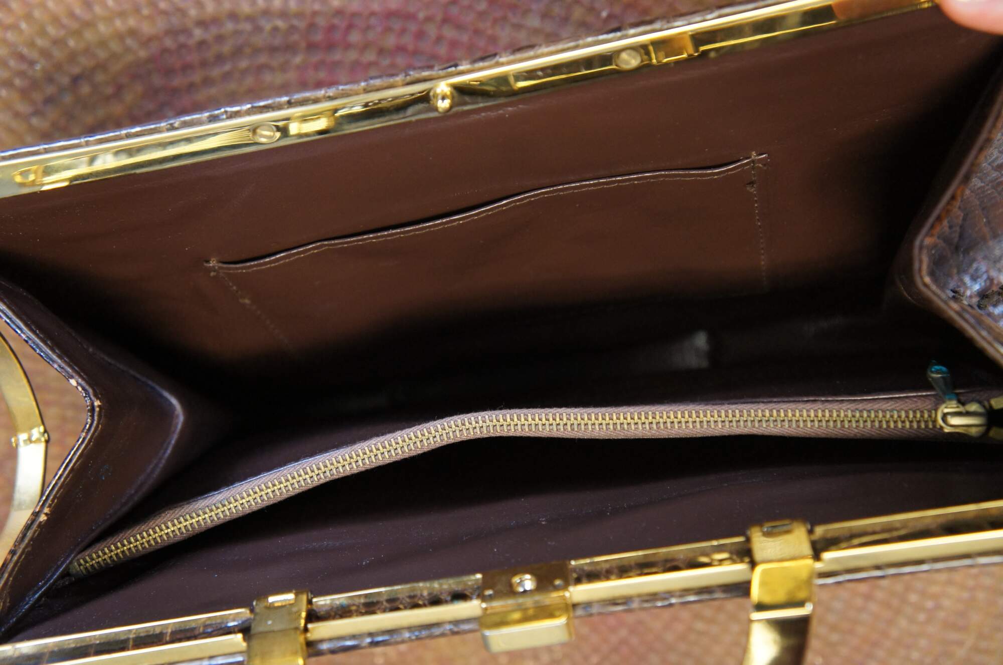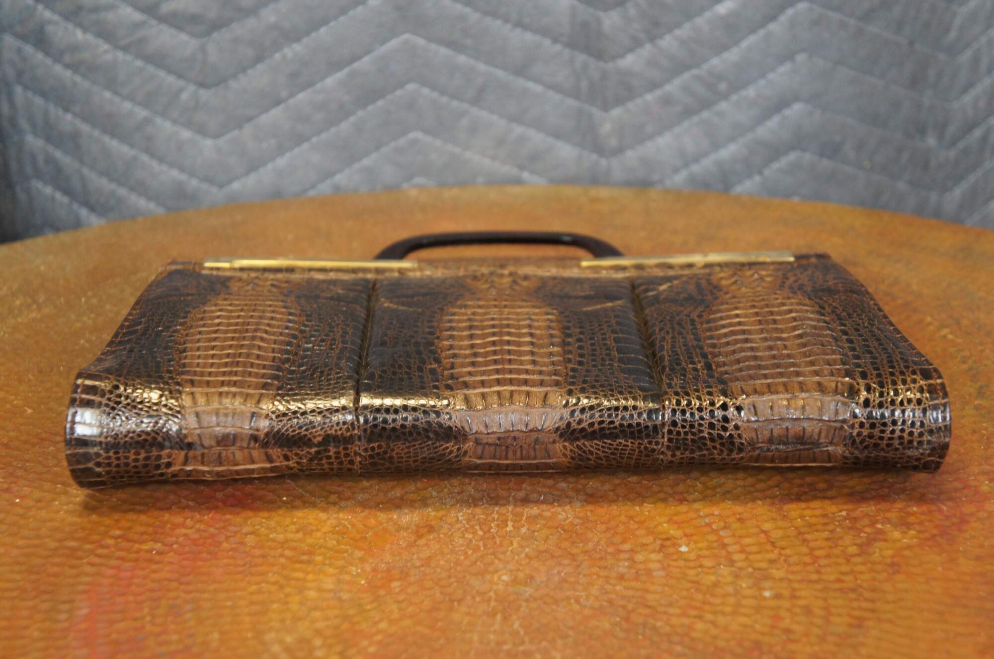Mid century triple hornback brown alligator / crocodile skin / leather purse / hand bag. Rectangular form; gold tone hardware; single tortoiseshell bakelite / acrylic handle. Snap closure. Two interior compartments divided by zippered pocket; one interior slip pocket. Brown pleather interior. Matching brown pleather coin purse.