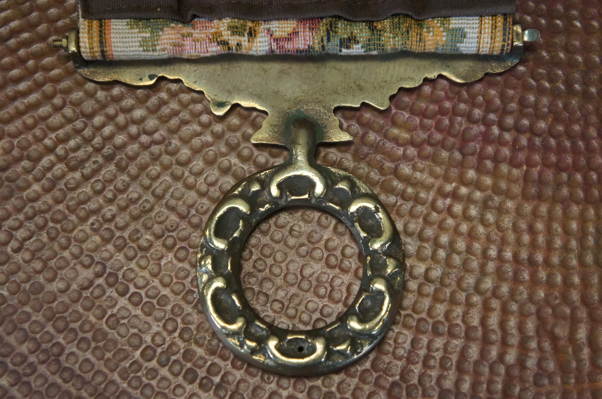 Late 20th century Corona Decor Co tapestry bell pull / wall hanging. Art. No. 609920. Machine embroidered, French Aubusson style floral tapestry featuring a vine of roses spiraling around a golden column, capped at the top and bottom with ornate brass loops / handles. Brown cotton back.