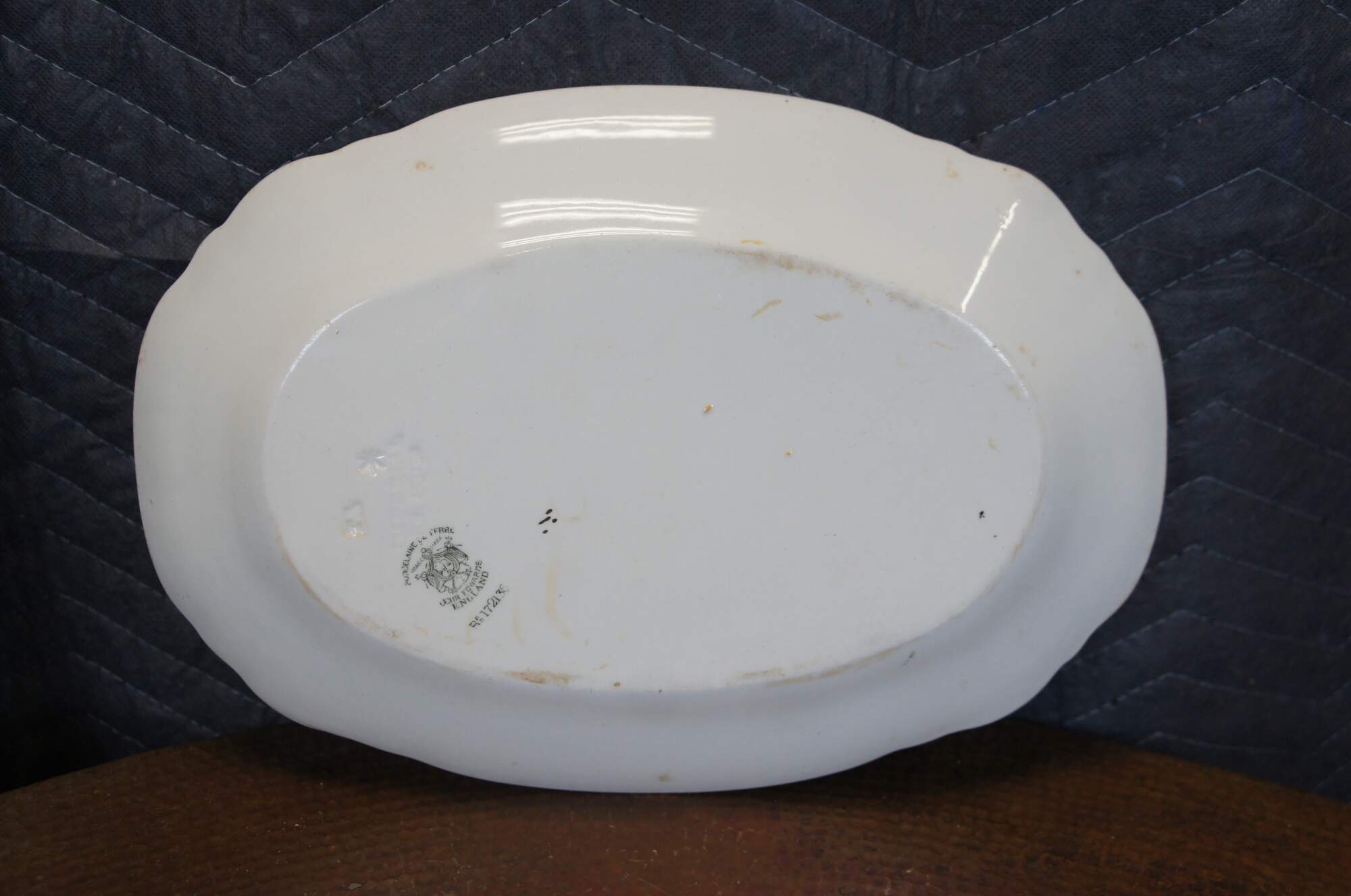 Antique 1890's oval porcelain serving platter by John Edwards. Lightly scalloped Imperial design with black transfer Poppies pattern with hand painted gold accents. Stamped with logo and registration mark Rd. 172136 (design registered in 1891). Impressed with T595, a star, Imperial and registration mark Rd. 153150 (design registered in 1890).