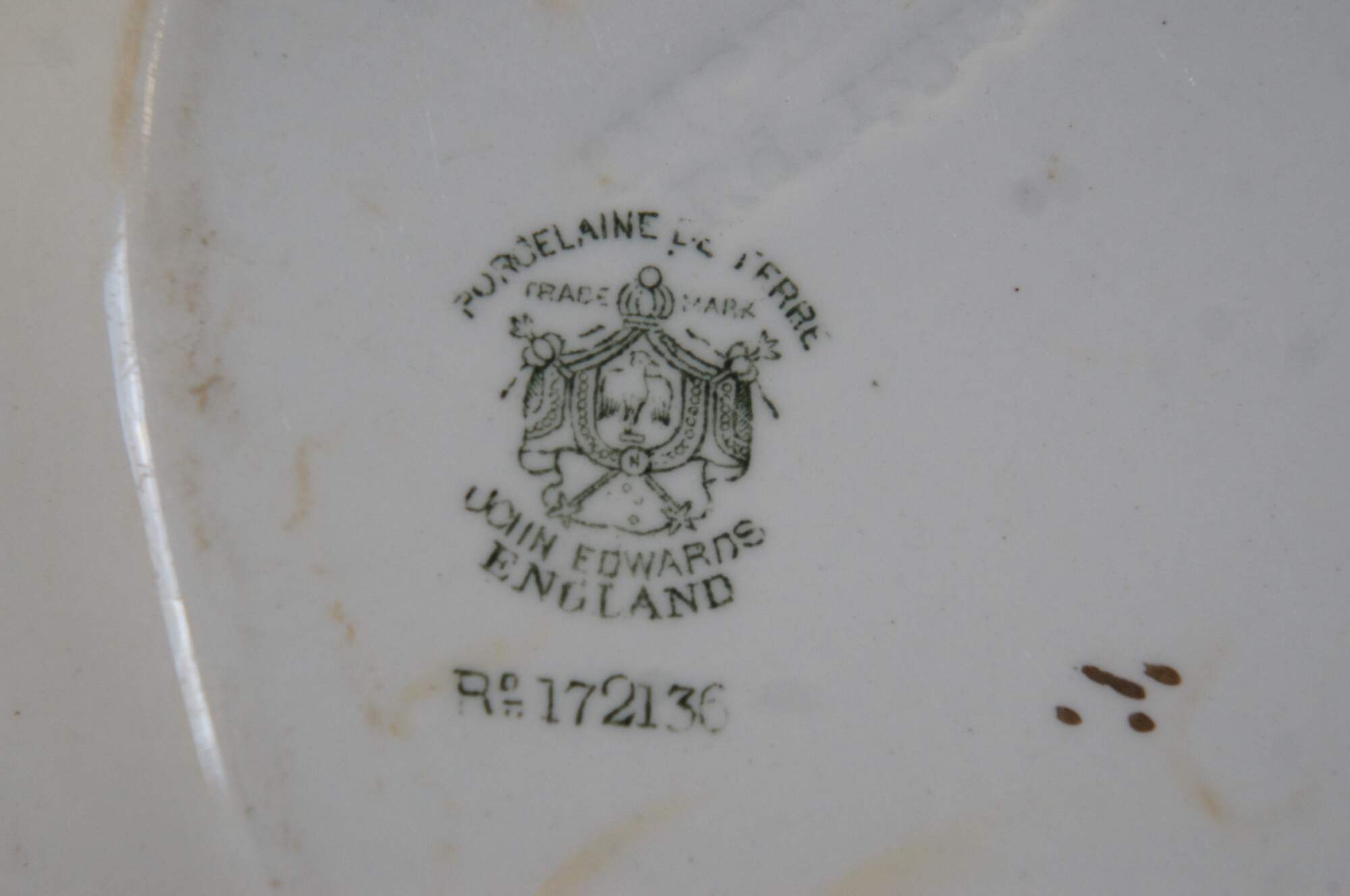 "John Edwards was a china & earthenware manufacturer at Longton and then King Street, Fenton, Stoke-on-Trent, England in the late 19th century. John Edwards operated a factory in Longton begeinning circa 1847 and around 1850 moved to the King Street Works in the adjacent town of Fenton. China and earthenware was produced until 1856 when only earthenware was made. In 1861 the business employed 170 people. At some time John Edwards was in partnership with James Edwards (relationship uncertain), James left the partnership in January 1865. Between 1873 and 1879/1880 "& Co" was included in the name. From about 1880-1900 the name reverted to simply John Edwards. A significant part of the output was semi-porcelain and white granite for the American markets." (Source: The Potteries)
