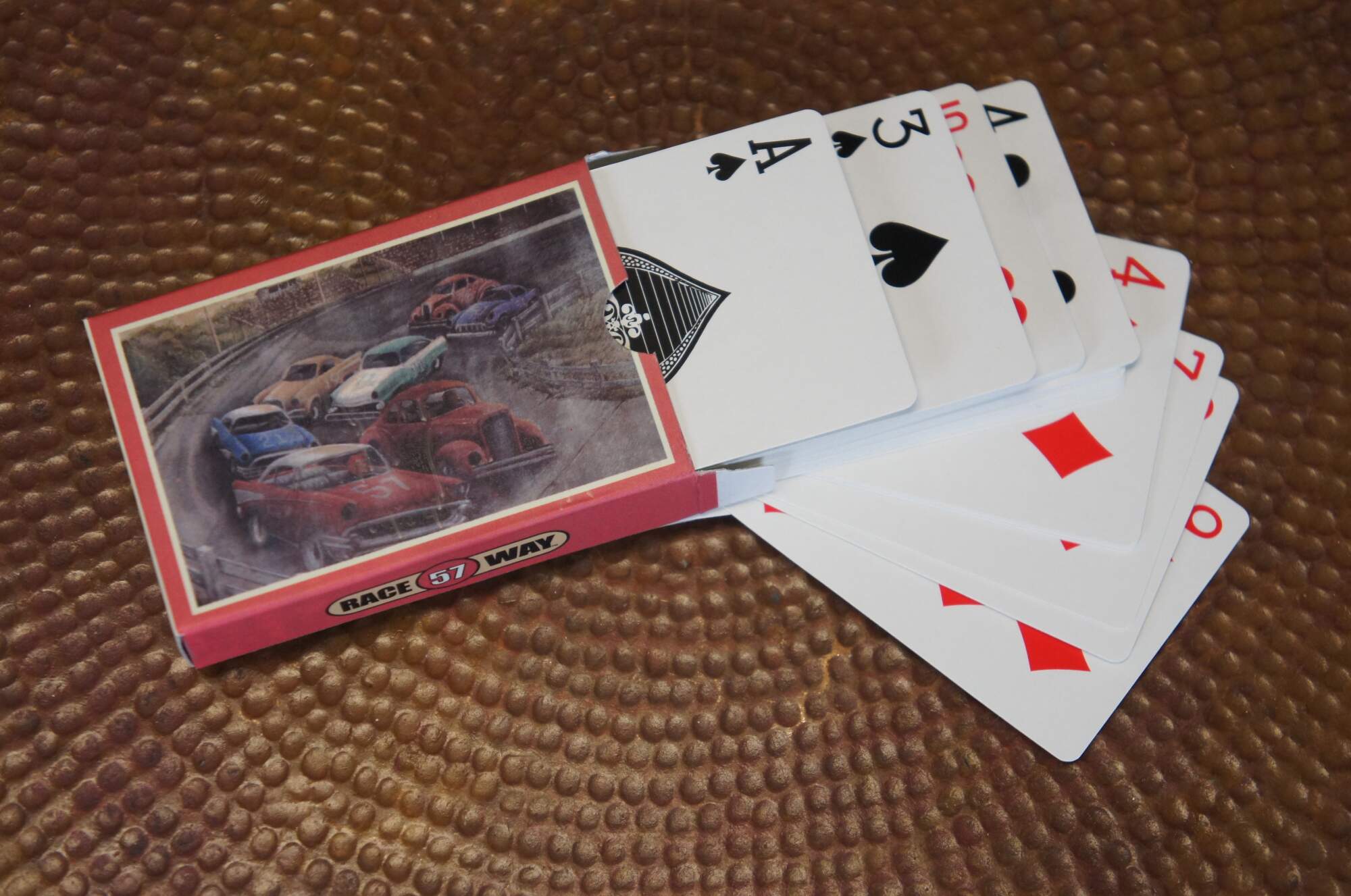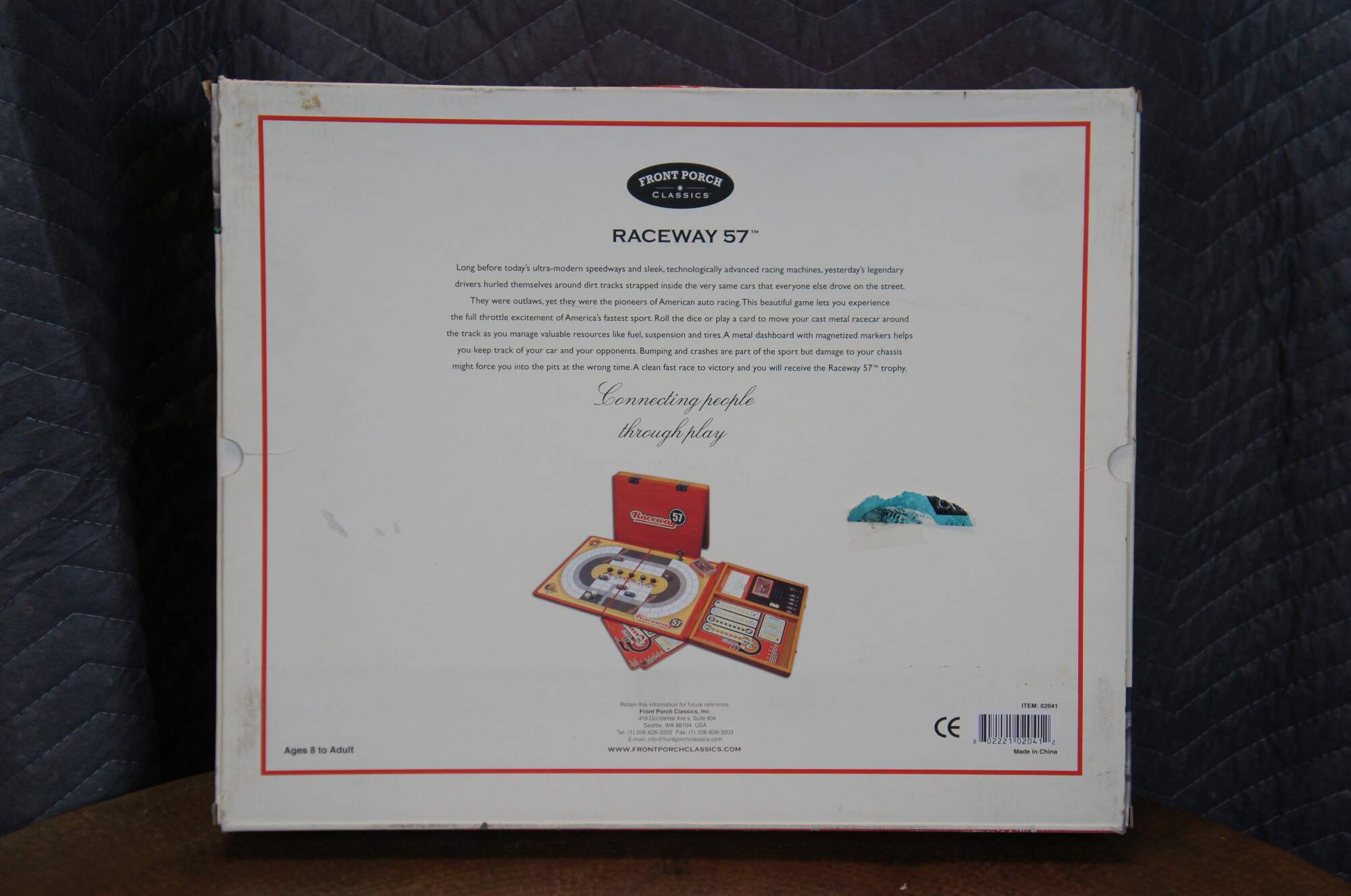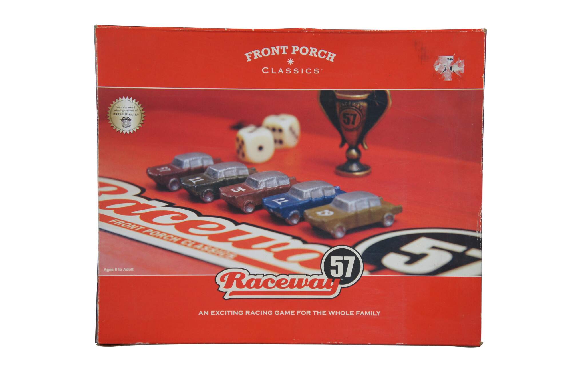 Late 20th century Front Porch Classics - Raceway 57 board game. A vintage styled car racing game for ages 8 to adult. Includes original packaging, instruction book/quick start guide, wooden storage case with fold out game board, pad of score sheets, deck of standard playing cards, two dice, 5 metal playing pieces, metal trophy piece, 5 metal player sheets, 5 wooden player tokens, and 30 magetic score markers. Numbered 4324.