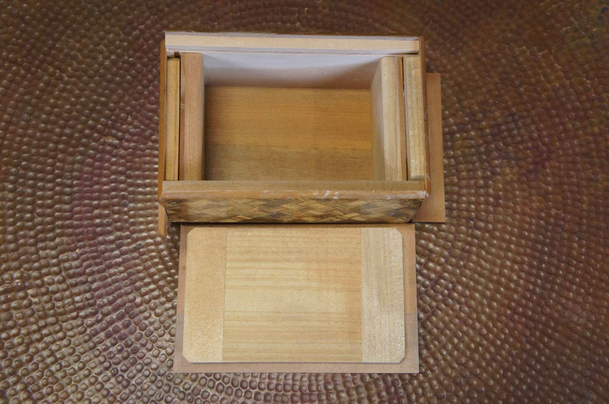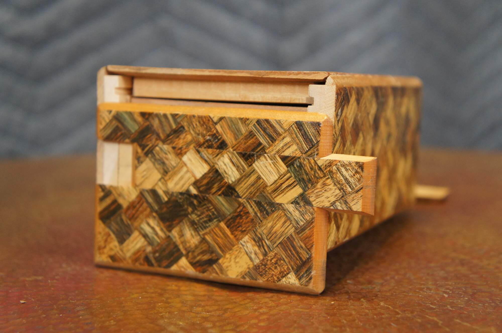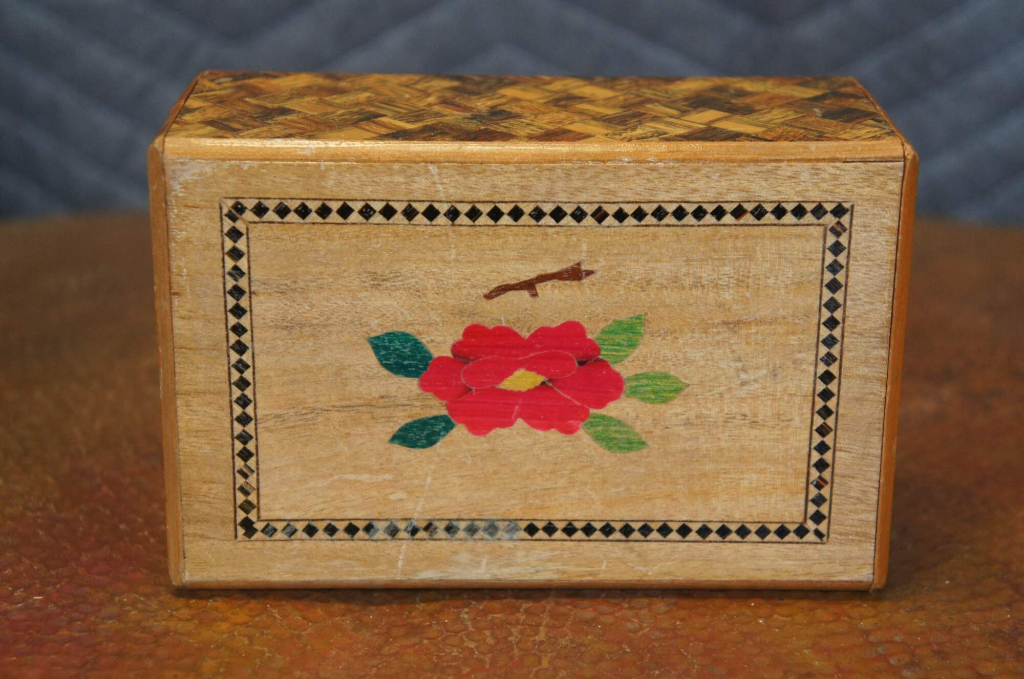 Mid 20th century souvenir type wooden puzzle gift box. Features a geometric checkerboard pattern on the sides and inlaid design of a brightly colored Japanese landscape on the lid - featuring a cottage, bridge and Mount Fuji - and flower on the base. Five step puzzle opens to a single secret compartment.