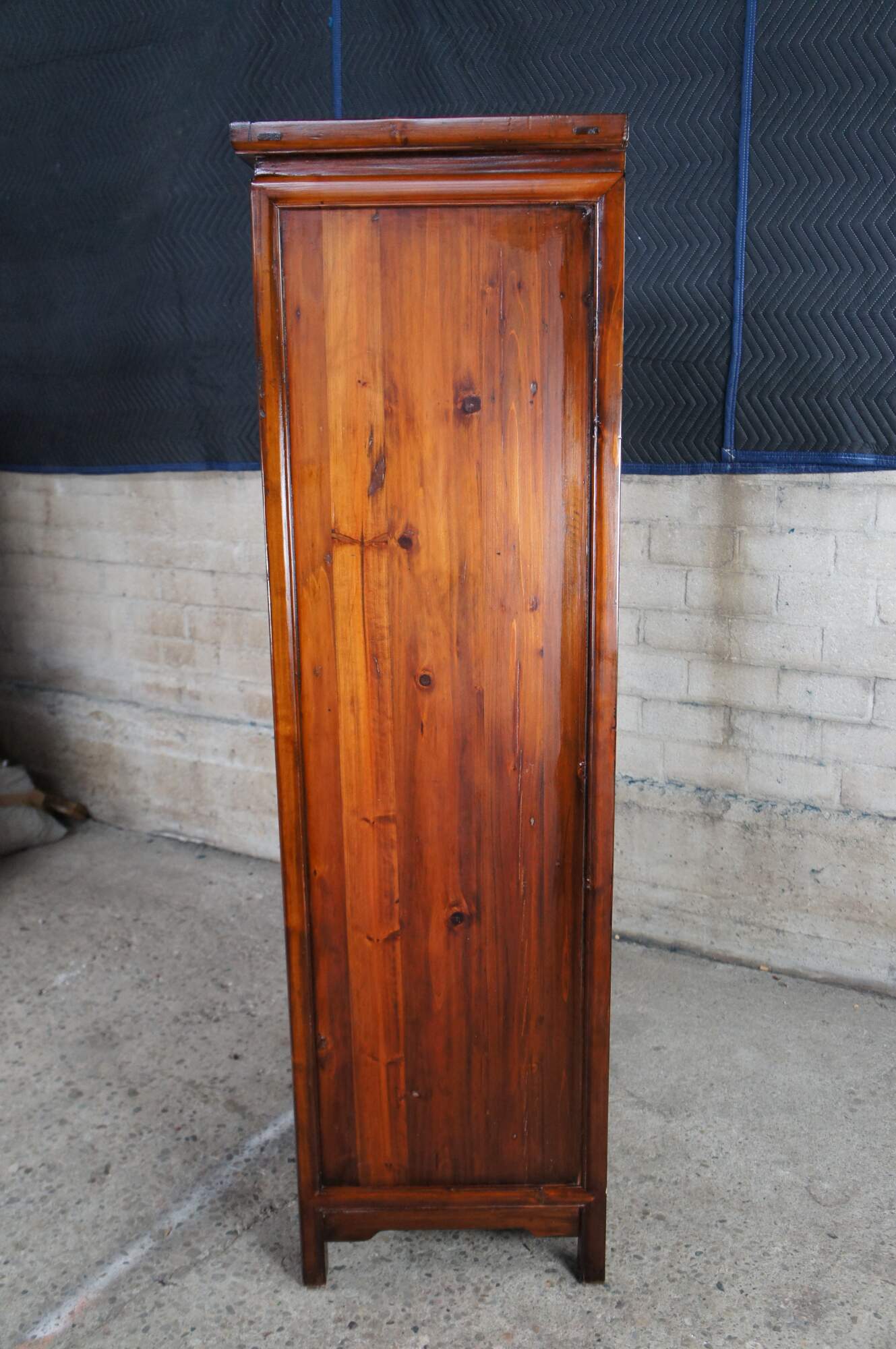 An exquisite Antique 19th Century Qing Dynasty Apothecary Medicine Cabinet. Made from Elm with 18 dovetailed drawers over a lower covered storage space. Lower cabinet doors showcase beautiful fretwork and open via brass pulls. Upper Apothecary drawers are accented by ornate brass batwing hardware.