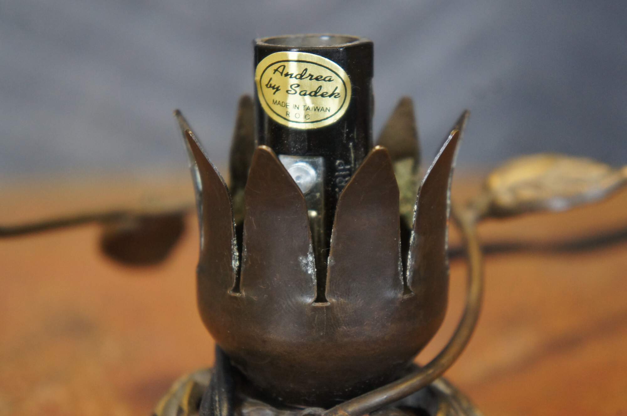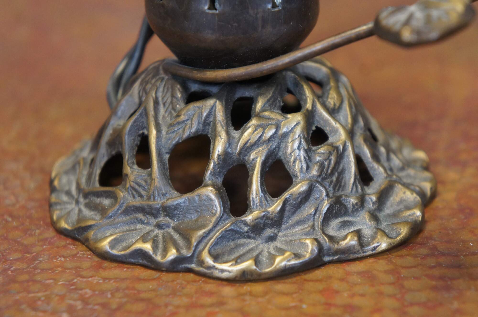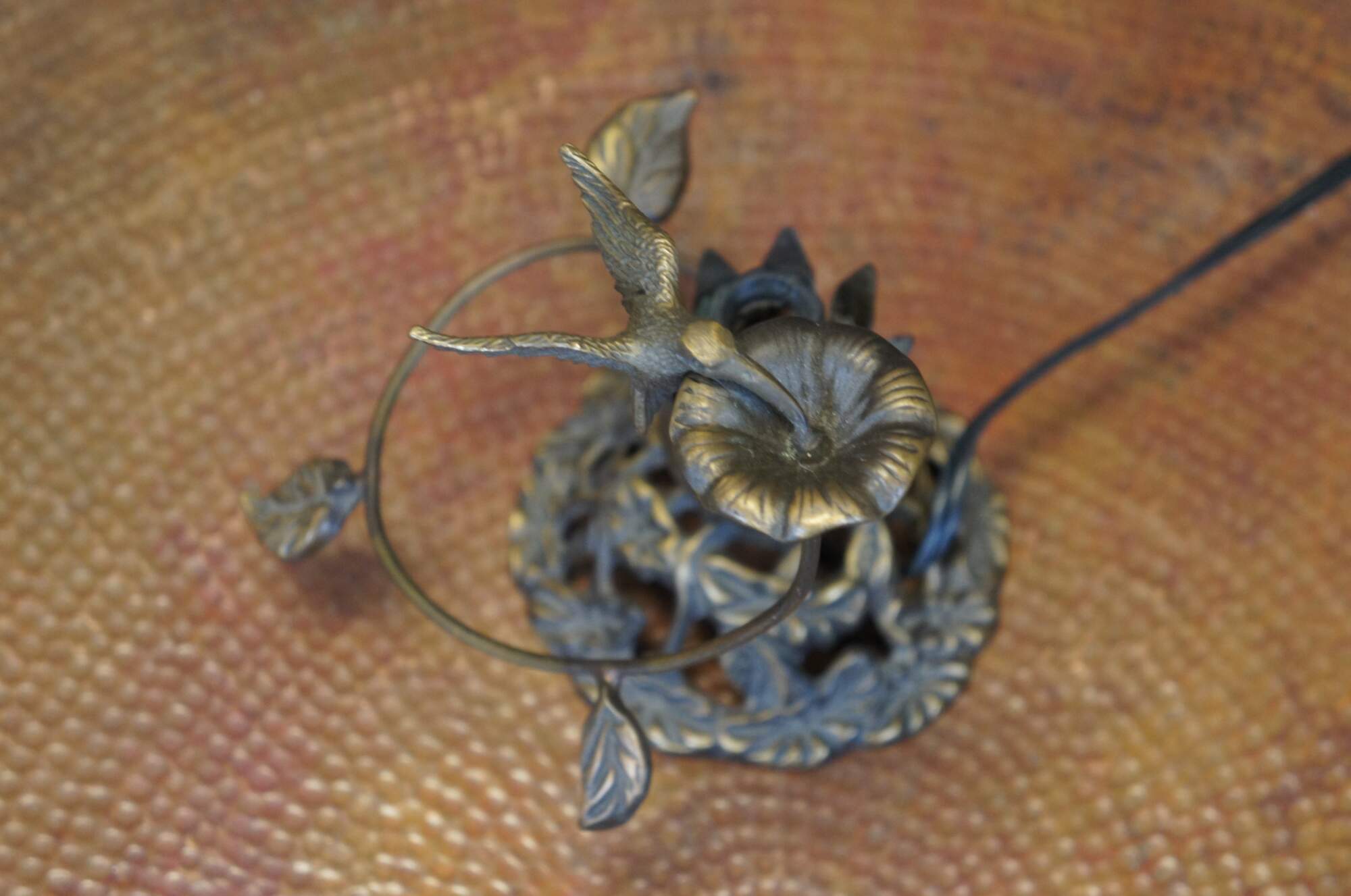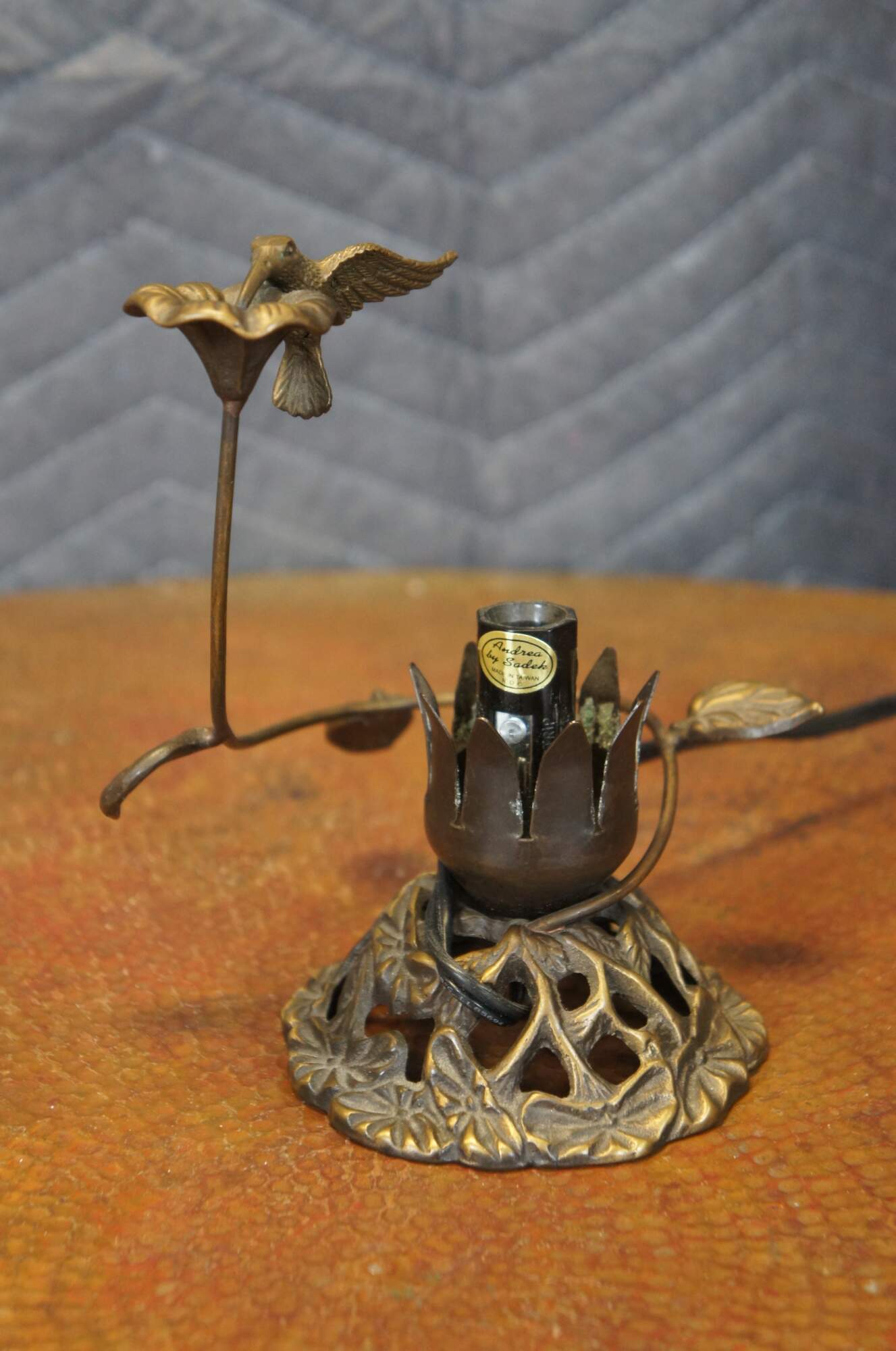 Late 20th century Andrea by Sadek, art nouveau night light / budoir lamp featuring a base of morning glories around a tulip shaped socket, encircled by the stem of another flower blossom, being sampled by a hummingbird. Missing shade.