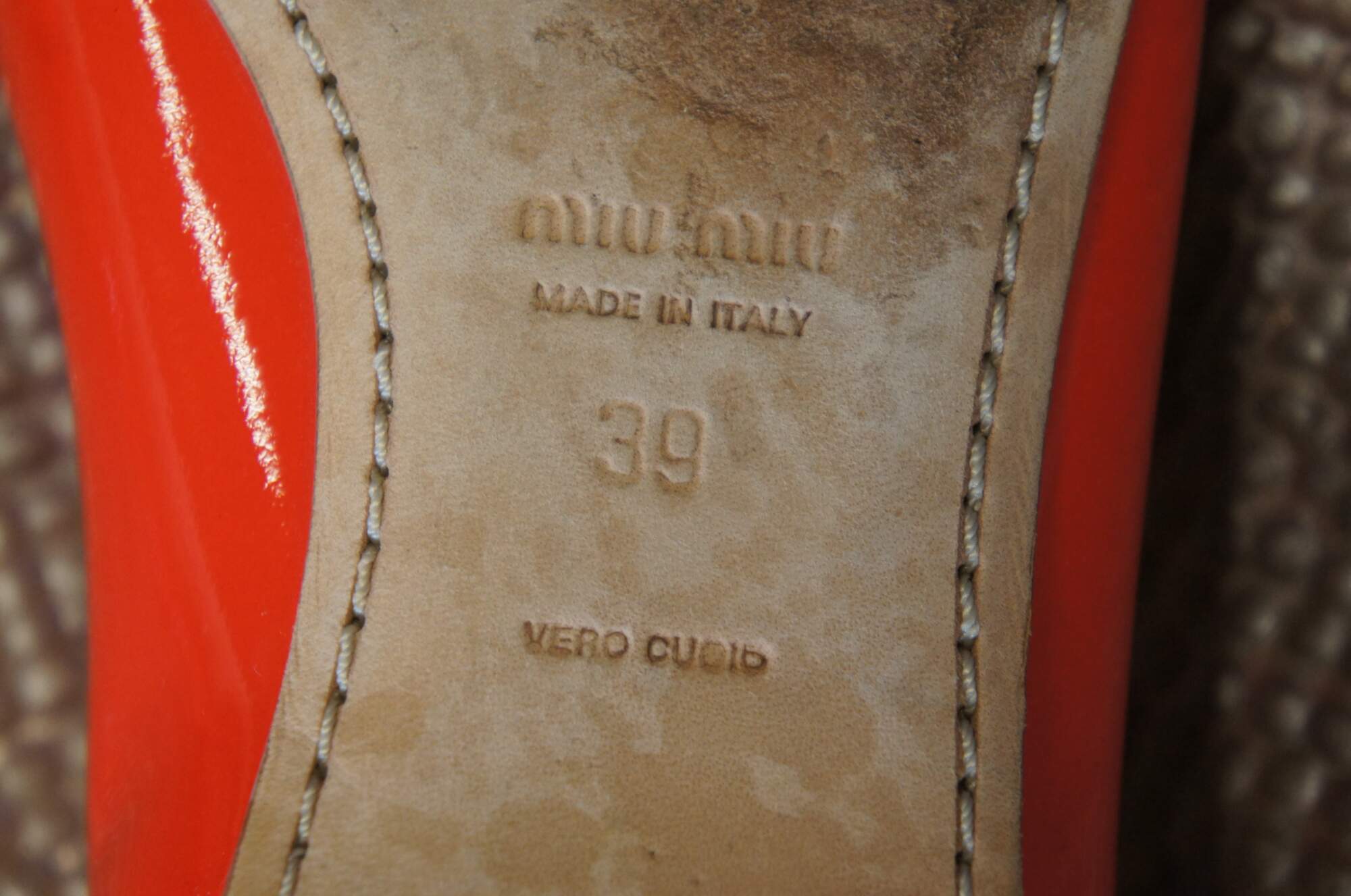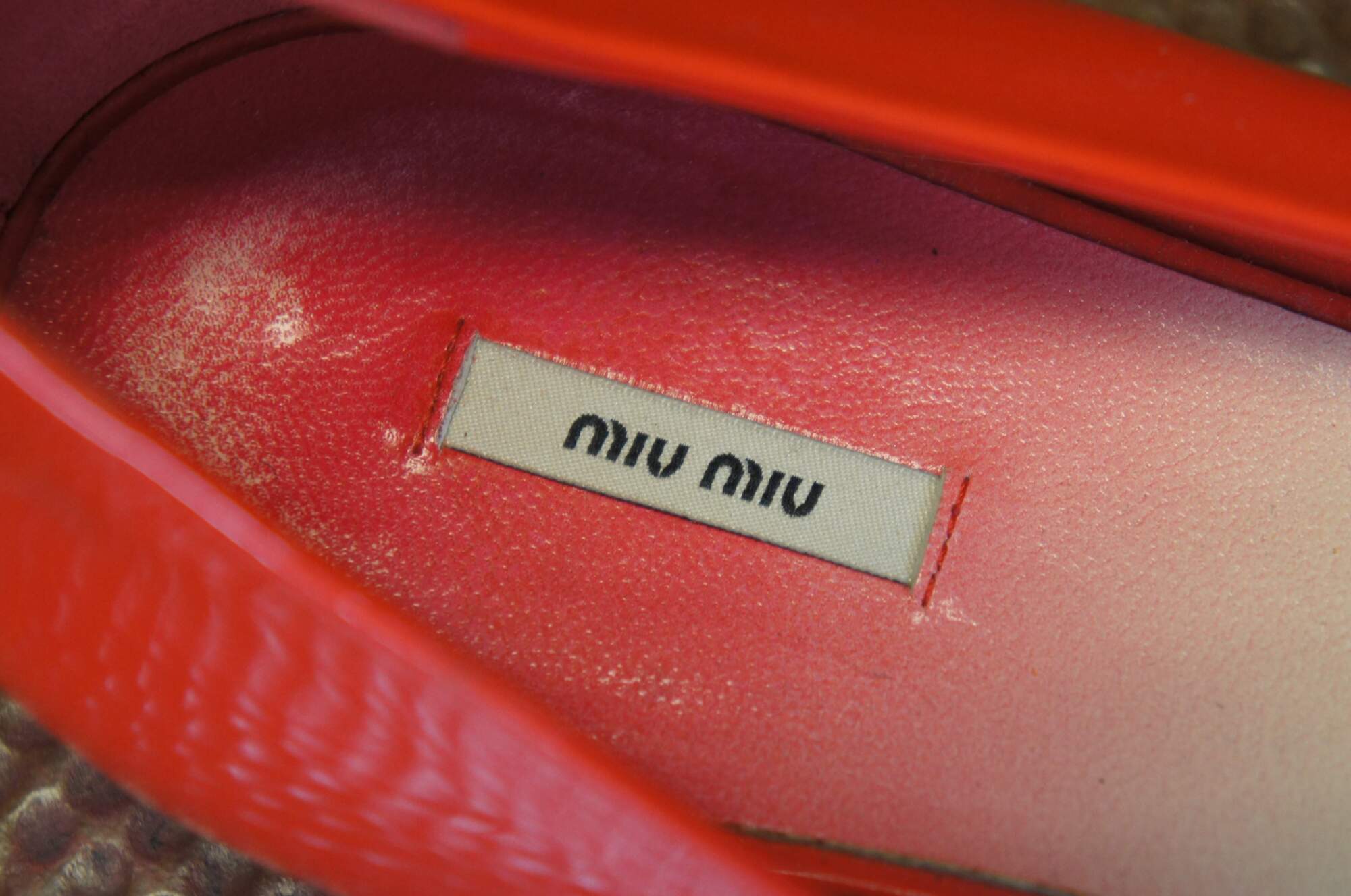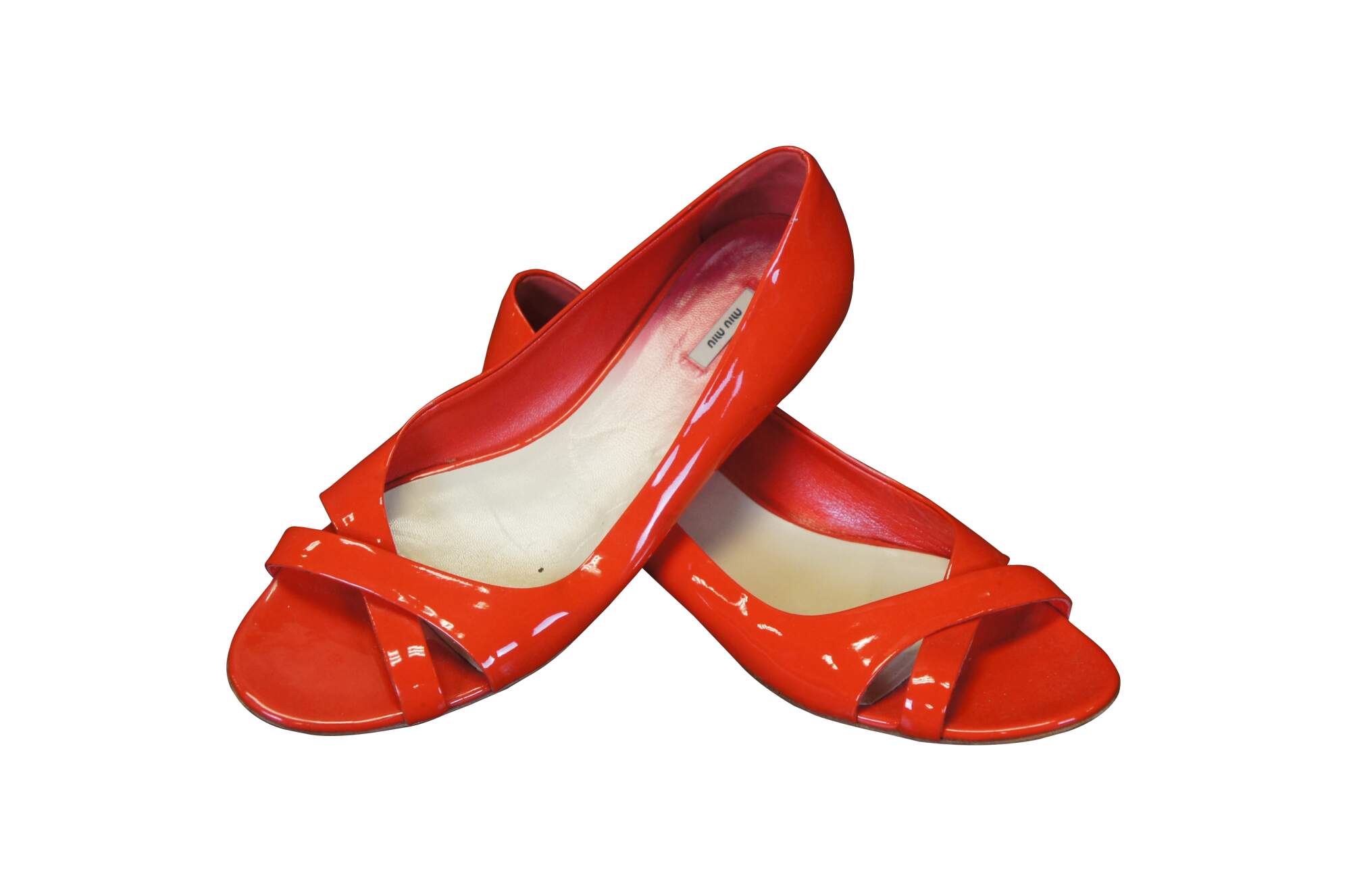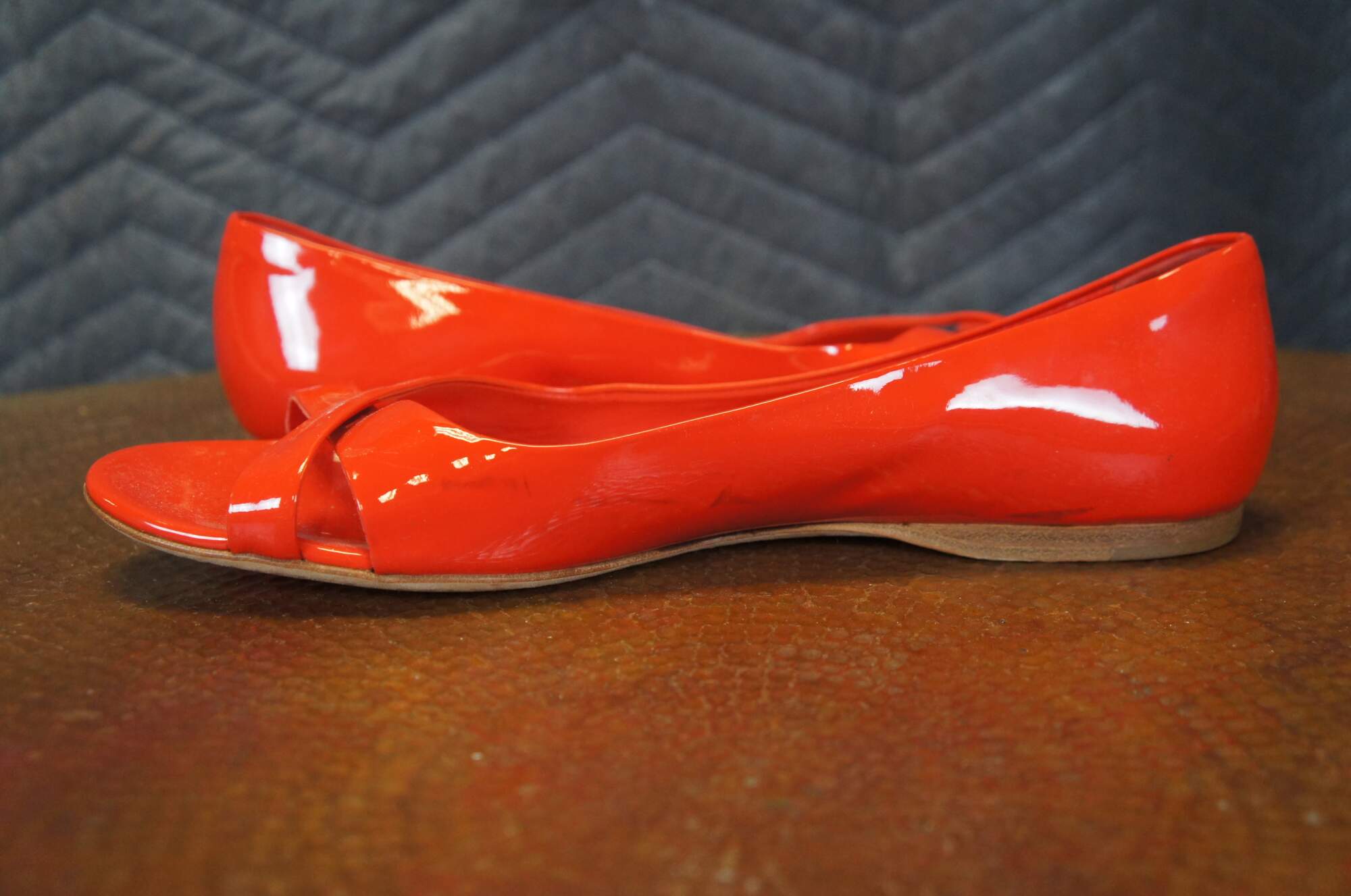 Vintage Miu Miu coral / red-orange patent leather ballet flats / shoes with crossed strap peep toe. Slip on. Made in Italy.