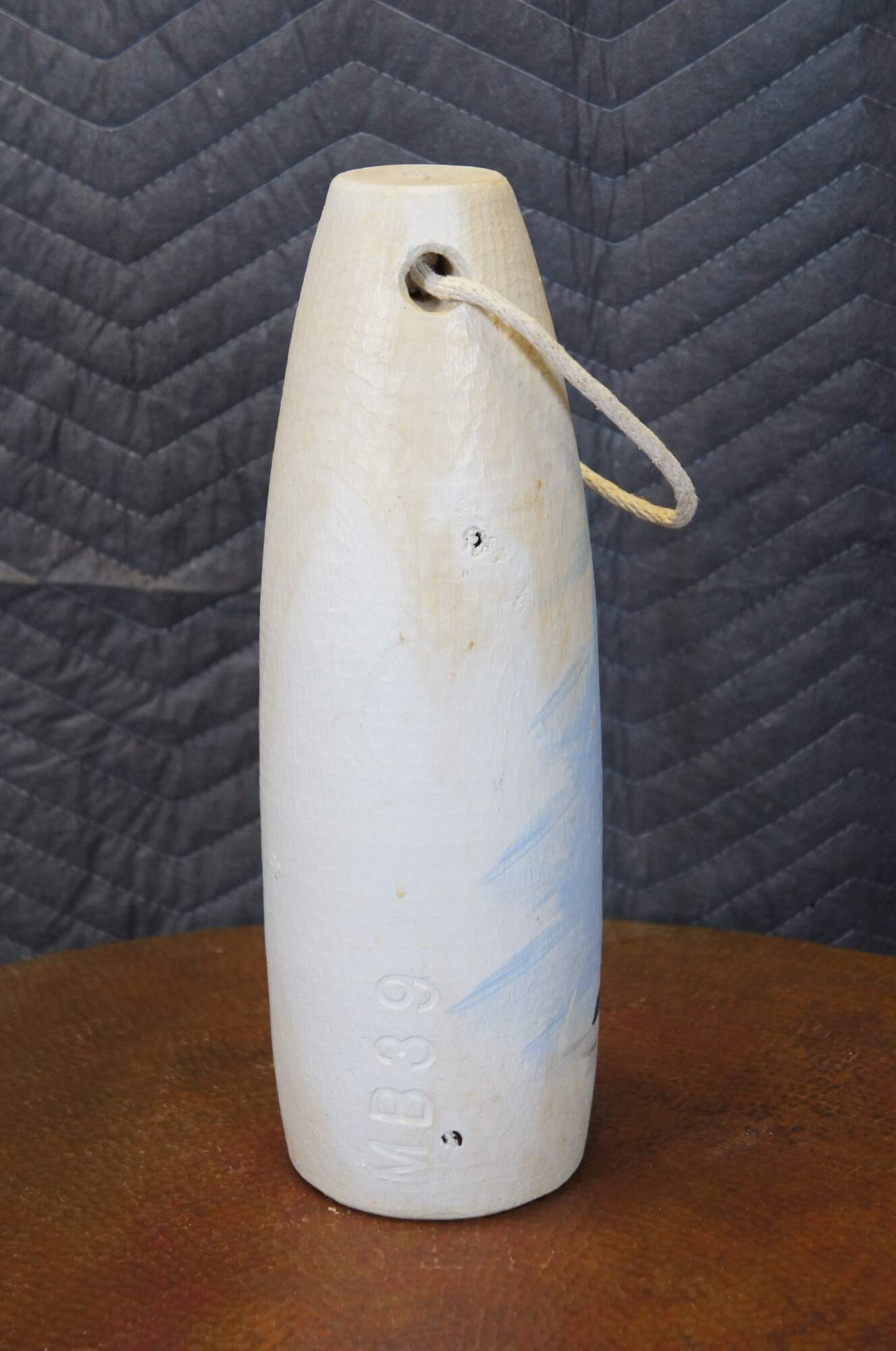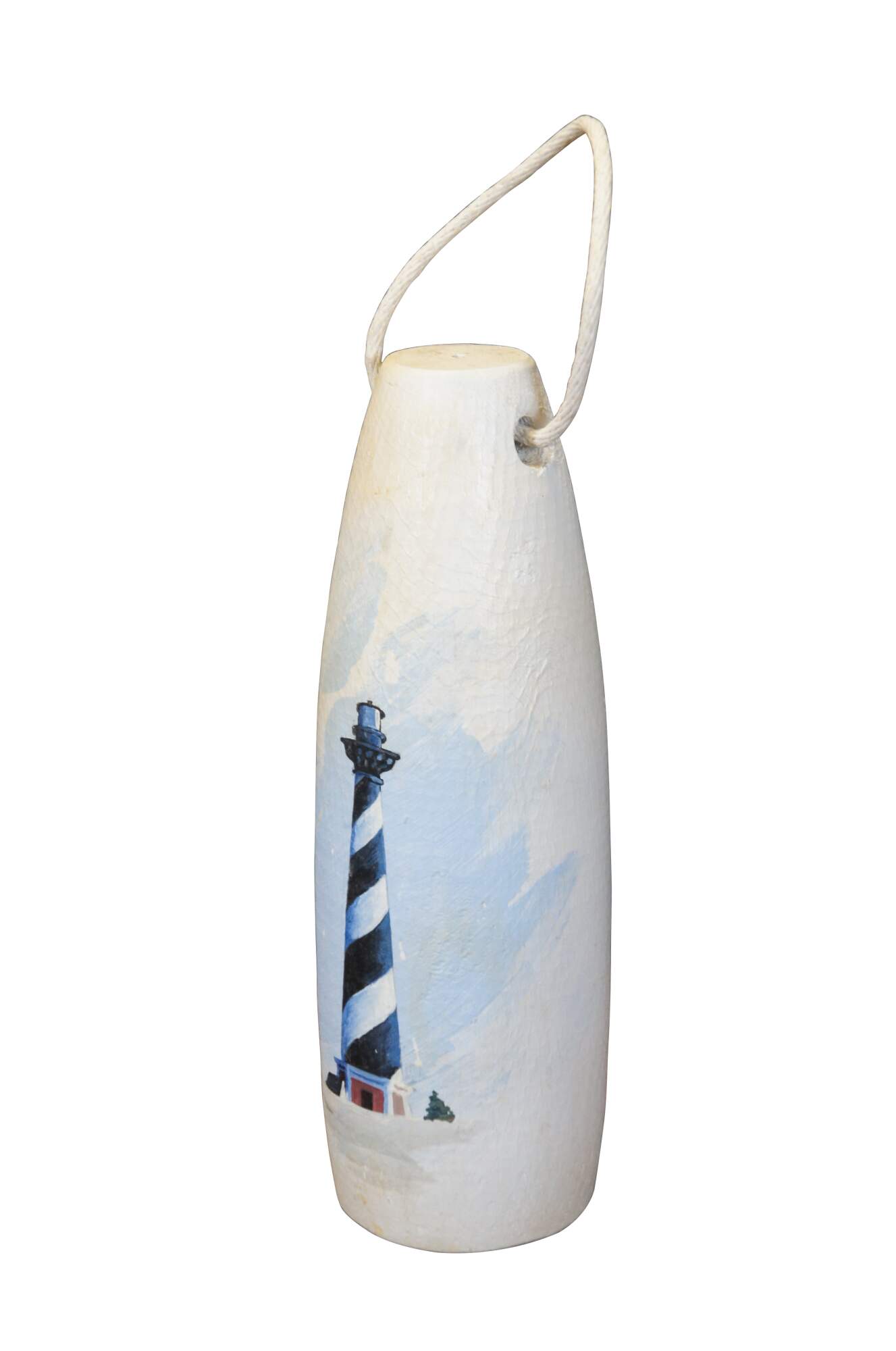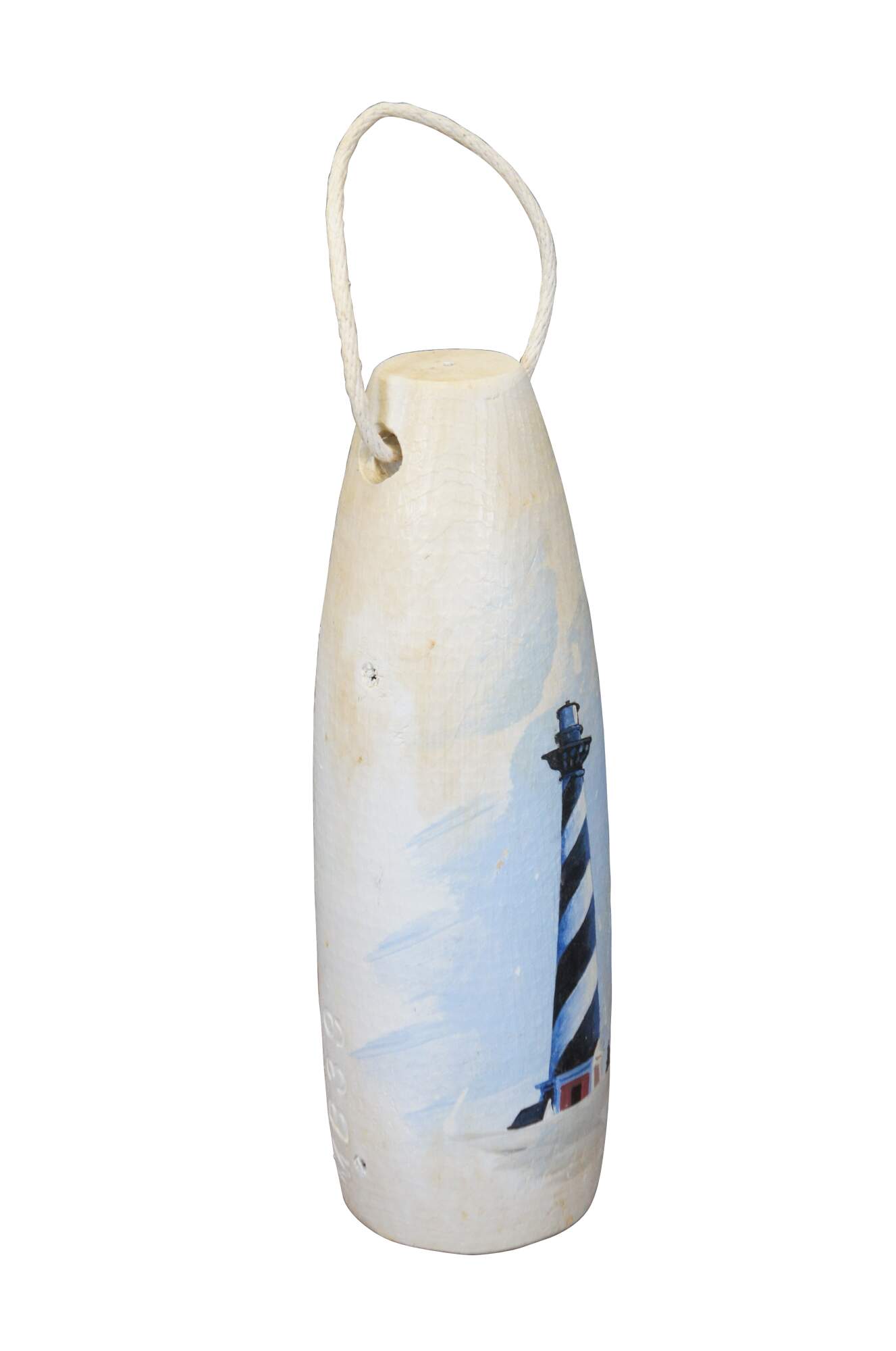 Vintage hand carved wooden crab / lobester trap float / buoy, number MB39, folk art painted in white with the image of the black and white striped Cape Hatteras Lighthouse.