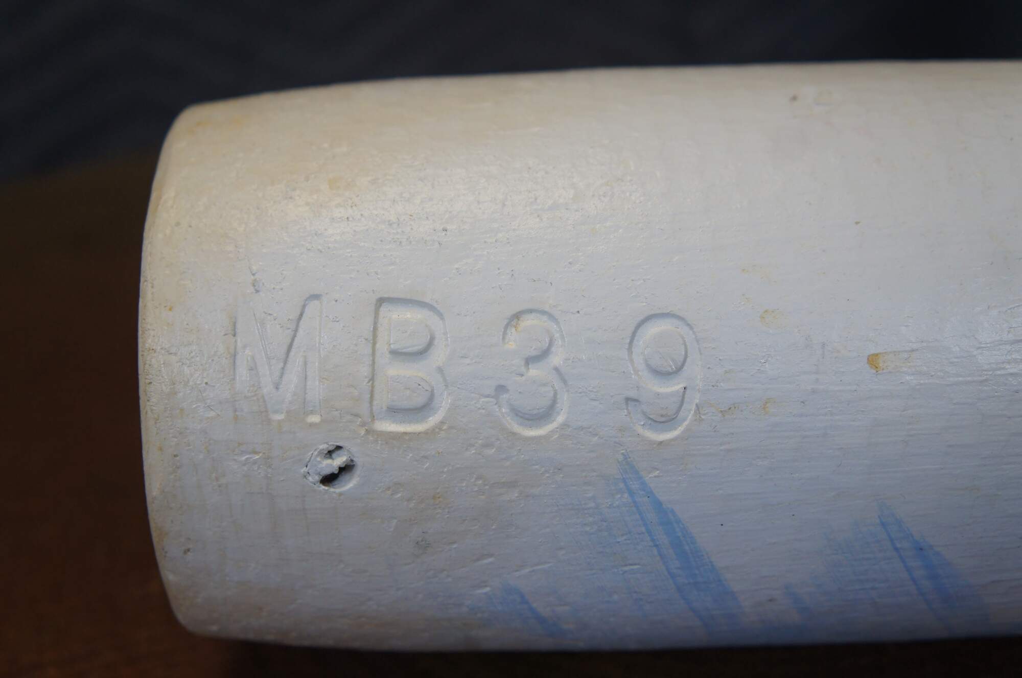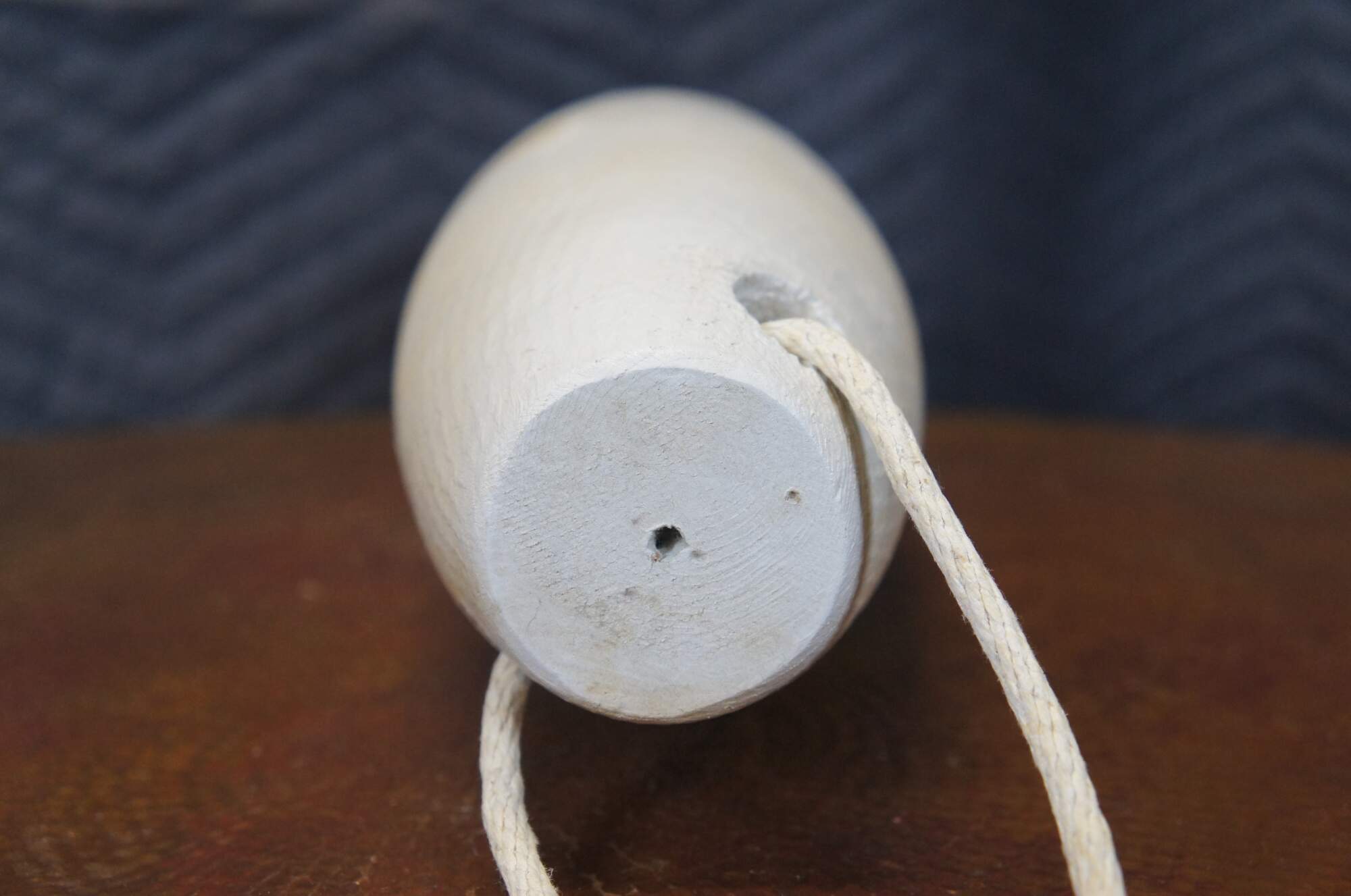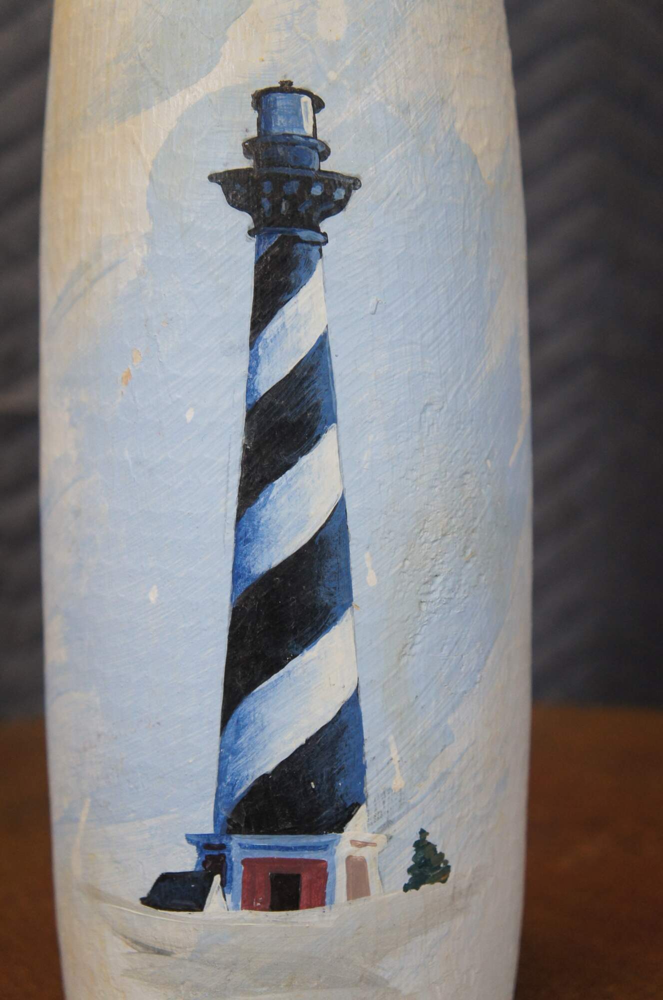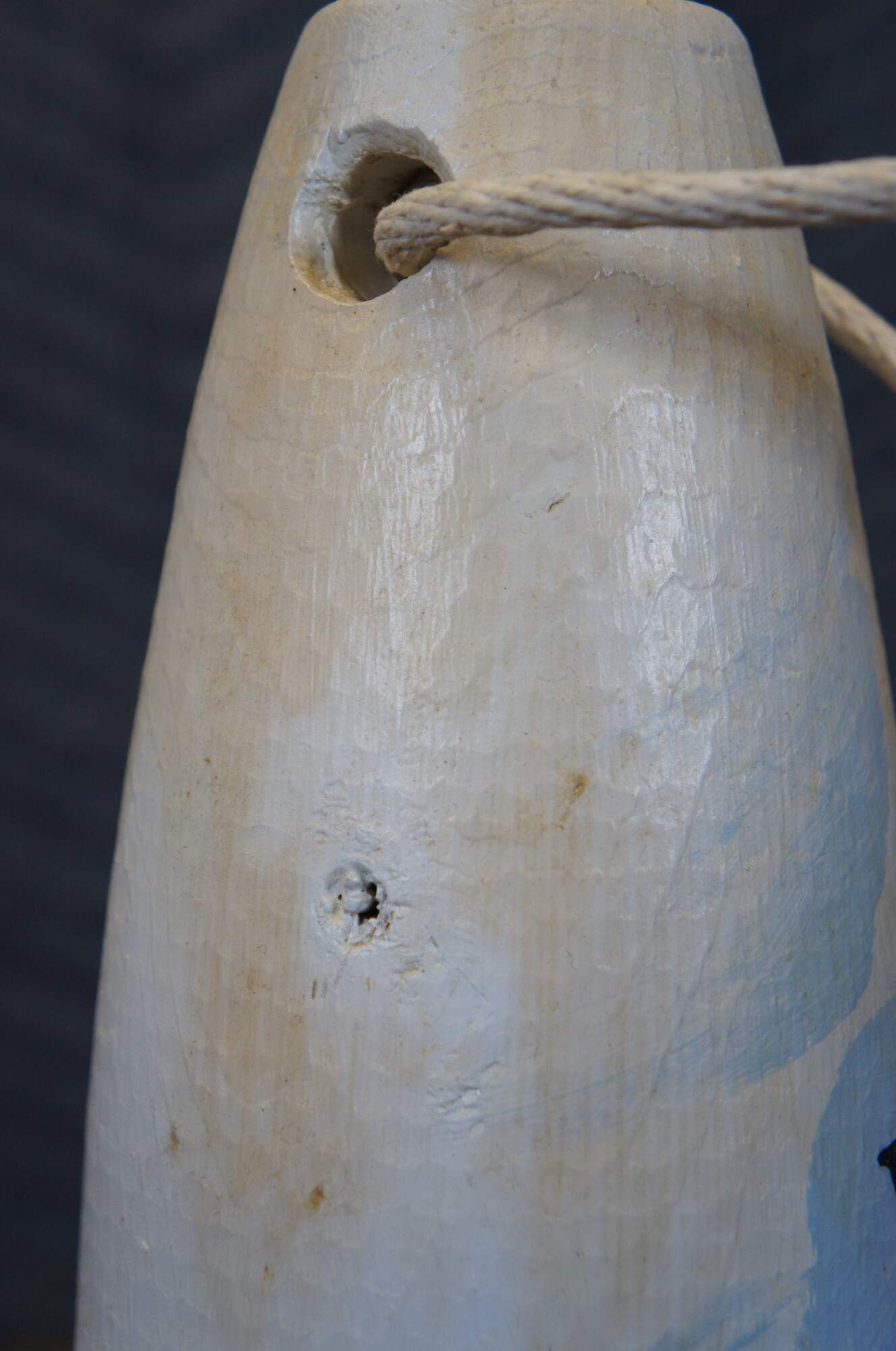 Vintage hand carved wooden crab / lobester trap float / buoy, number MB39, folk art painted in white with the image of the black and white striped Cape Hatteras Lighthouse.