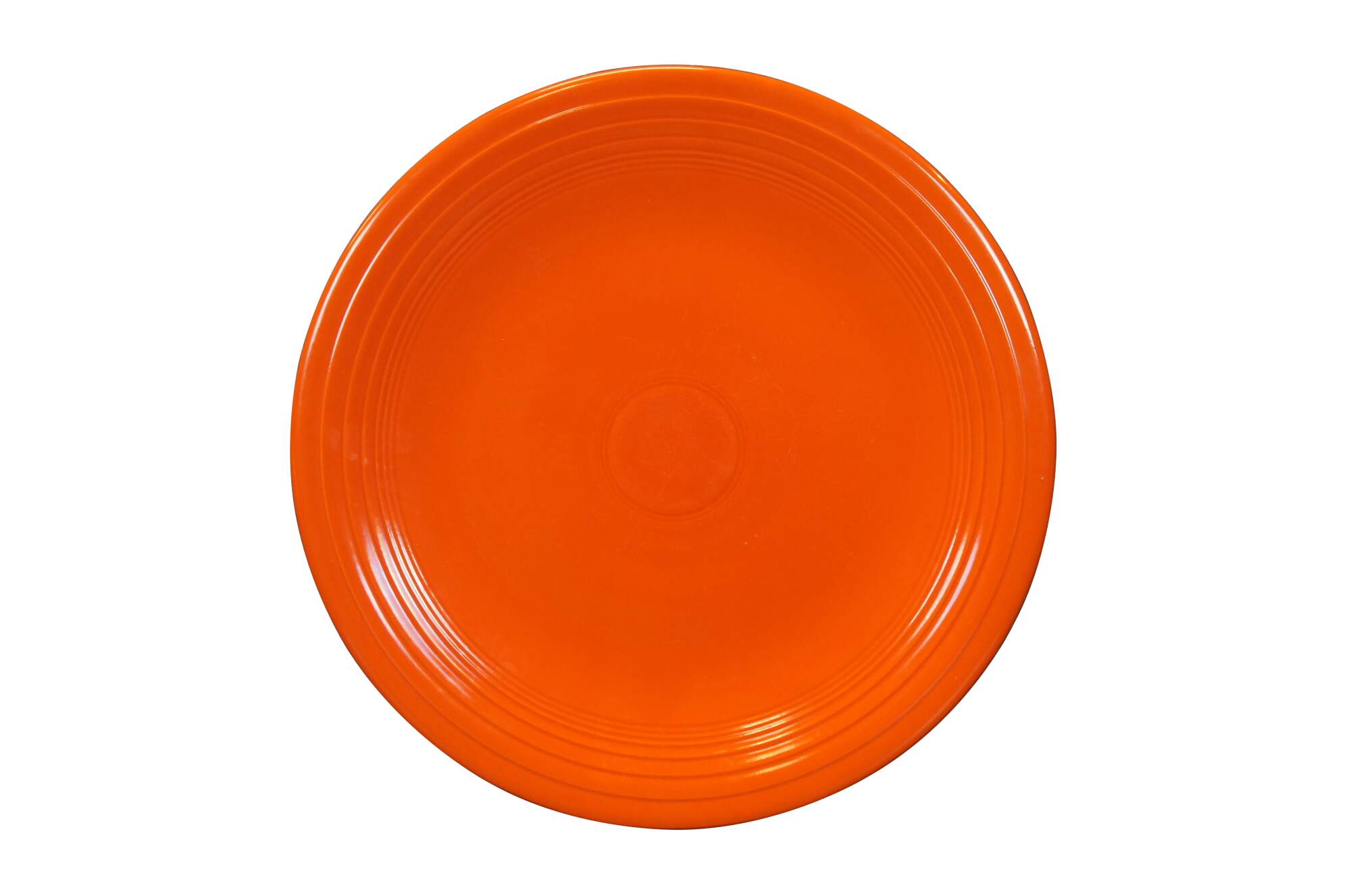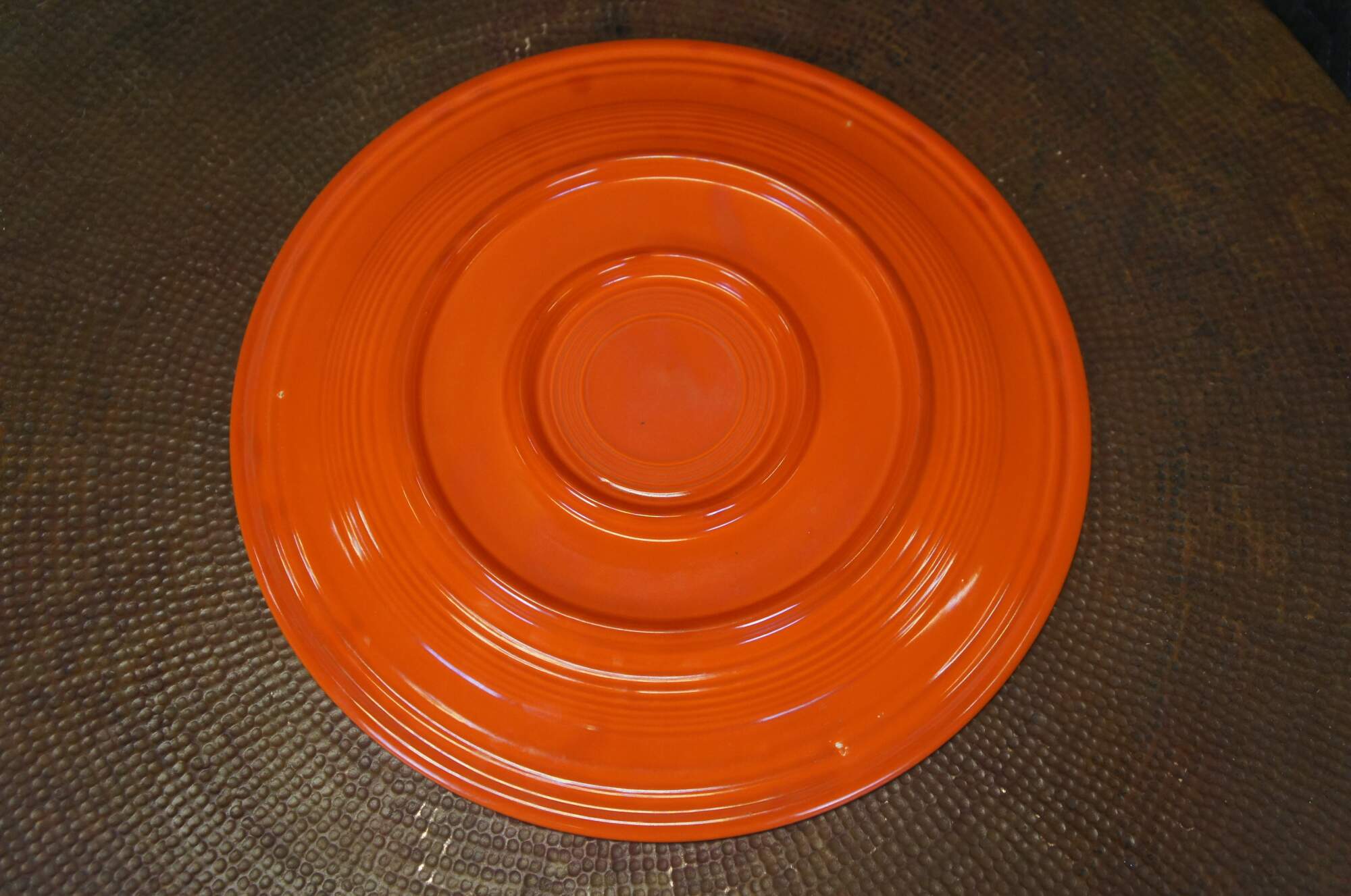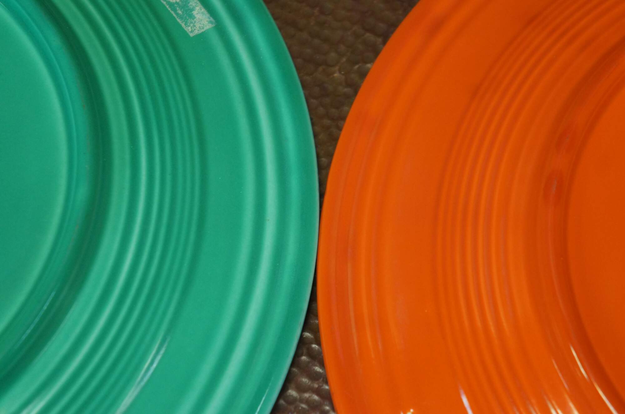 Pair of antique (1936-1942) Fiesta Ware chop plates / round serving platters in Radioactive red / burnt orange and light to medium green.