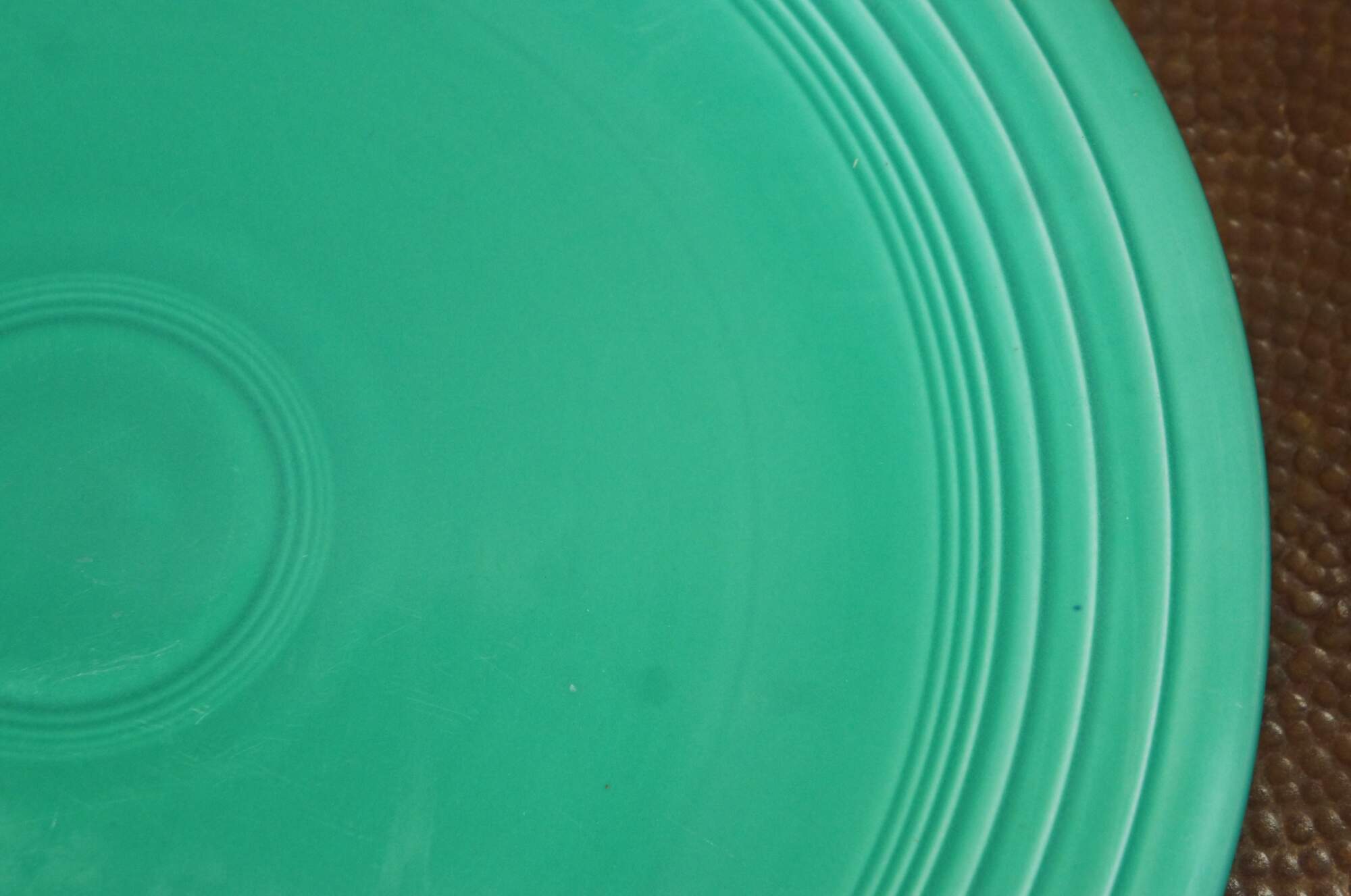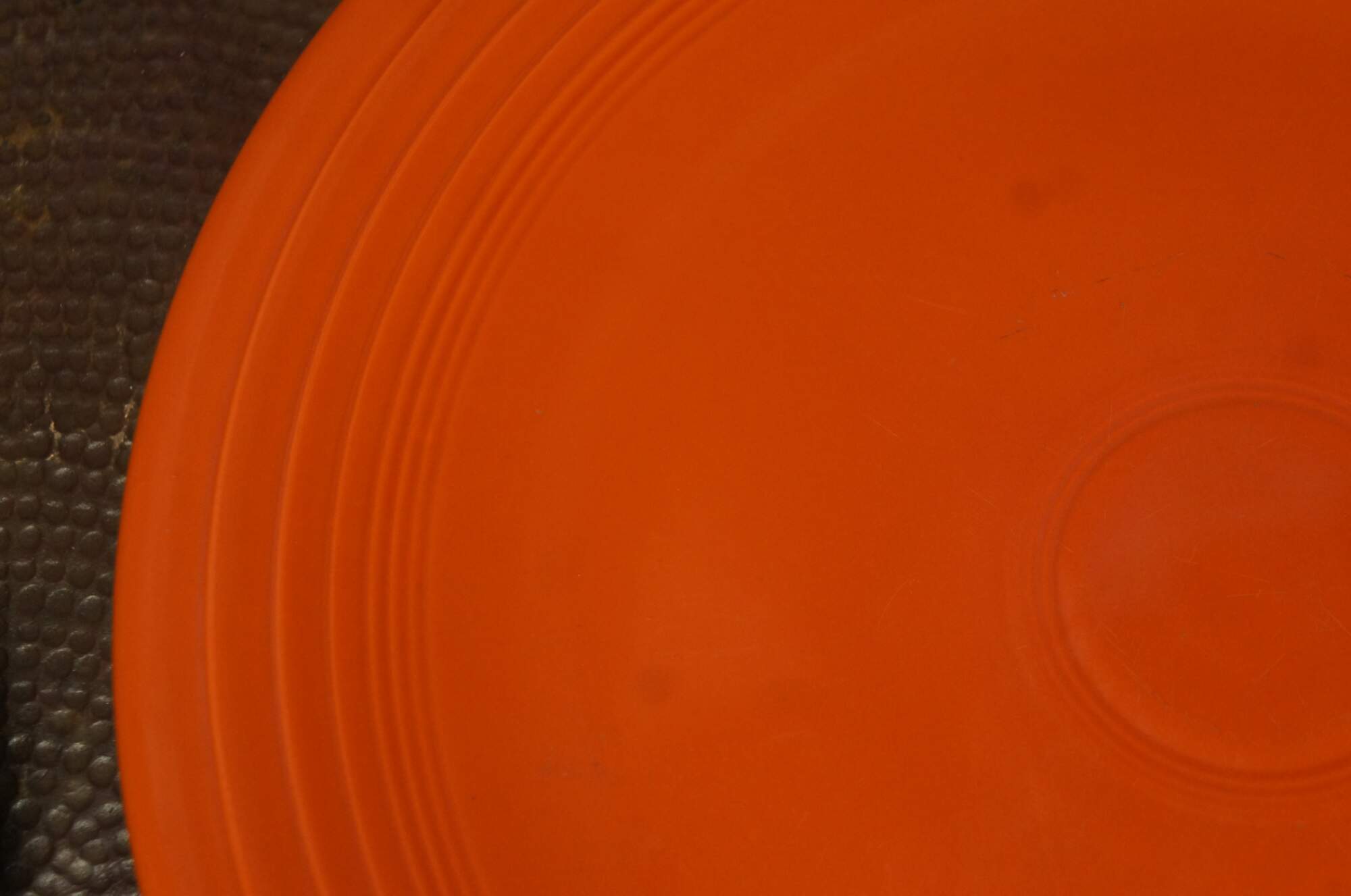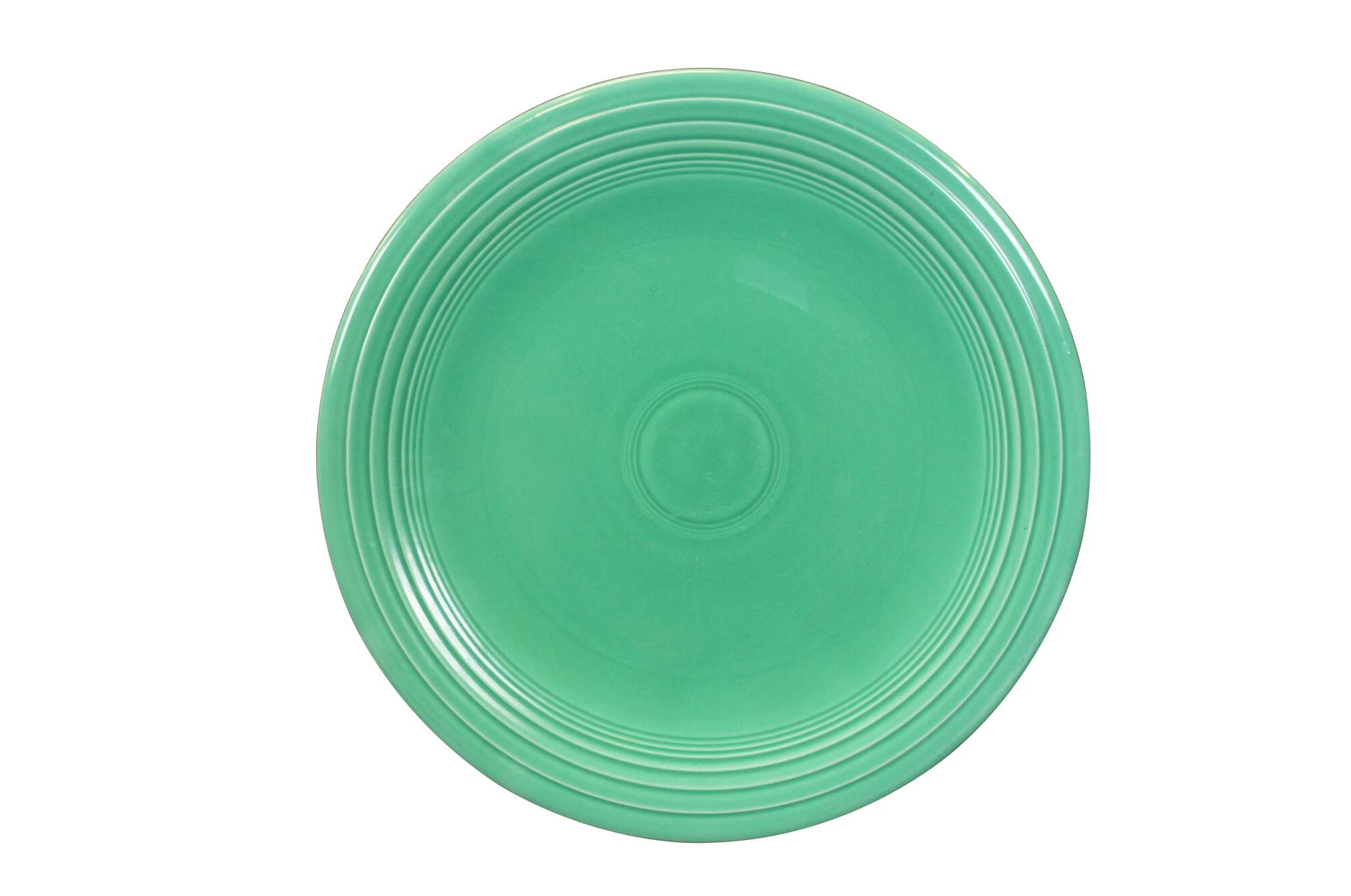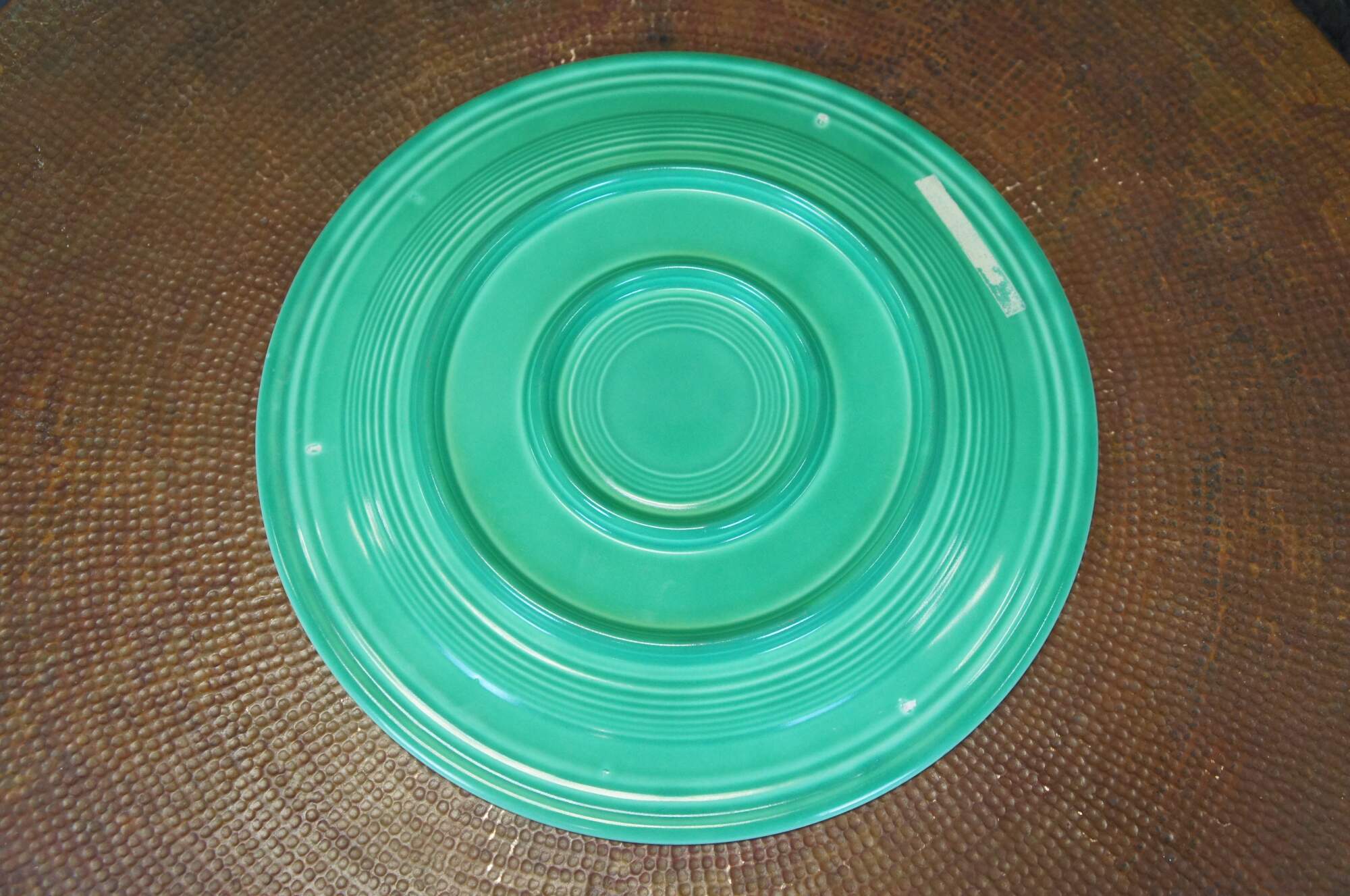 Pair of antique (1936-1942) Fiesta Ware chop plates / round serving platters in Radioactive red / burnt orange and light to medium green.