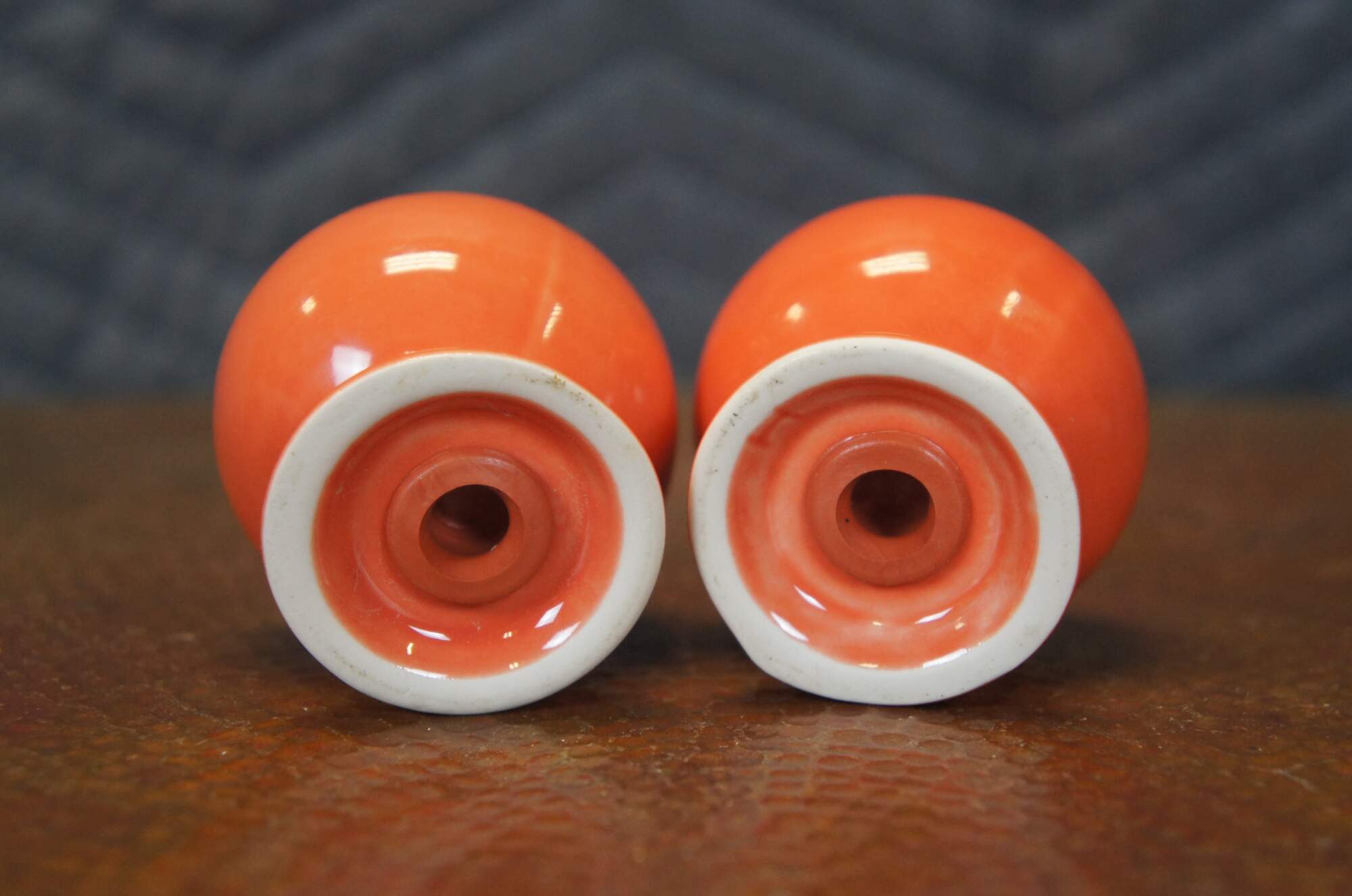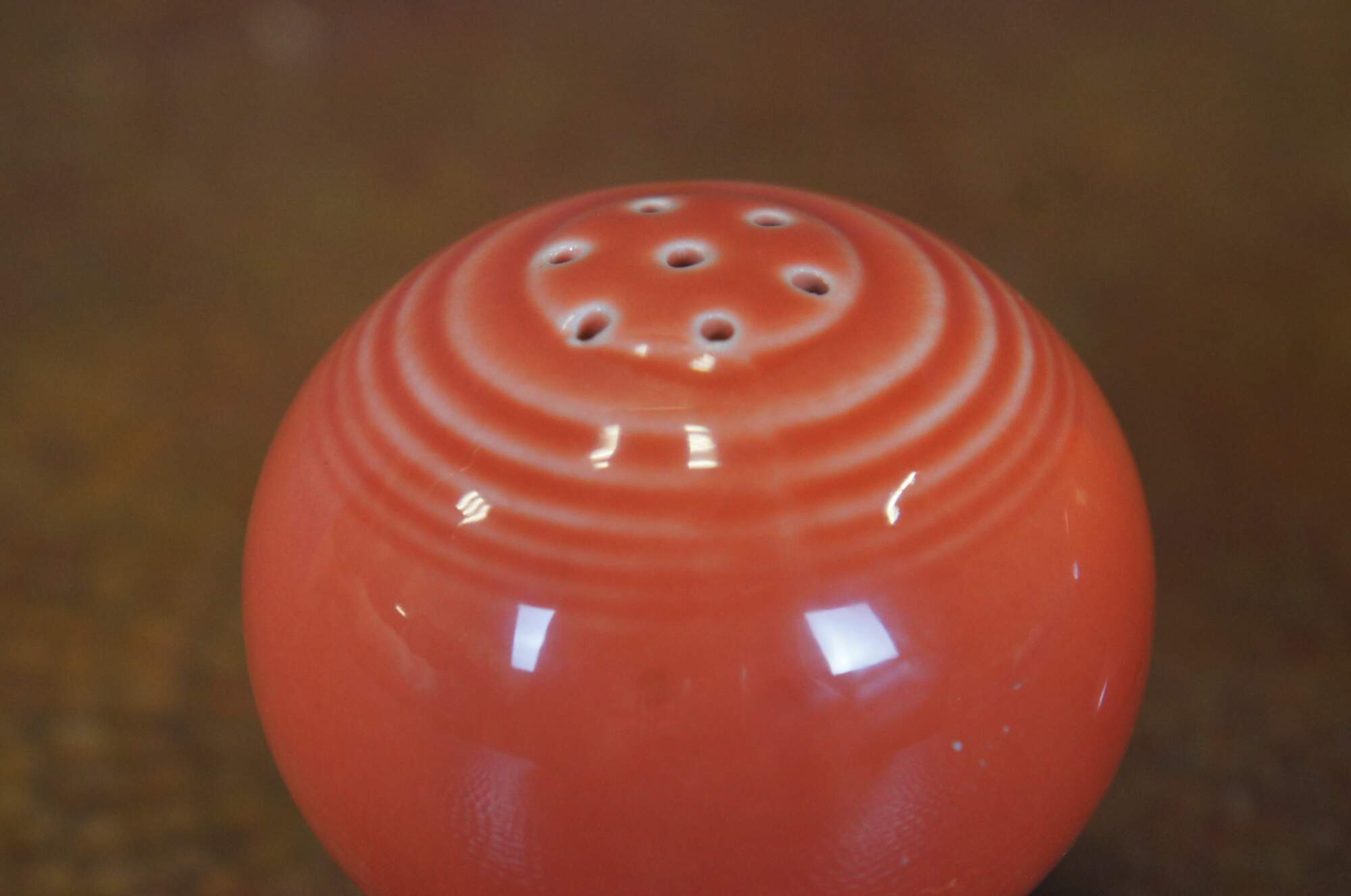 Pair of vintage Fiesta Ware salt and papper shakers - round body with flared base in orange-pink (Persimmon).