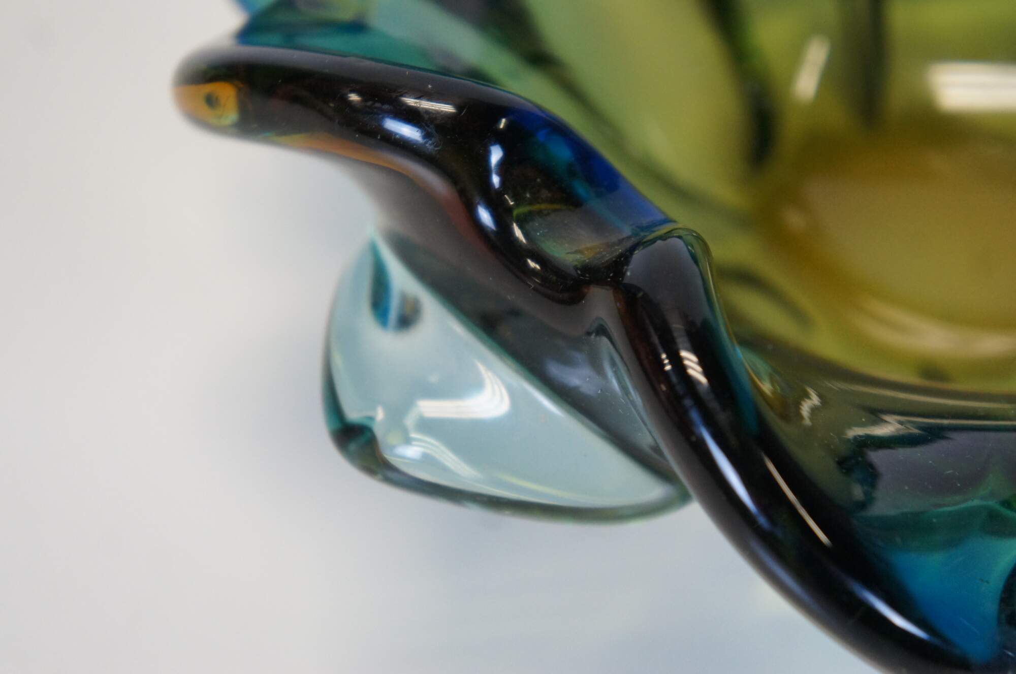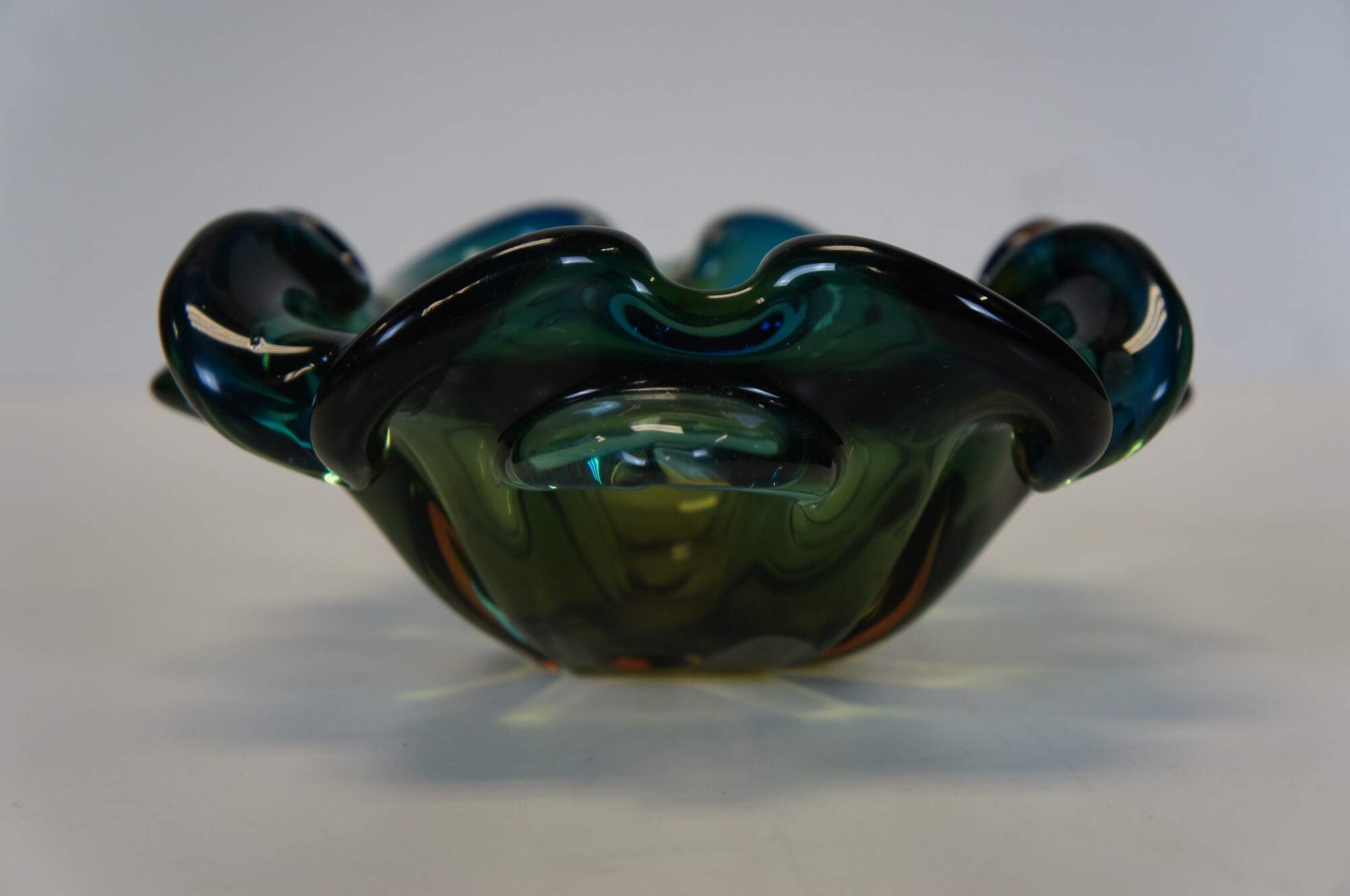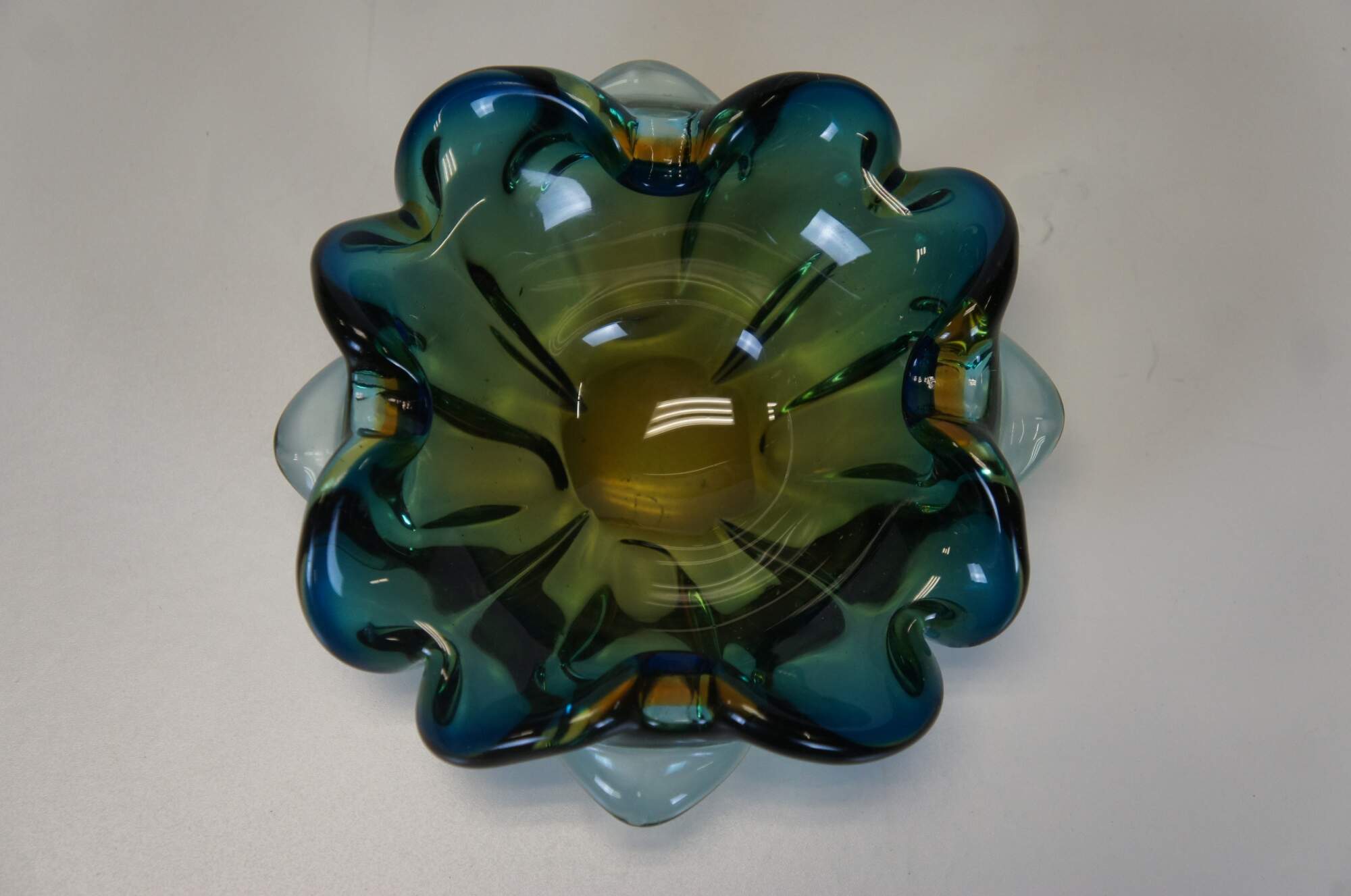 Circa mid 20th century Barovier Toso Murano / Italian hand blown art glass bowl / candy dish / ashtray featuring a freeform flower petal shape and blended navy blue and mustard yellow coloring. Thick / heavy. Flattened, polished base.