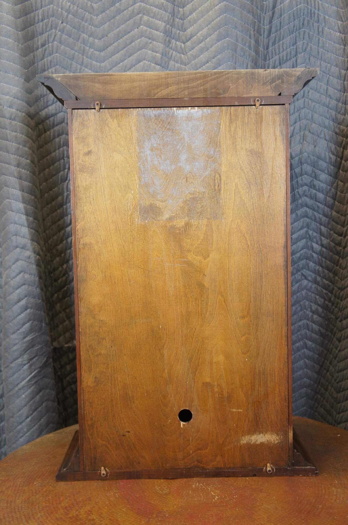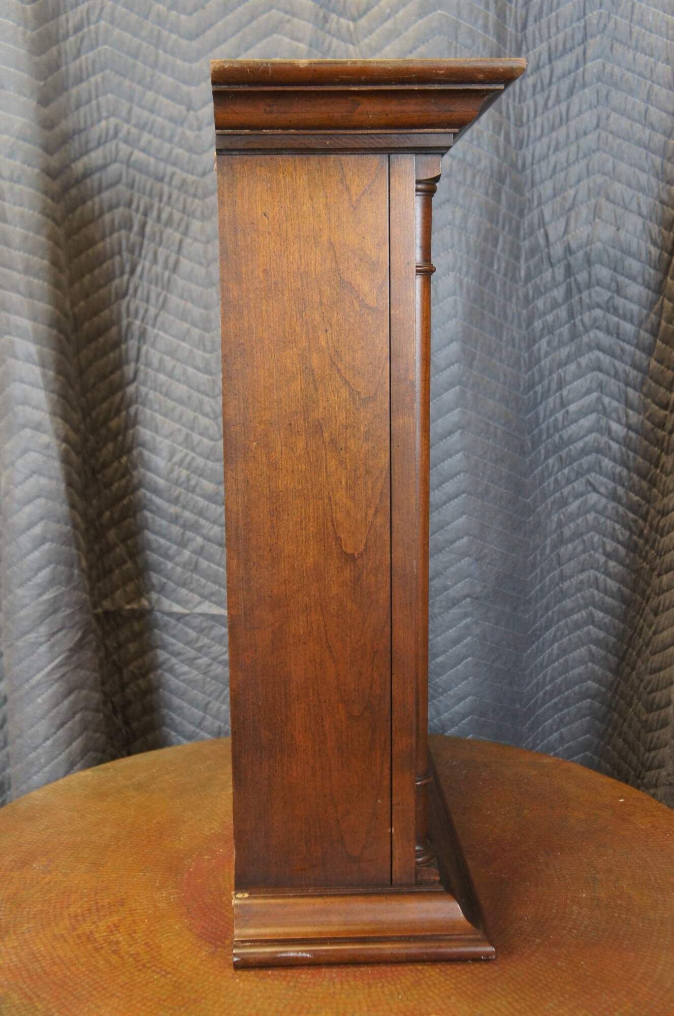 Vintage Howard Miller / Barwick Clock Division model 4996 mantel clock case / cabinet. Sturdy hardwood rectangular form with stepped pediment at top and bottom and two pane glass front flanked with simple turned columns / pillars. Perfect to house fresh clock works or to be given a new life repurposed as a curio cabinet.