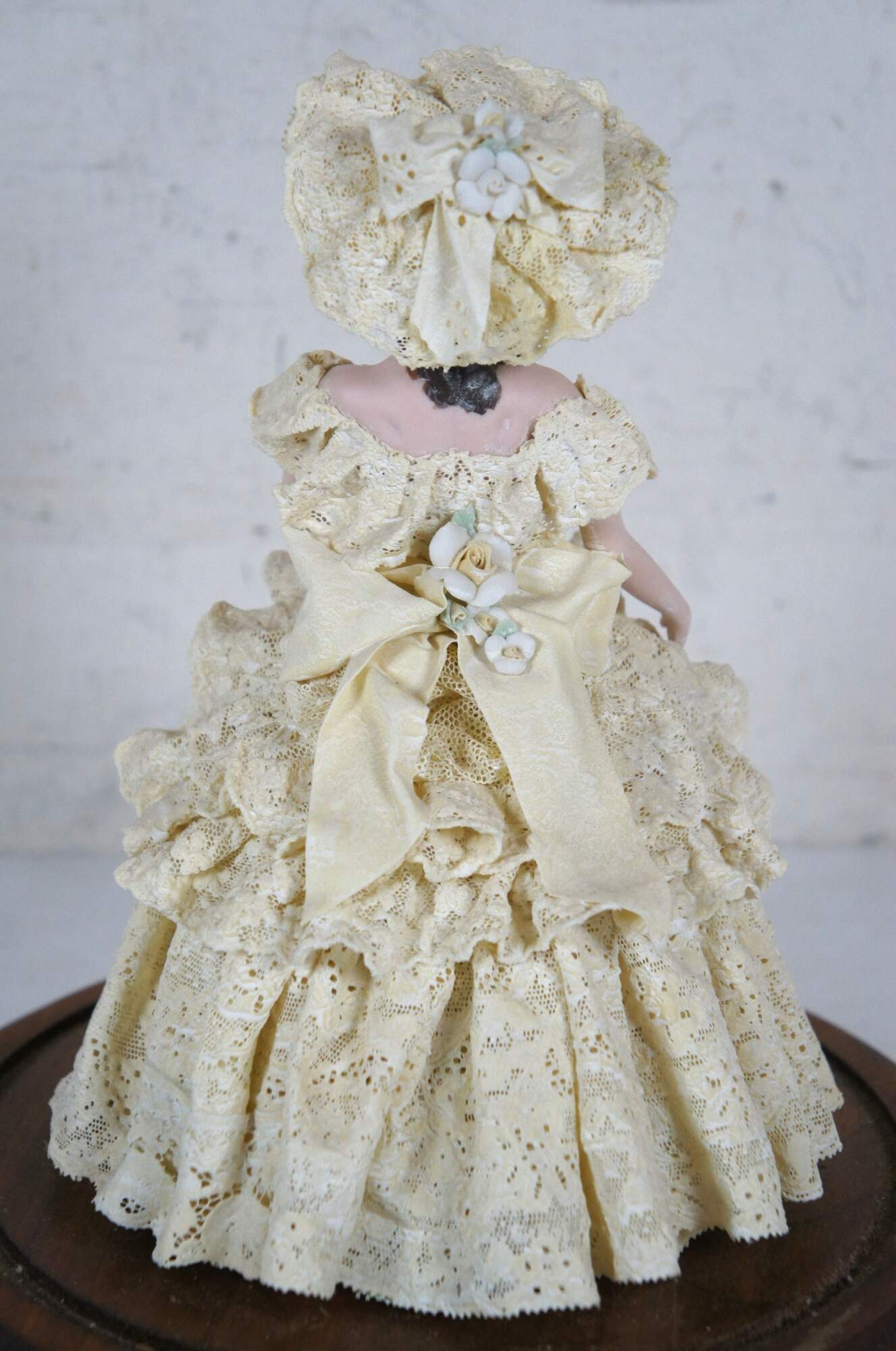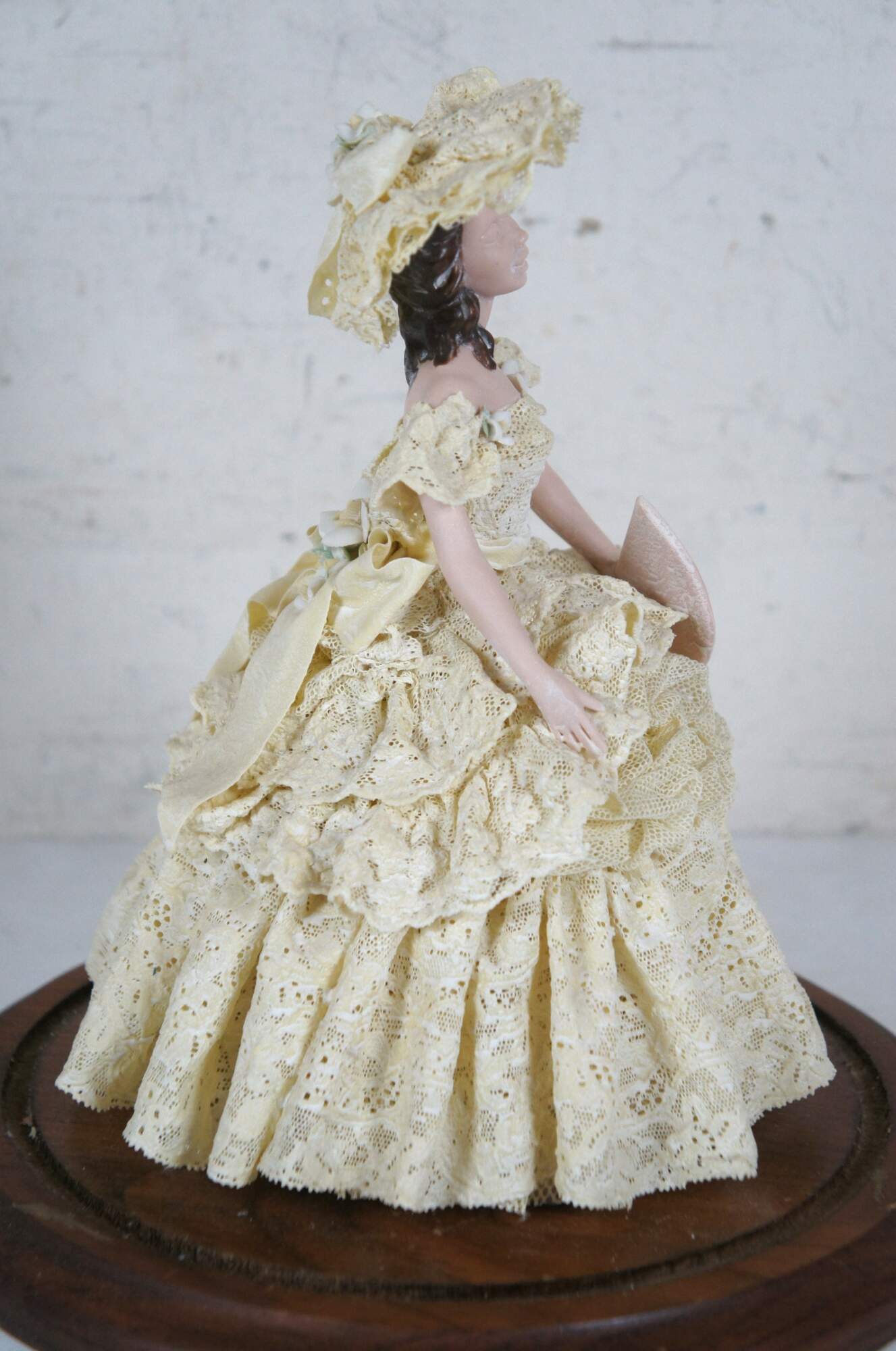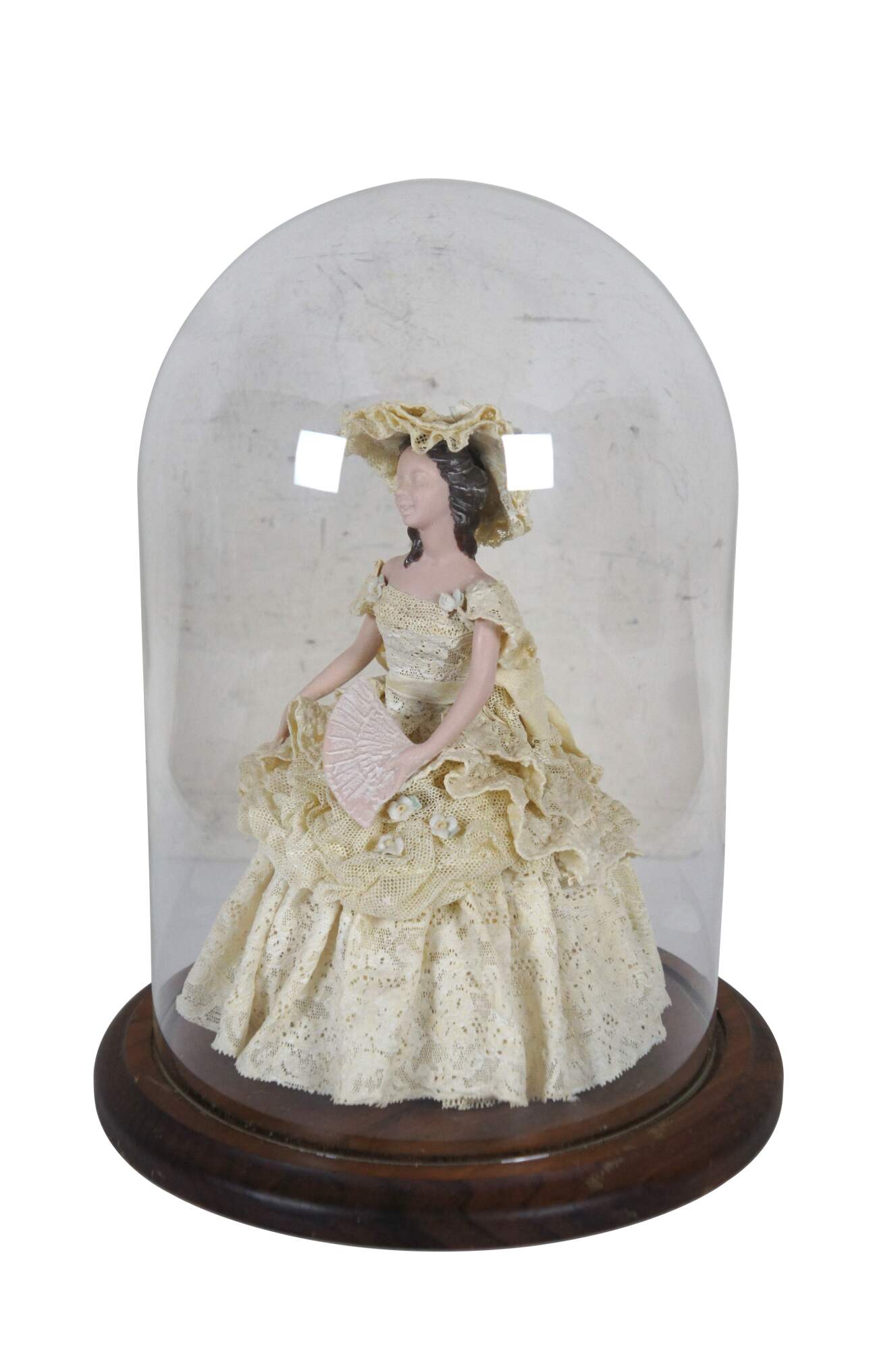 Circa mid 20th century unglazed figurine of a woman with brown hair and a fan in one hand, dressed in a circa 1860s ball gown and bonnet of off white porcelain lace and small roses. Mounted to round wooden base with apothecary bell jar.