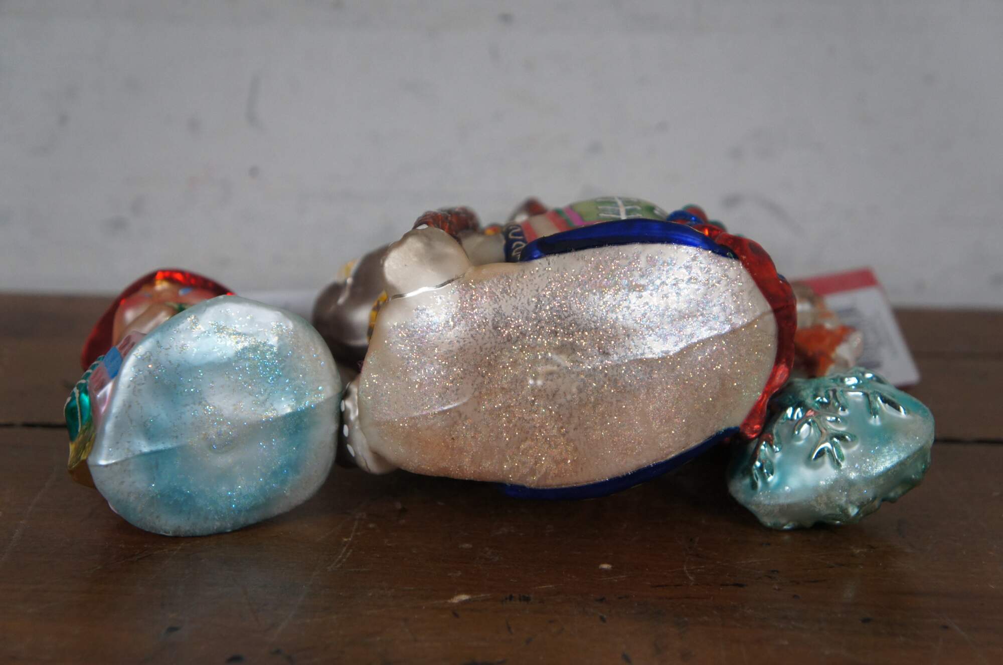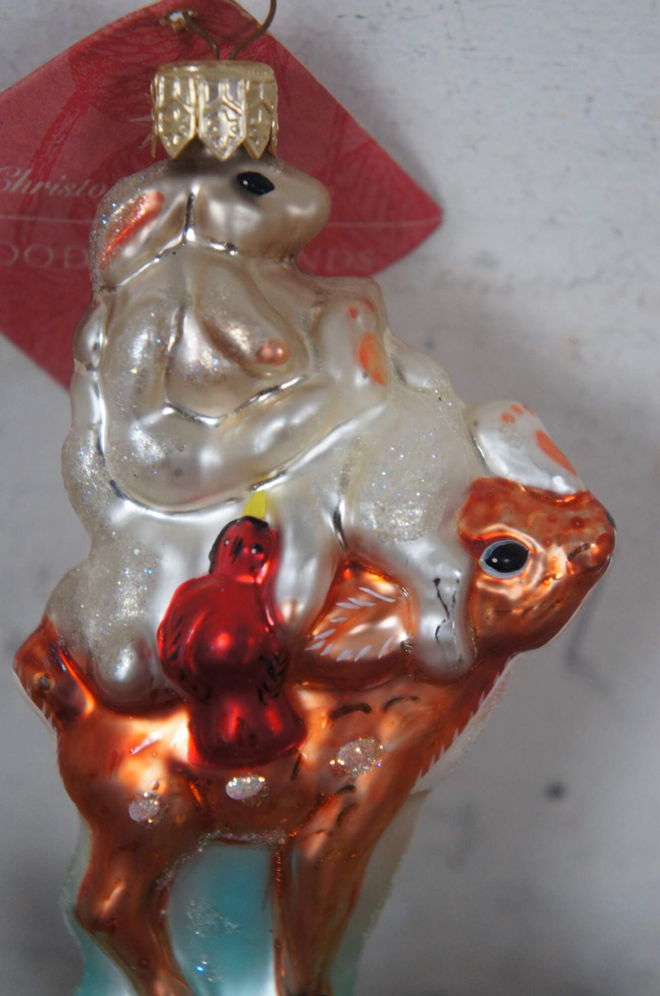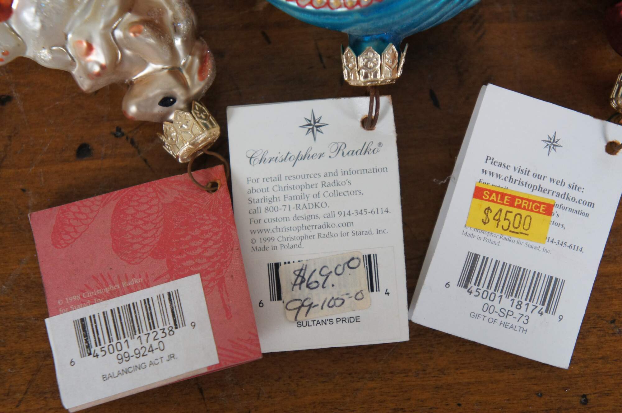 Lot of three late 20th century Christopher Radko for Starad, Inc blown glass, hand painted Christmas / holiday ornaments - Woodland Winds Balancing Act Jr (99-924-0), Sultan's Pride (99-105-0), and 2000 Pediatric Cancer Charities Gift of Health (00-SP-73). Includes original tags. Made in Poland.