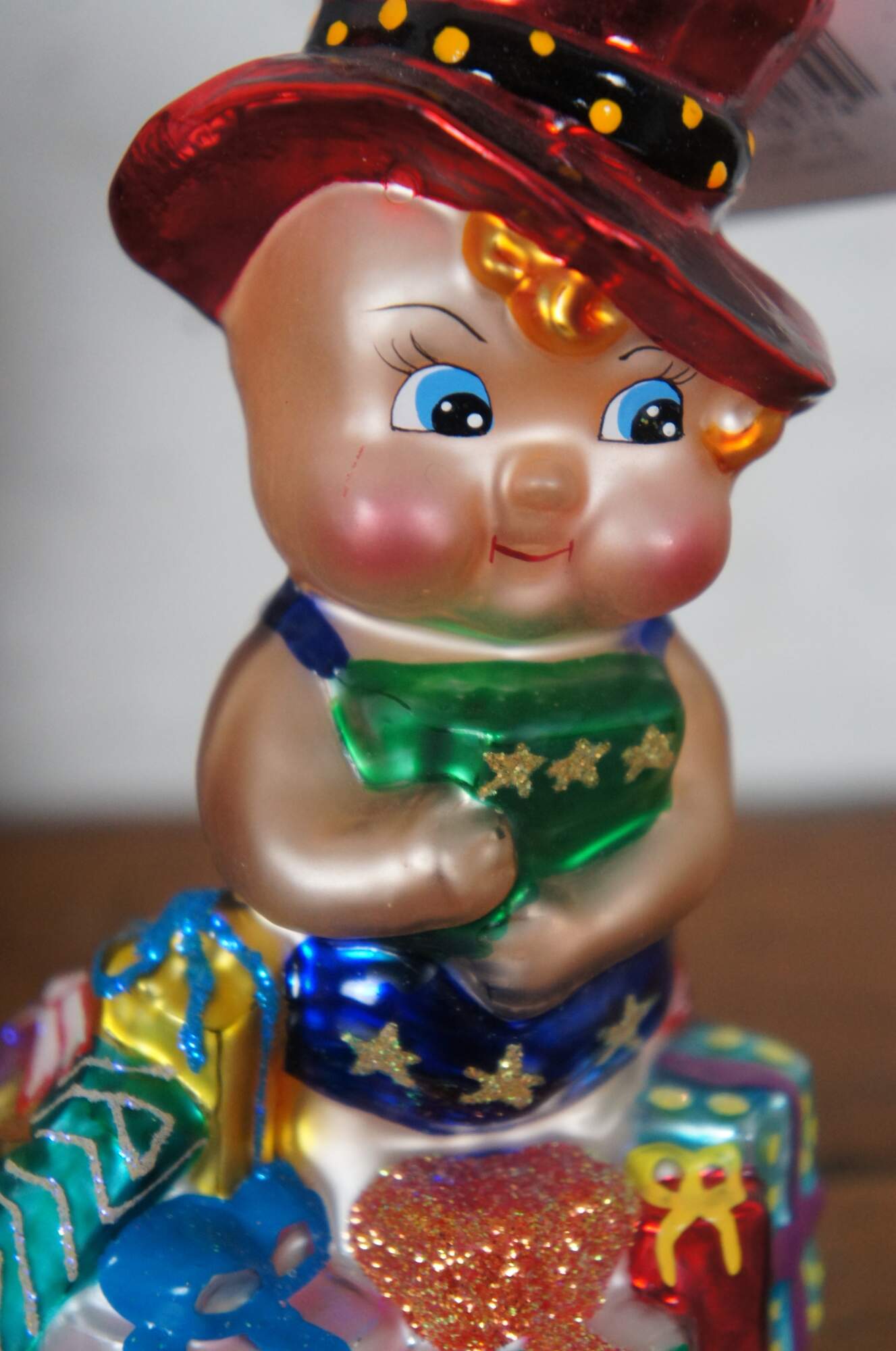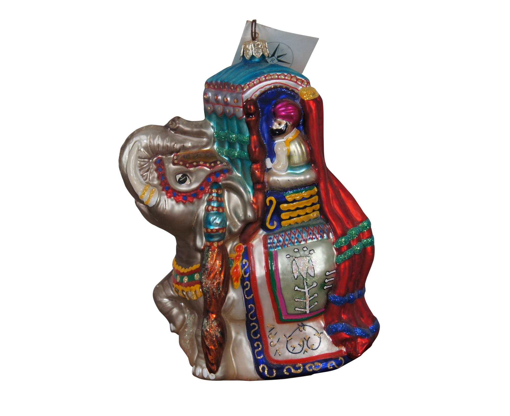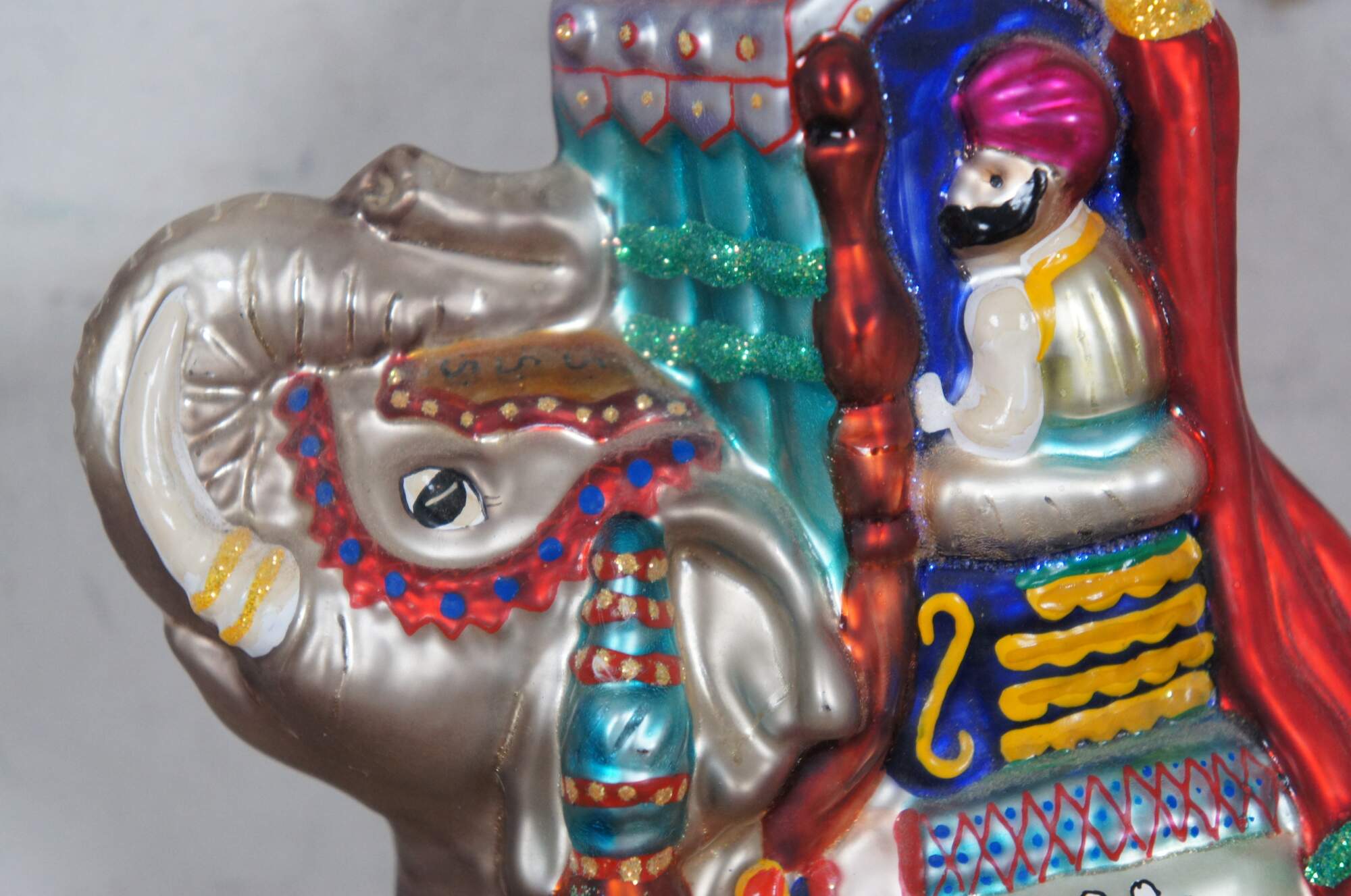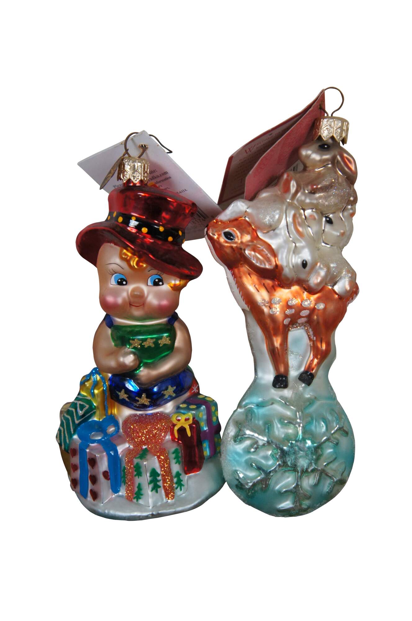 Lot of three late 20th century Christopher Radko for Starad, Inc blown glass, hand painted Christmas / holiday ornaments - Woodland Winds Balancing Act Jr (99-924-0), Sultan's Pride (99-105-0), and 2000 Pediatric Cancer Charities Gift of Health (00-SP-73). Includes original tags. Made in Poland.
