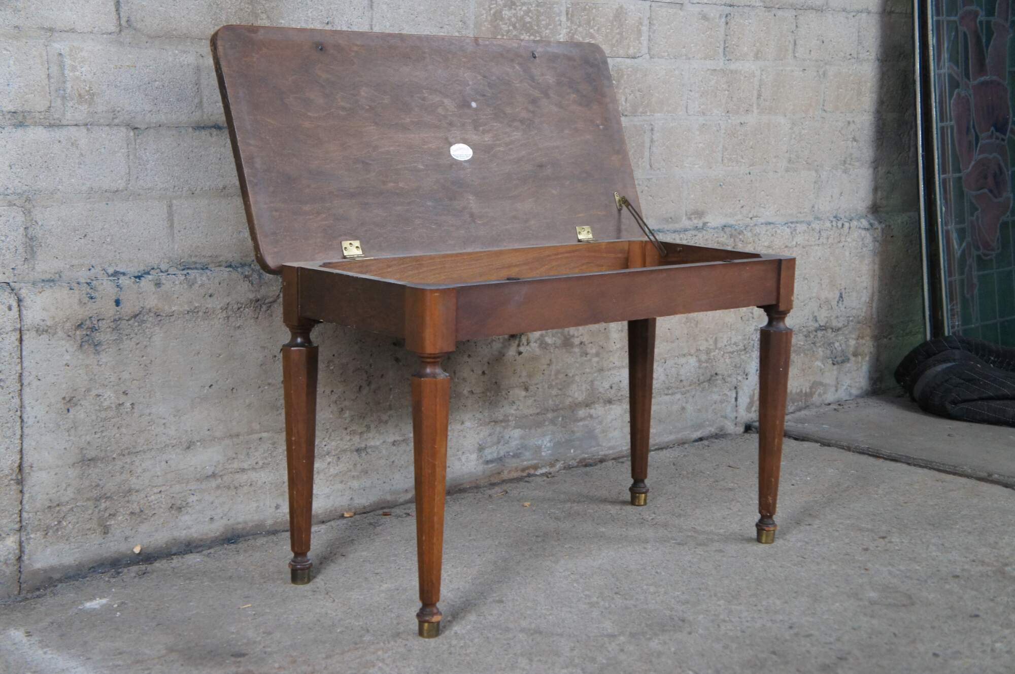 Vintage Piano Bench by Tonkbench of Chicago, Illinois, circa 1940s. Features a walnut frame with Matchbook veneered top. The lid of the bench lifts up for storage of sheet music. Legs octagonal shaped and tapered to a brass foot.