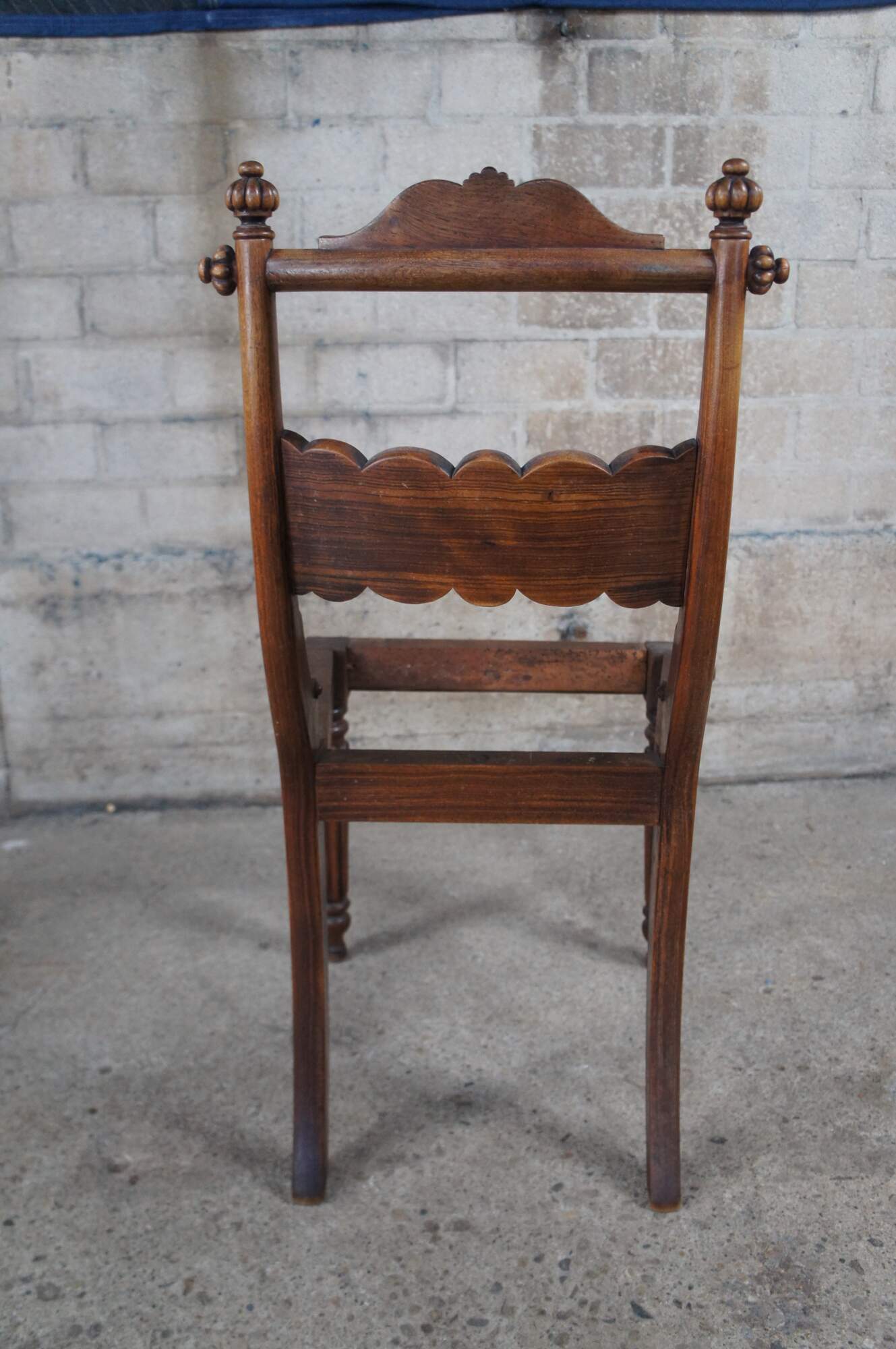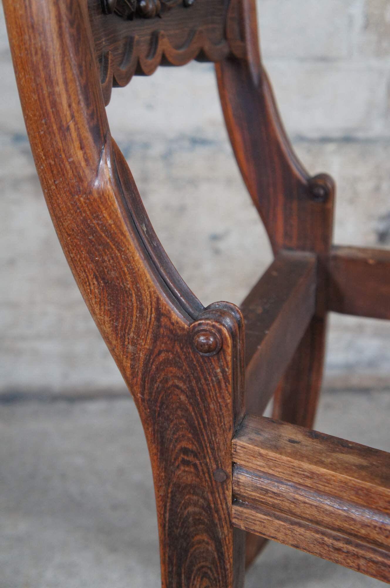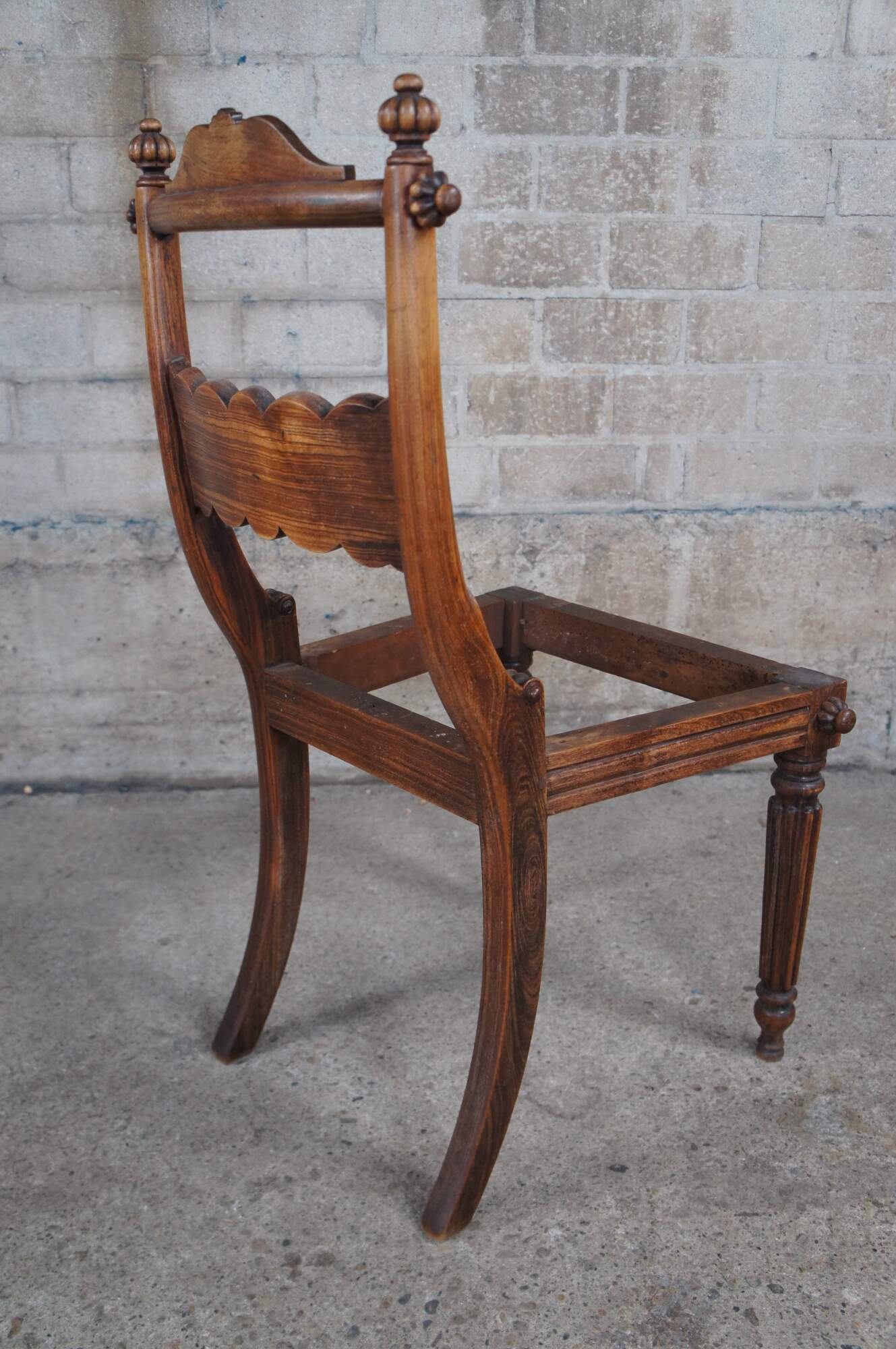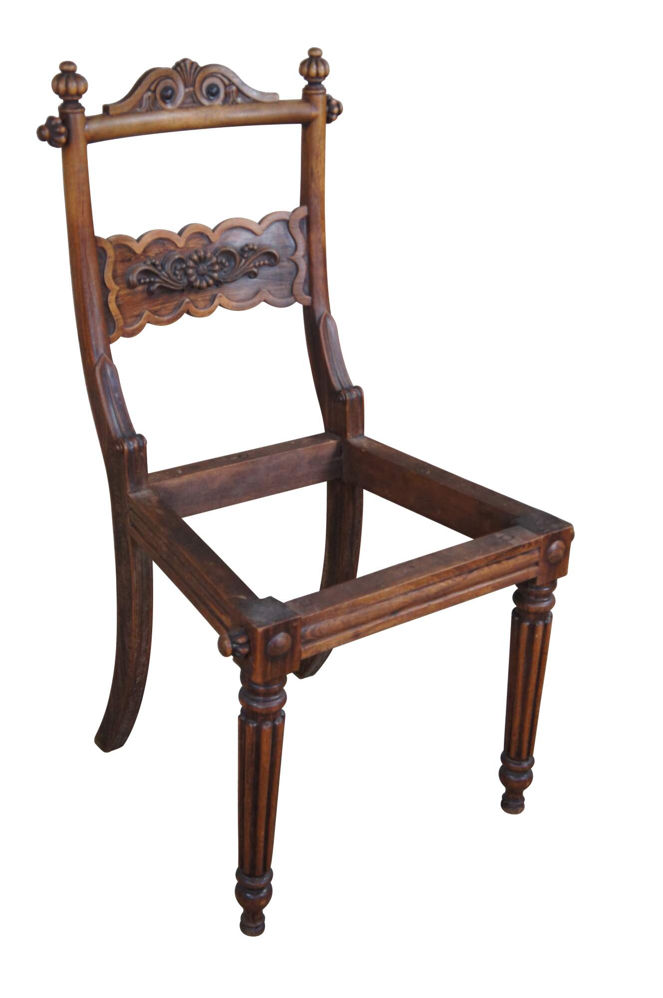 Impressive pair of English Regency side chairs, circa 1820. Constructed from rosewood with intricately carved crest rails and backs. The chairs are supported by reeded legs leading to an arrow foot along the front and saber legs the rear.