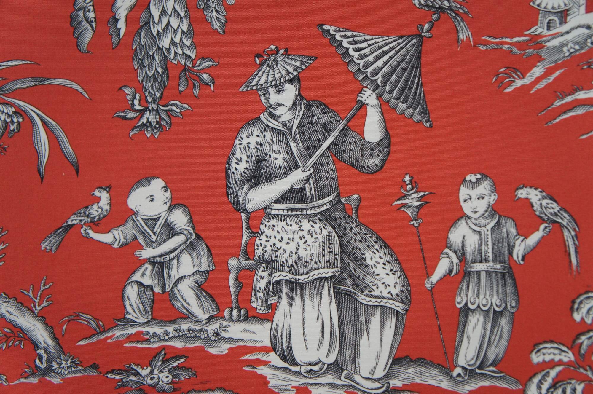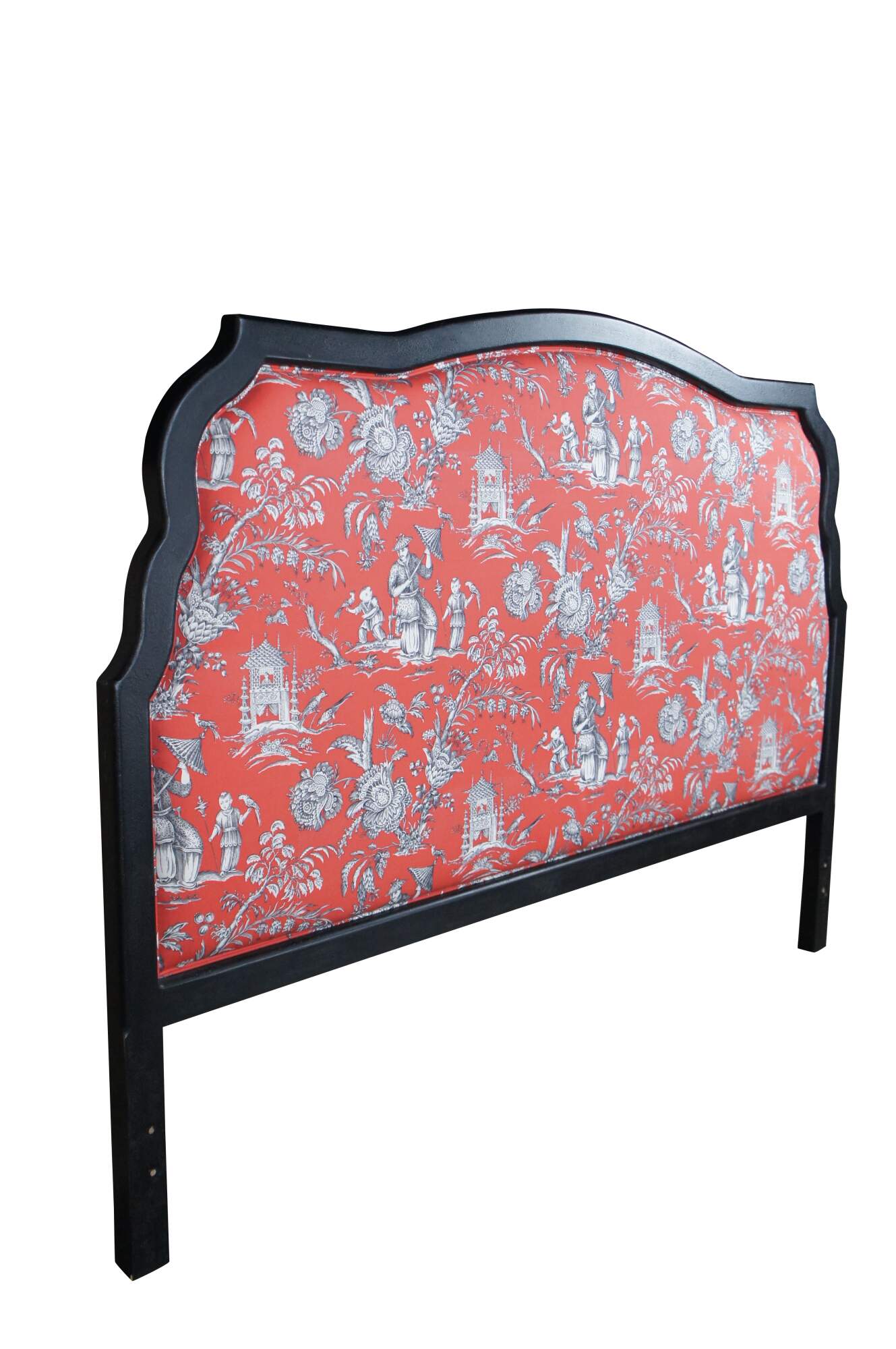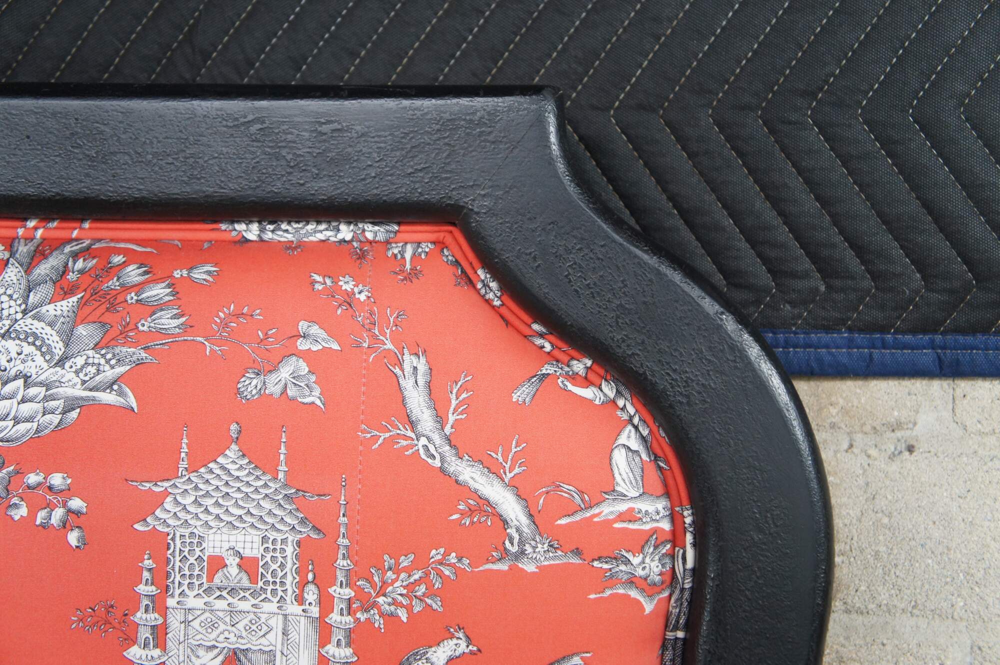 A beautifully ebonized bed frame with upholstered chinoiserie scene from the Amy Howard Collection. Features a nice shape with serpentine formed shoulders. The central scene showcases a red background covered by traditional Chinese / Japanese elements with Geishas, Pagodas, Figures, Pheasants and chrysanthemums. Labeled along the backside.