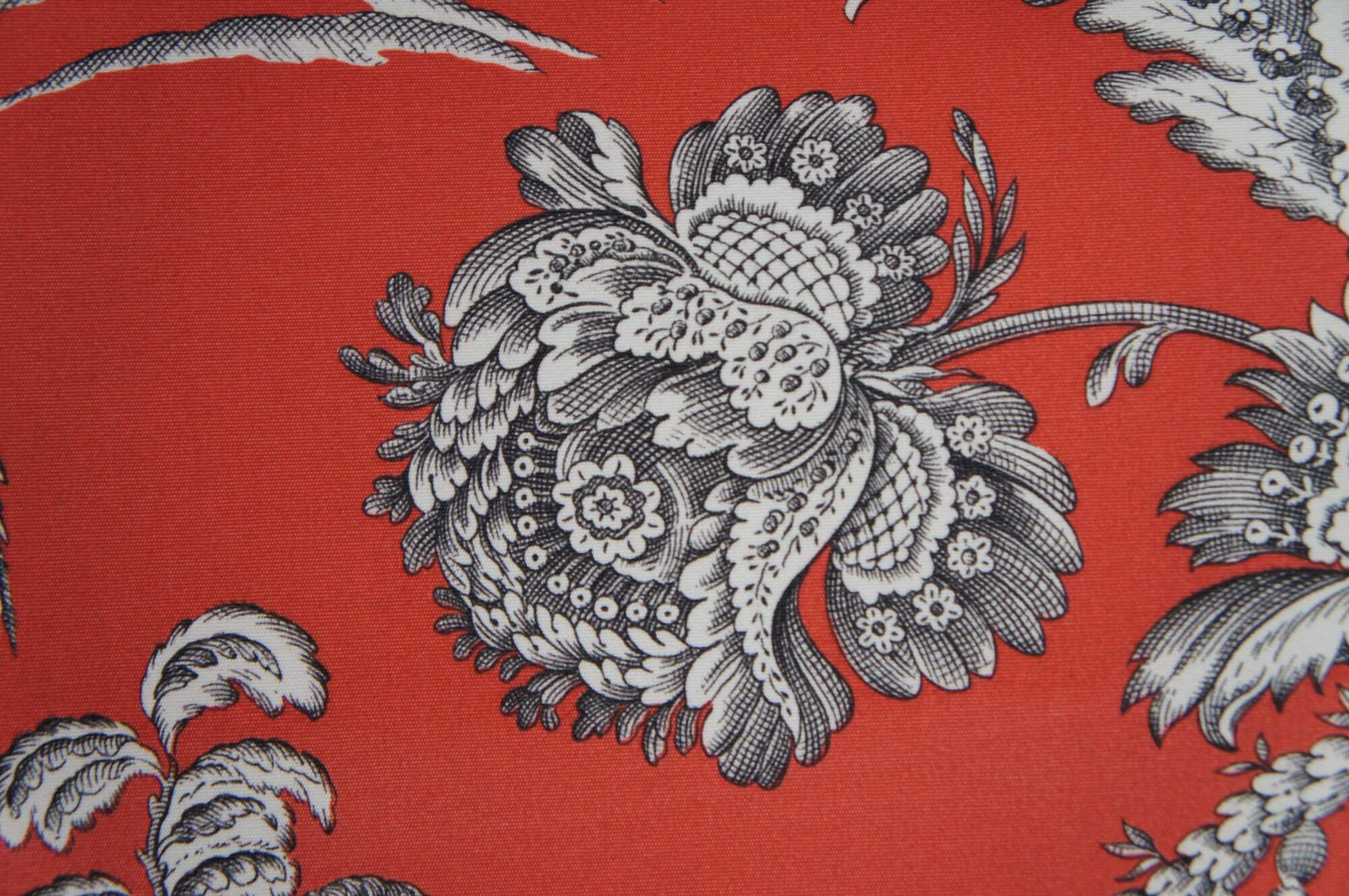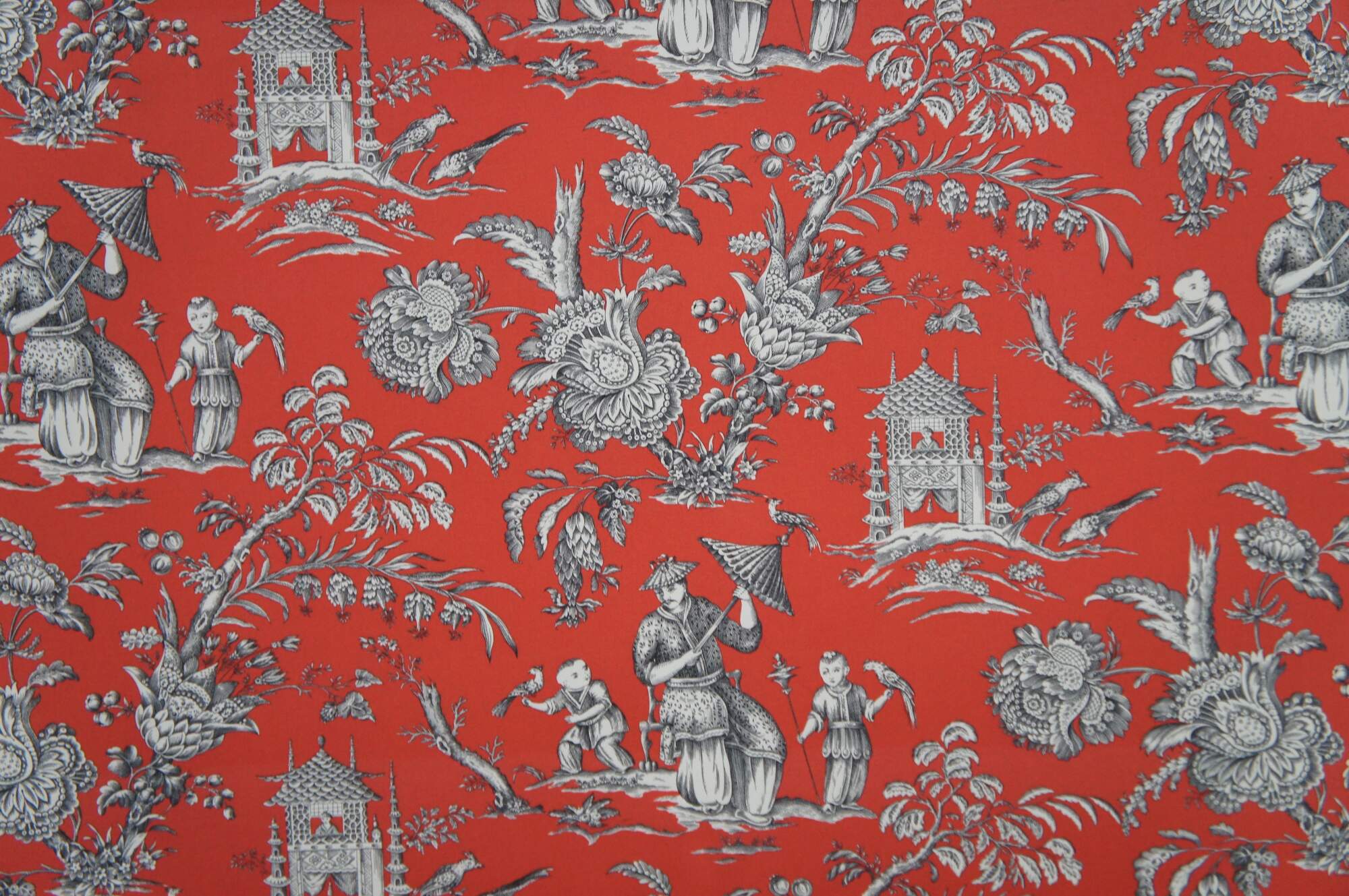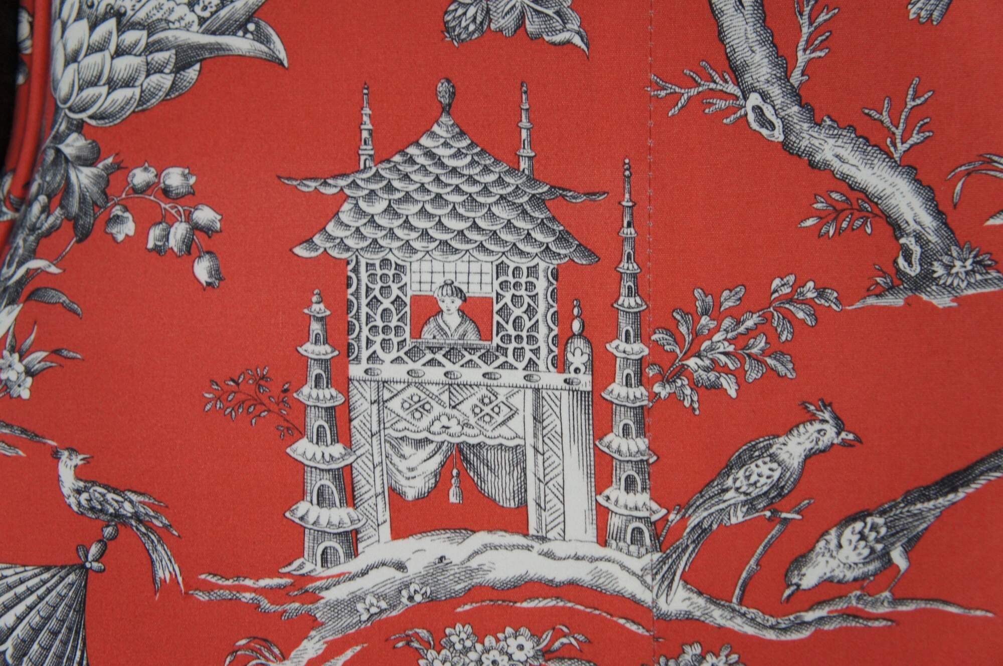 A beautifully ebonized bed frame with upholstered chinoiserie scene from the Amy Howard Collection. Features a nice shape with serpentine formed shoulders. The central scene showcases a red background covered by traditional Chinese / Japanese elements with Geishas, Pagodas, Figures, Pheasants and chrysanthemums. Labeled along the backside.
