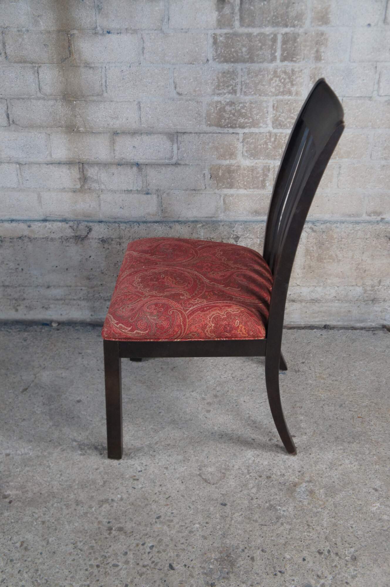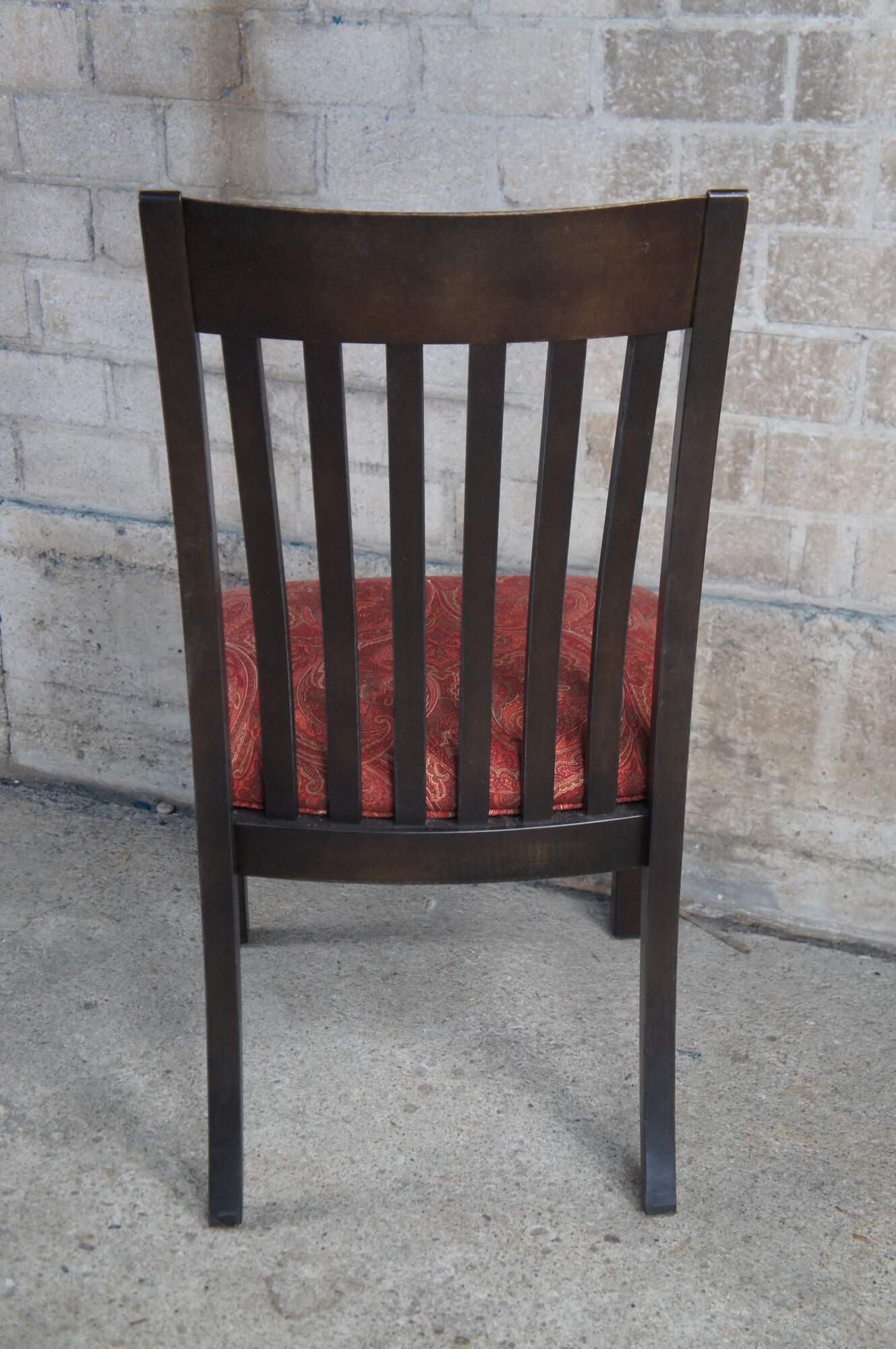 4 Ethan Allen American Artisan Dining Chairs #22-6002. Features a dark maple finish with slat back and red paisley upholstered seats.