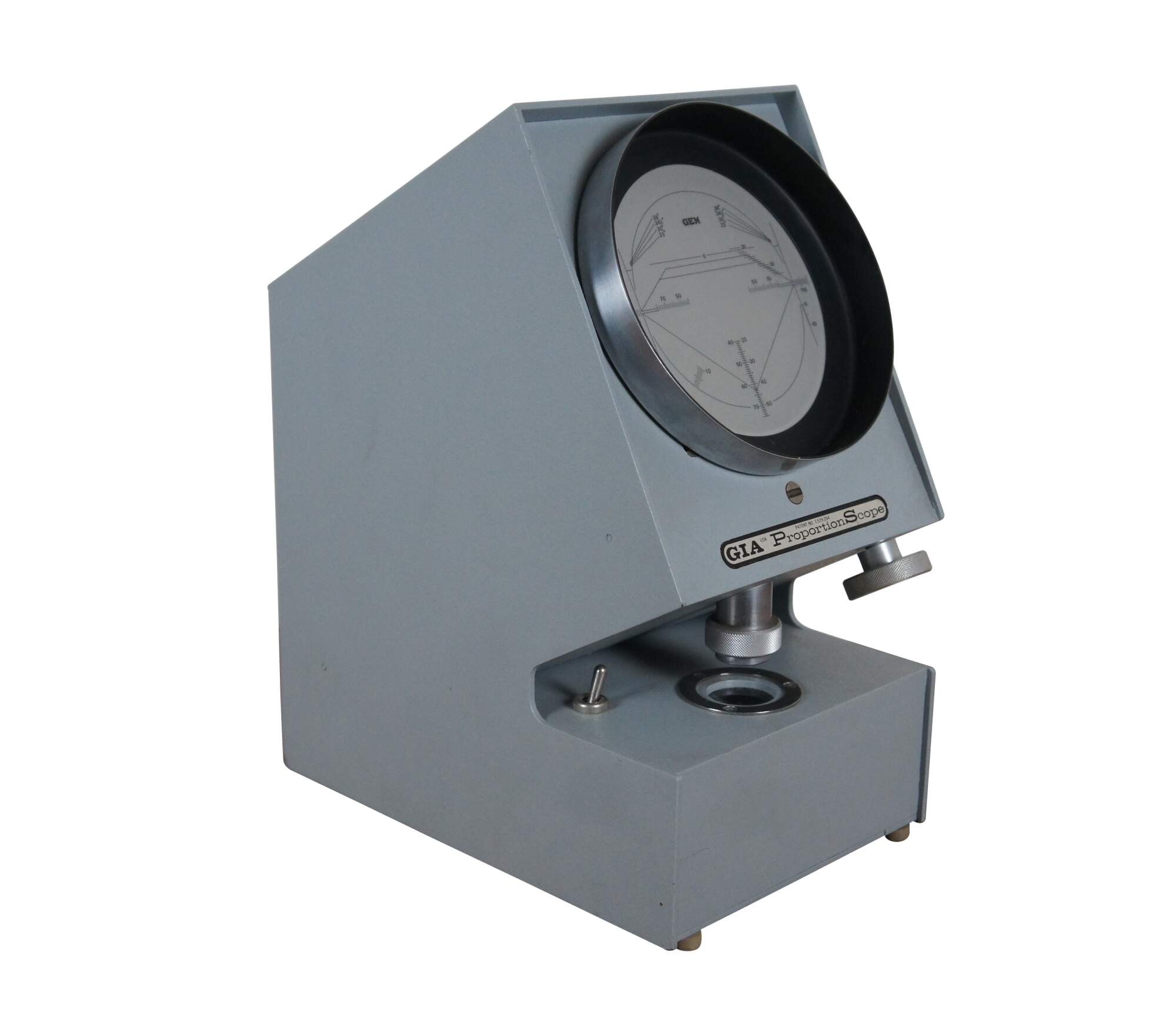 Vintage late 20th century Gemological Institute of America (GIA) jeweler's Proportion Scope Gemmological Instrument - used to assess / compare the proportions of a gemstone relative to ideal standards. Includes three round magnetic screens, gem holder / vise, and instruction book.